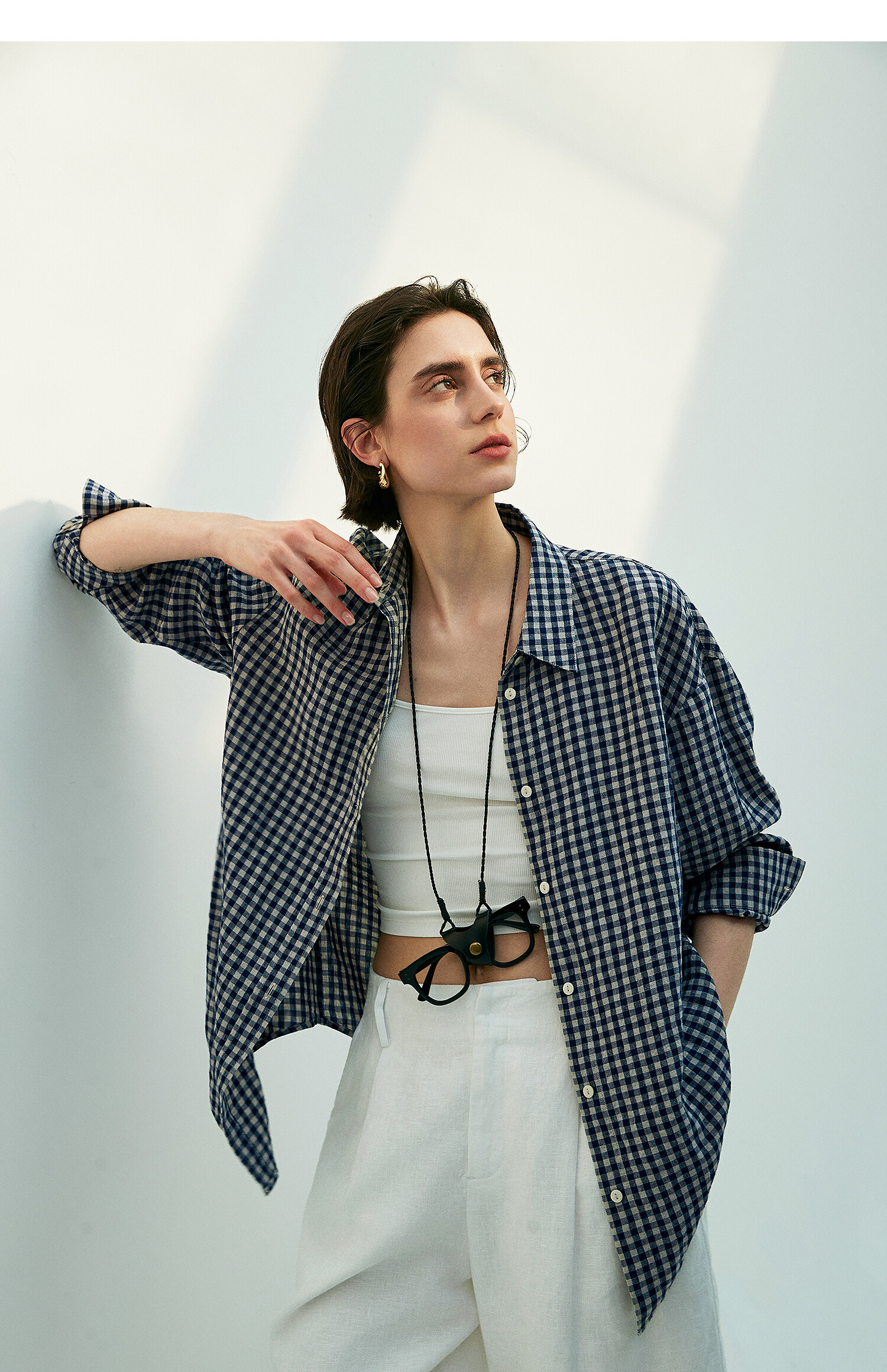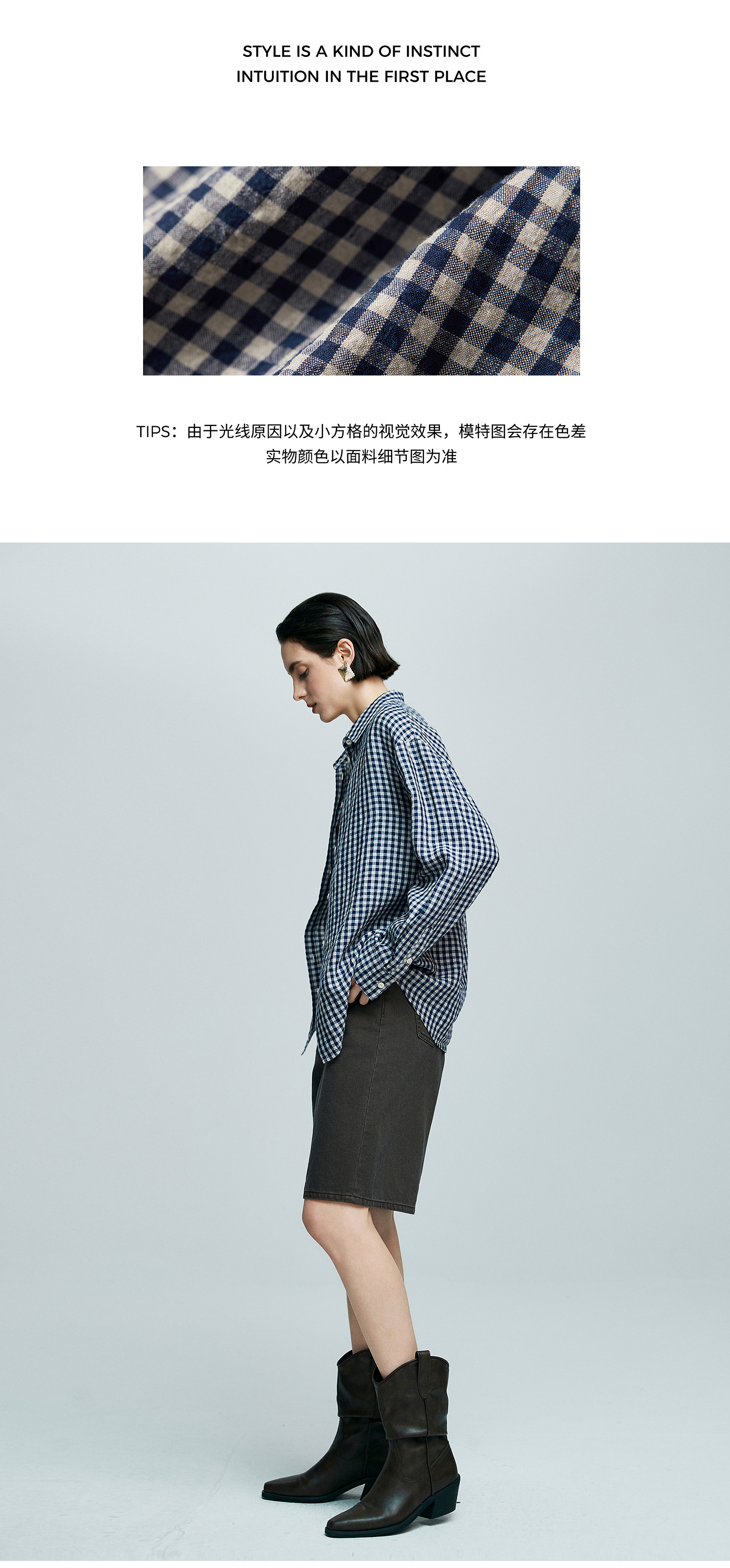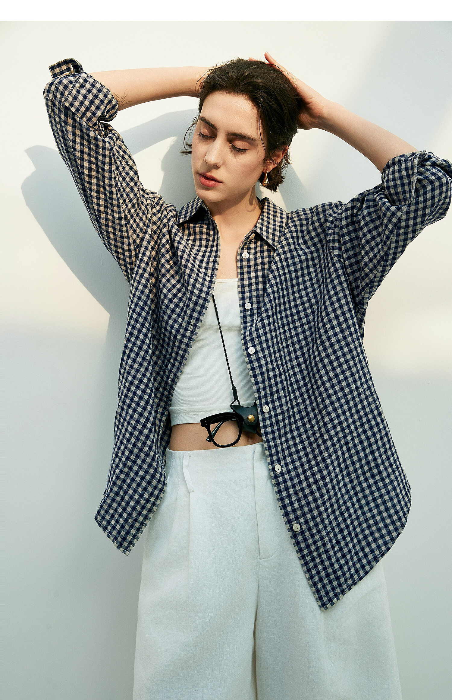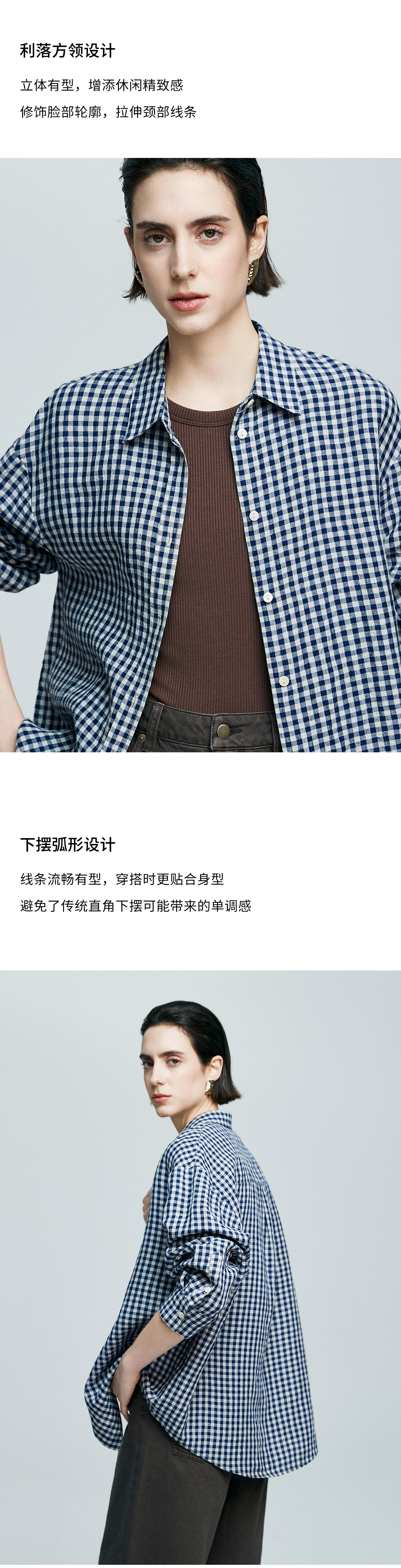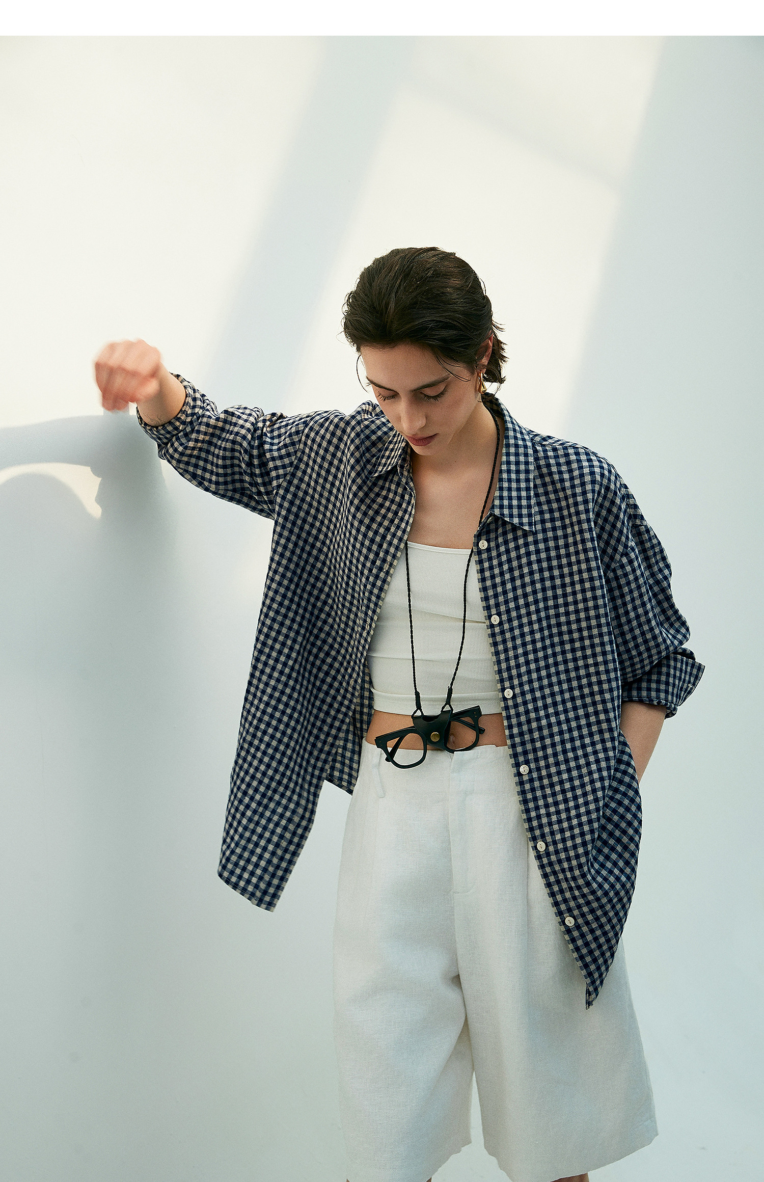 棉仓362604041-初棉亚麻色织格纹方领宽松藏青白格子衬衫
