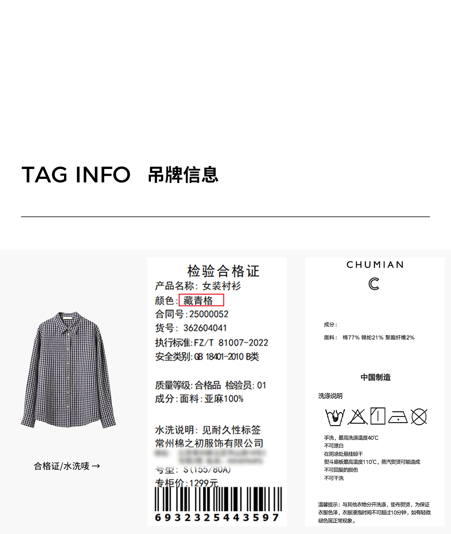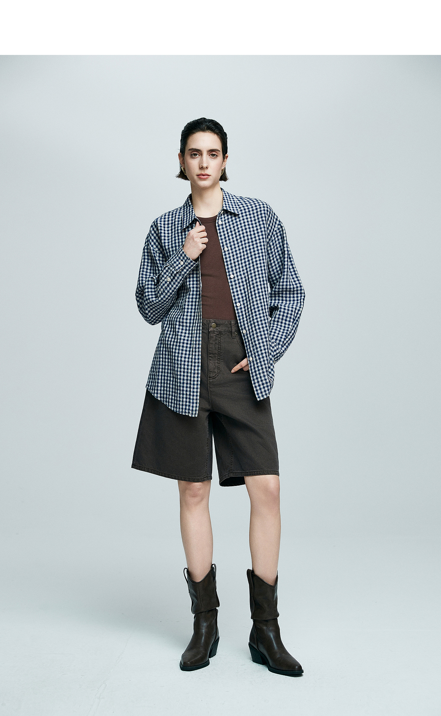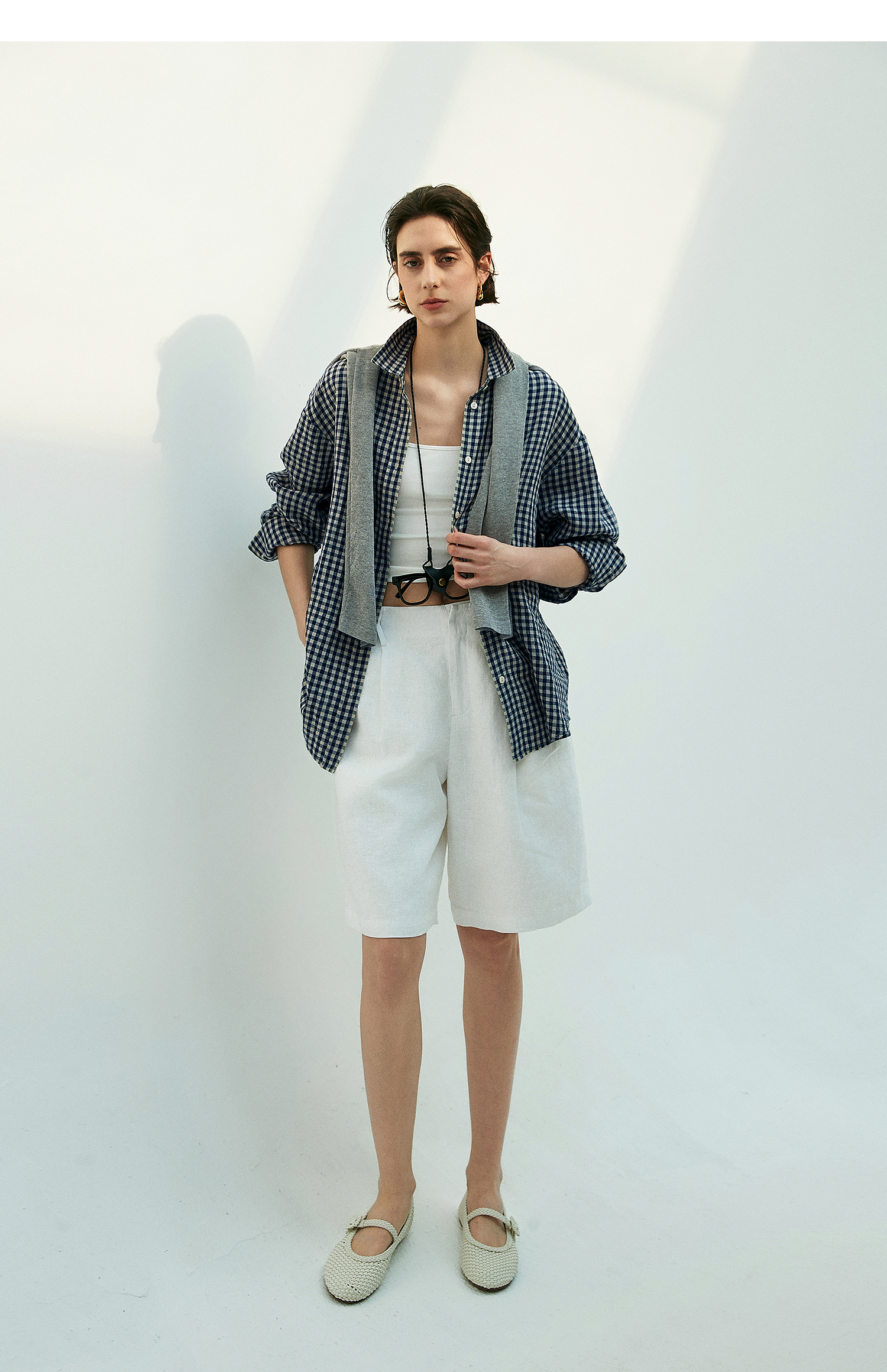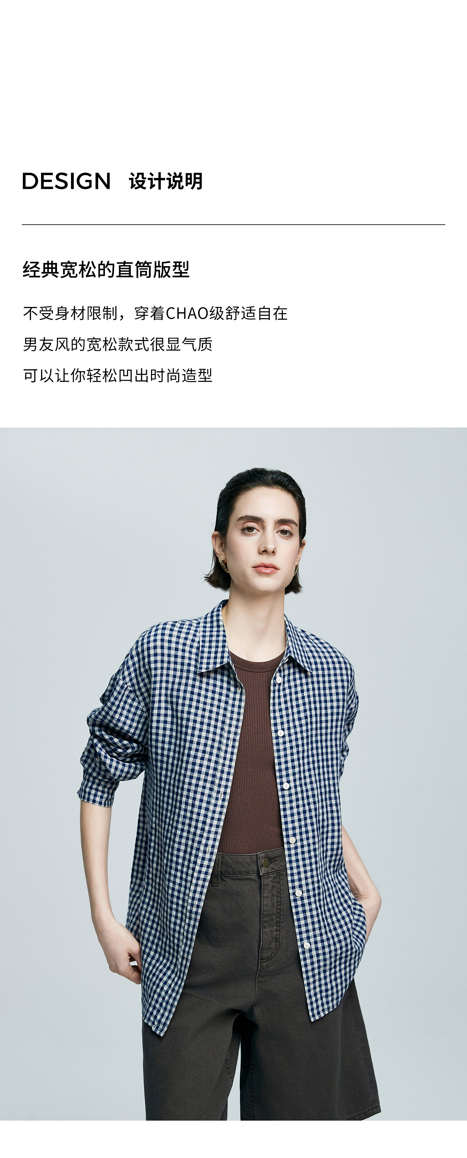 棉仓362604041-初棉亚麻色织格纹方领宽松藏青白格子衬衫