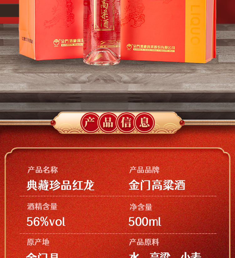 台湾金门高粱酒 典藏珍品红龙 0.5L-56度 2瓶 6瓶整箱装