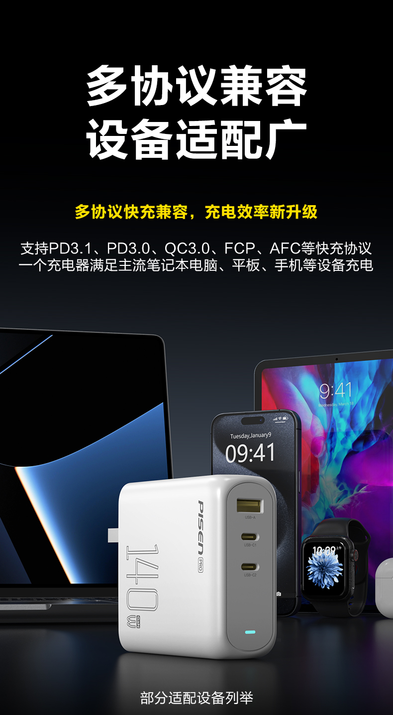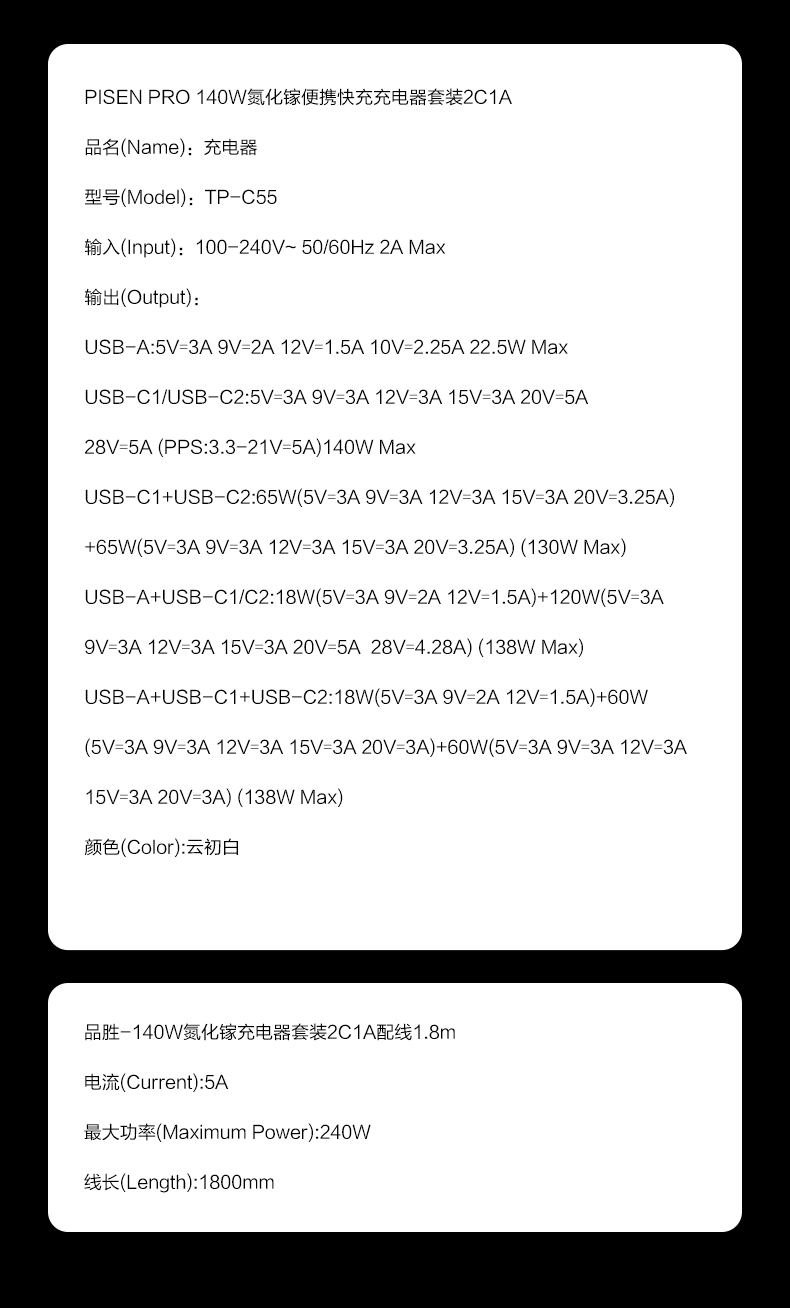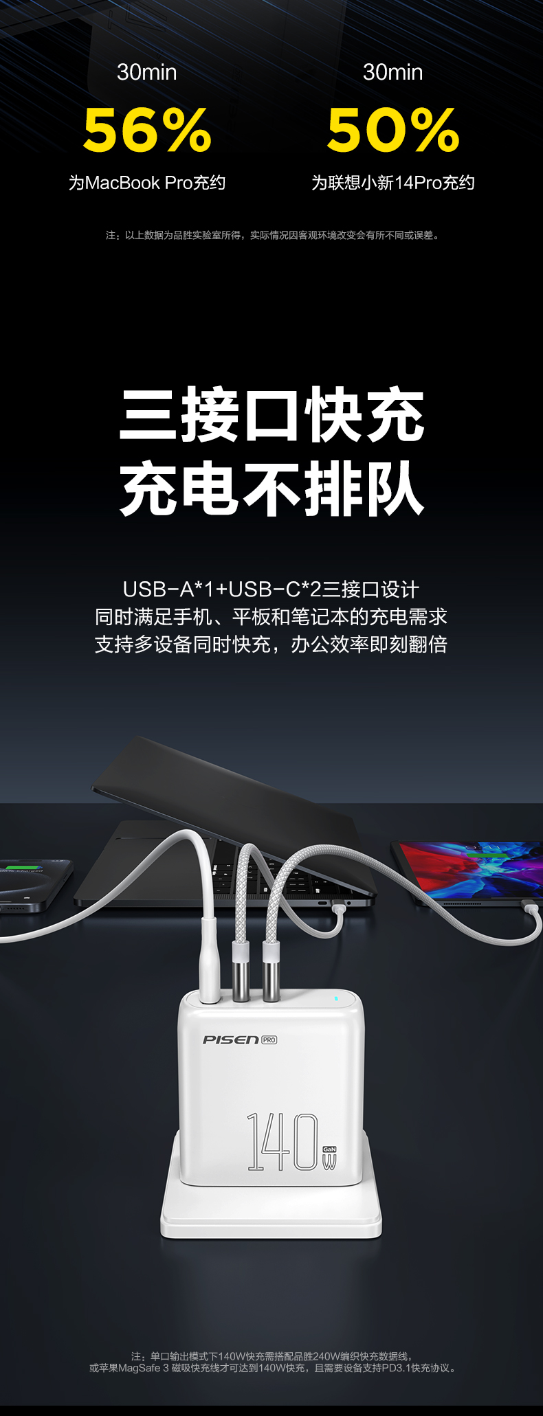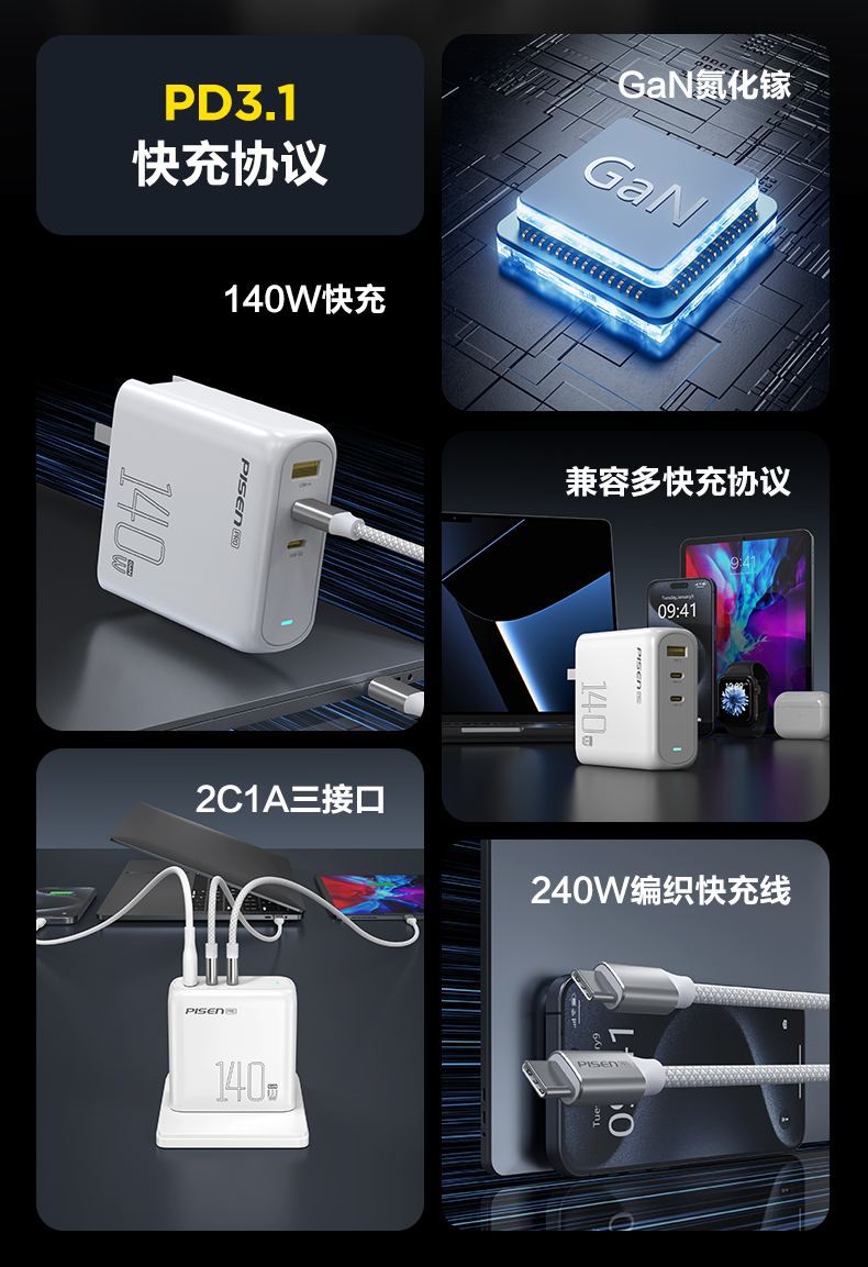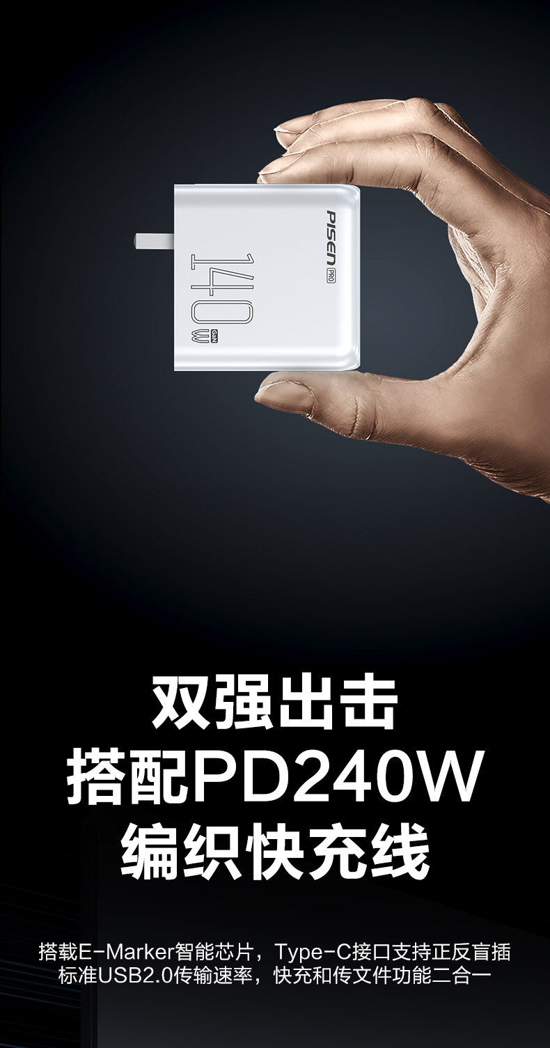 品胜 140W氮化镓便携快充充电器套装2C1A 快充 搭配双C头快充数据线套装 笔记本充电头