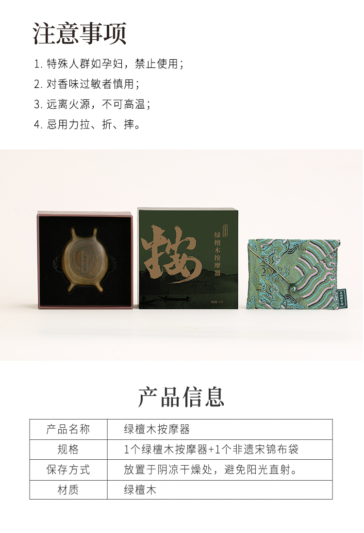 【品名】“配赠宋锦材质布袋”正安国 绿檀木按摩器 全身通用 大圆齿设计 【规格】 1个绿檀木按摩器+1个非遗宋锦布袋 【产地】国内 【发货包装】独立包装 【发货地】广东 【发货快递】圆通、中通随机发 【补邮费地区】新疆、西藏、青海+15元 【发货时效】48-72小时,周末节假日顺延 |