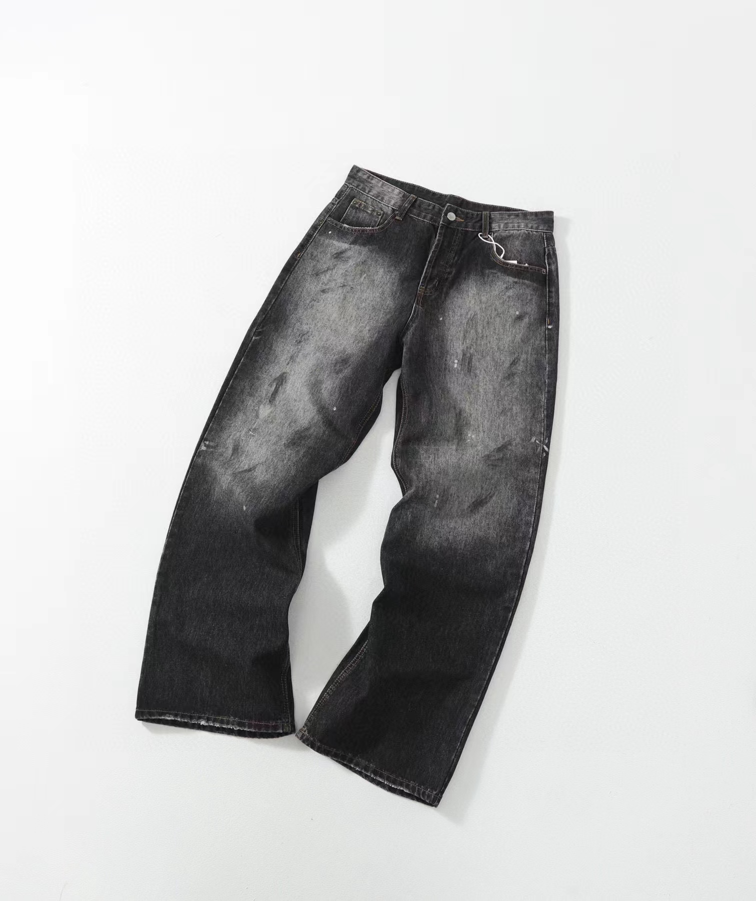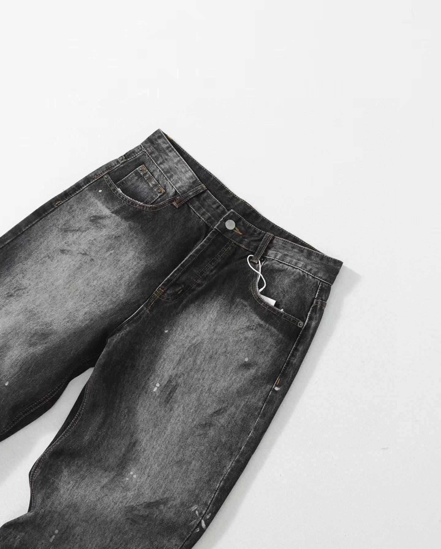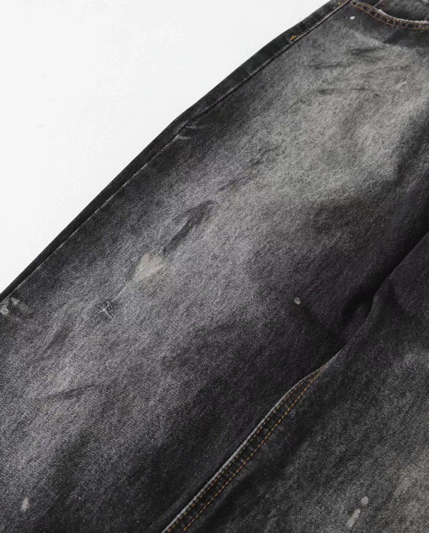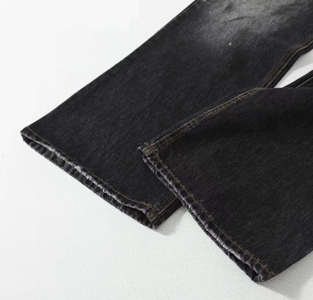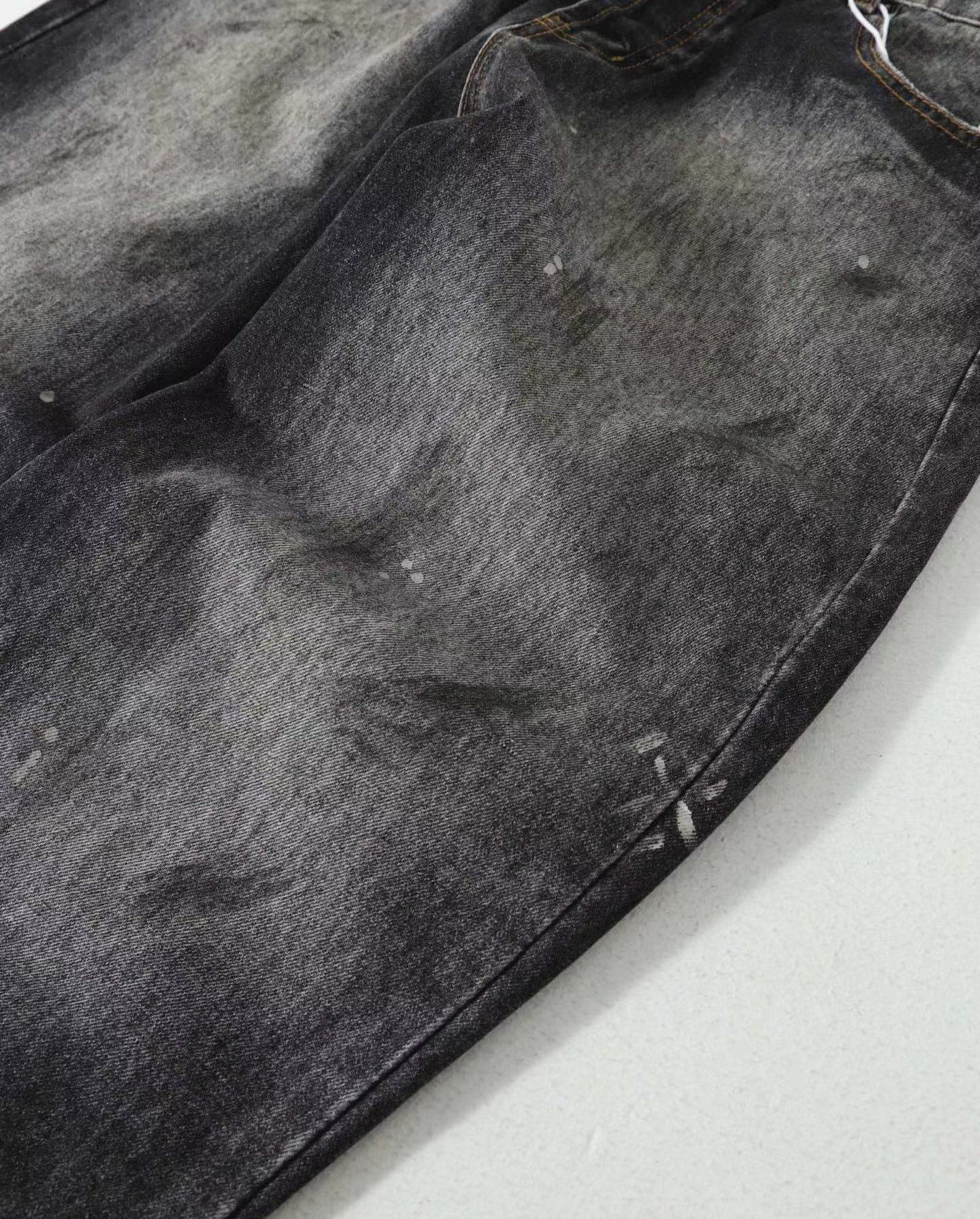 泼墨涂鸦复古水洗做旧微喇牛仔裤 男女同款,直筒立挺版型,成衣水洗做旧炒色喷马骝打造的渐变灰茶色,手工泼墨涂鸦,脚口做旧破坏,潮咖男女上身帅爆了!定织高支高密12.5盎司的竹节牛仔布,面料纹理自然,多次定位炒褪色,局部喷马骝,相对于其他颜色黑灰水洗更加质感浓郁,经过重重复杂工艺,整体质感并不硬厚,上身效果立体且亲肤。水洗后专业老师傅代工手绘,全部手工定位泼墨点缀,裤型包容度高,无论腿部粗细都能修饰,偏微喇版型,在臀围、腰围的细节裁剪上接近合身但又有轻微余量,上身立挺显瘦显腿长。