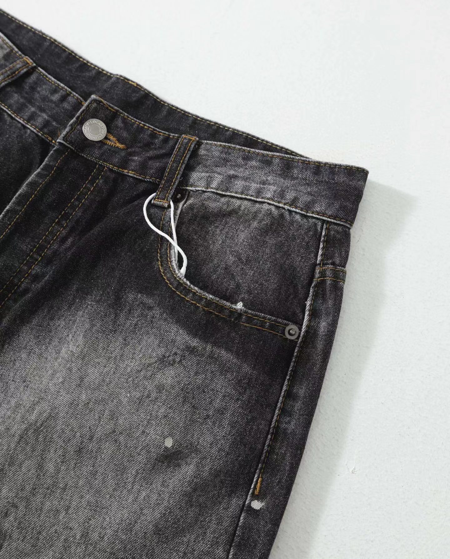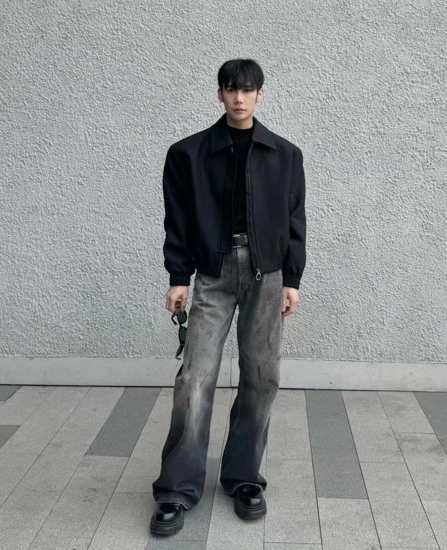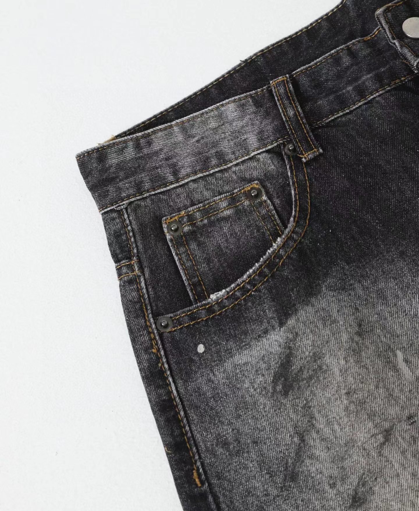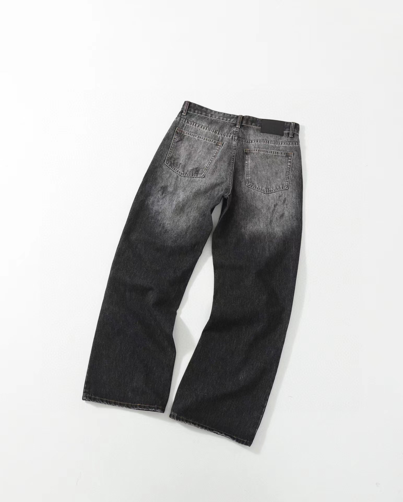 泼墨涂鸦复古水洗做旧微喇牛仔裤 男女同款,直筒立挺版型,成衣水洗做旧炒色喷马骝打造的渐变灰茶色,手工泼墨涂鸦,脚口做旧破坏,潮咖男女上身帅爆了!定织高支高密12.5盎司的竹节牛仔布,面料纹理自然,多次定位炒褪色,局部喷马骝,相对于其他颜色黑灰水洗更加质感浓郁,经过重重复杂工艺,整体质感并不硬厚,上身效果立体且亲肤。水洗后专业老师傅代工手绘,全部手工定位泼墨点缀,裤型包容度高,无论腿部粗细都能修饰,偏微喇版型,在臀围、腰围的细节裁剪上接近合身但又有轻微余量,上身立挺显瘦显腿长。