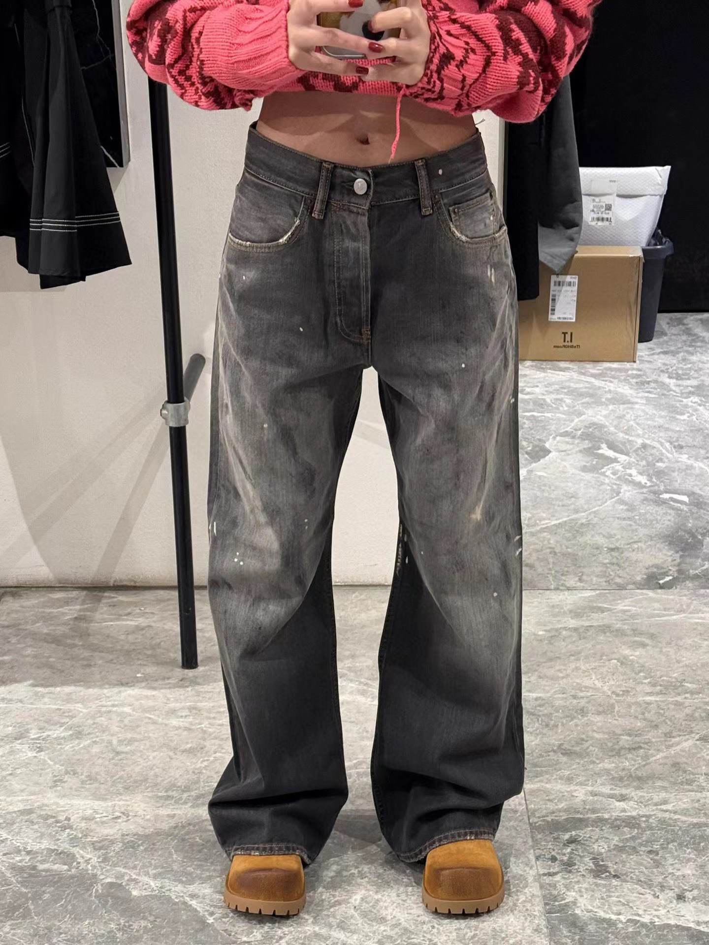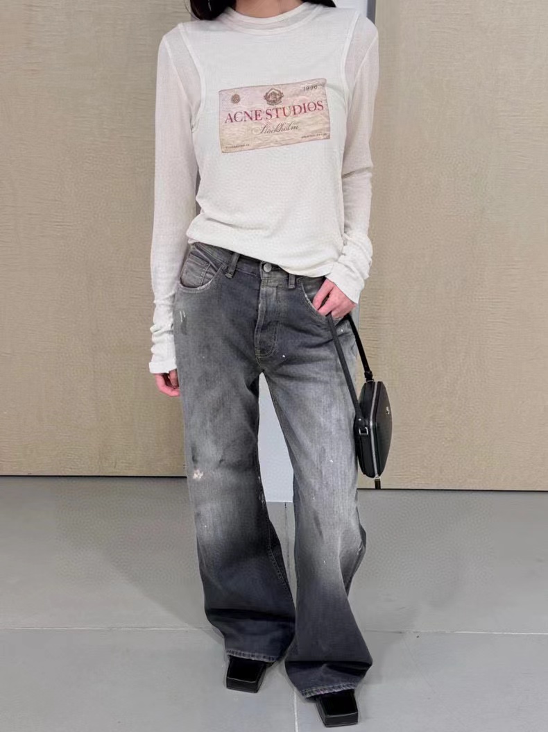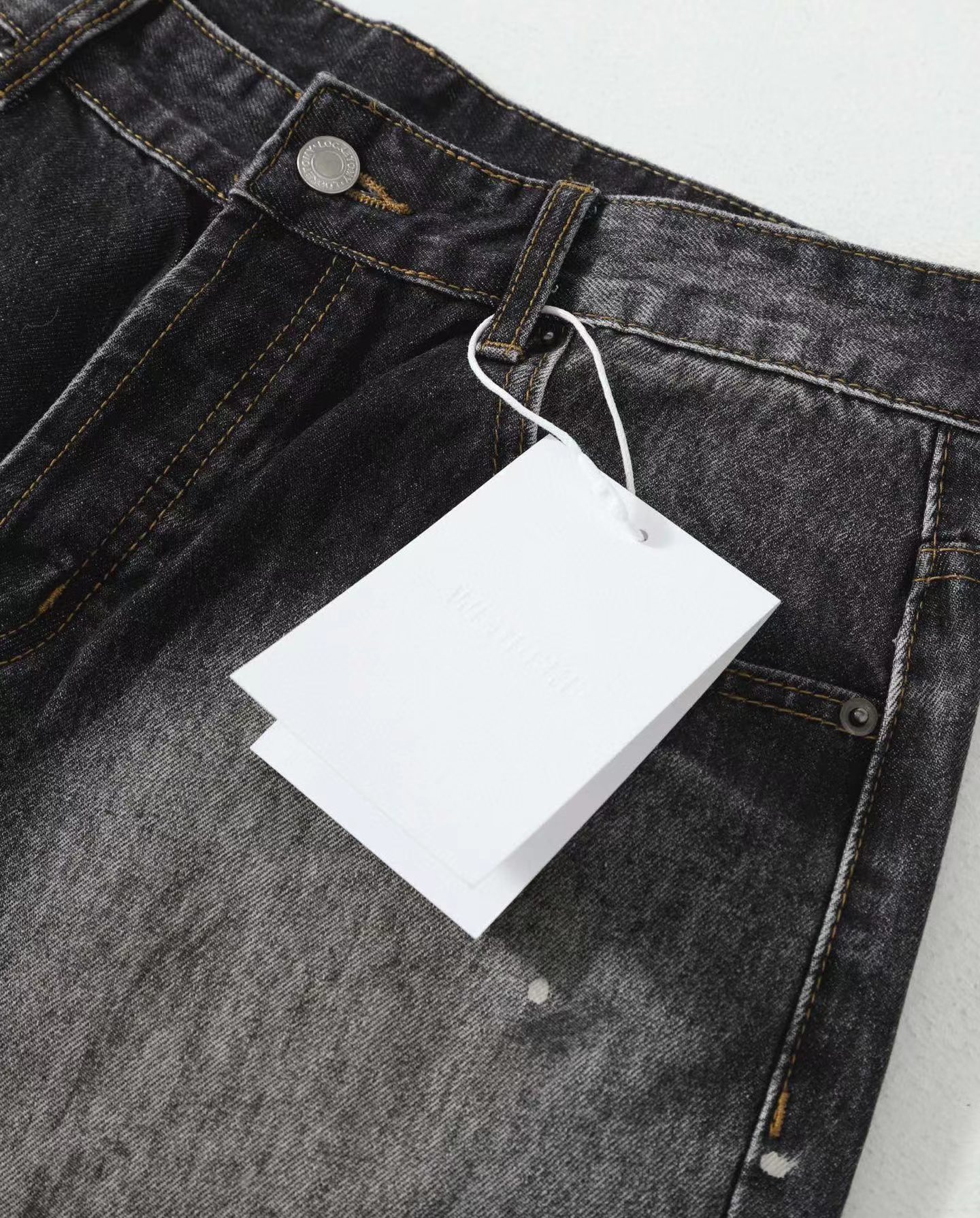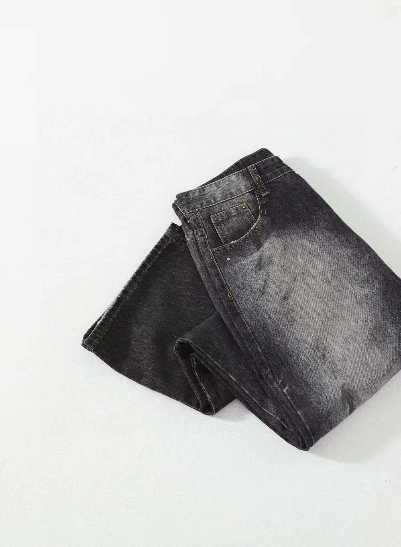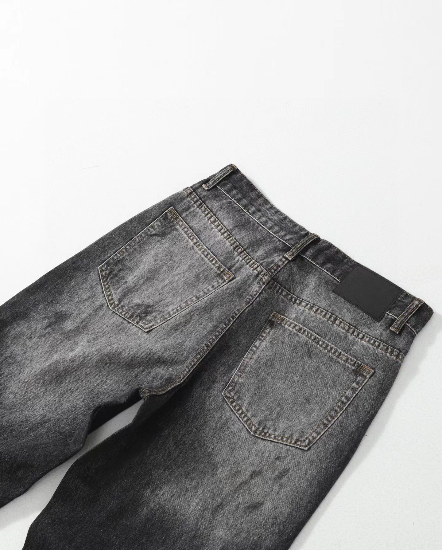 泼墨涂鸦复古水洗做旧微喇牛仔裤 男女同款,直筒立挺版型,成衣水洗做旧炒色喷马骝打造的渐变灰茶色,手工泼墨涂鸦,脚口做旧破坏,潮咖男女上身帅爆了!定织高支高密12.5盎司的竹节牛仔布,面料纹理自然,多次定位炒褪色,局部喷马骝,相对于其他颜色黑灰水洗更加质感浓郁,经过重重复杂工艺,整体质感并不硬厚,上身效果立体且亲肤。水洗后专业老师傅代工手绘,全部手工定位泼墨点缀,裤型包容度高,无论腿部粗细都能修饰,偏微喇版型,在臀围、腰围的细节裁剪上接近合身但又有轻微余量,上身立挺显瘦显腿长。