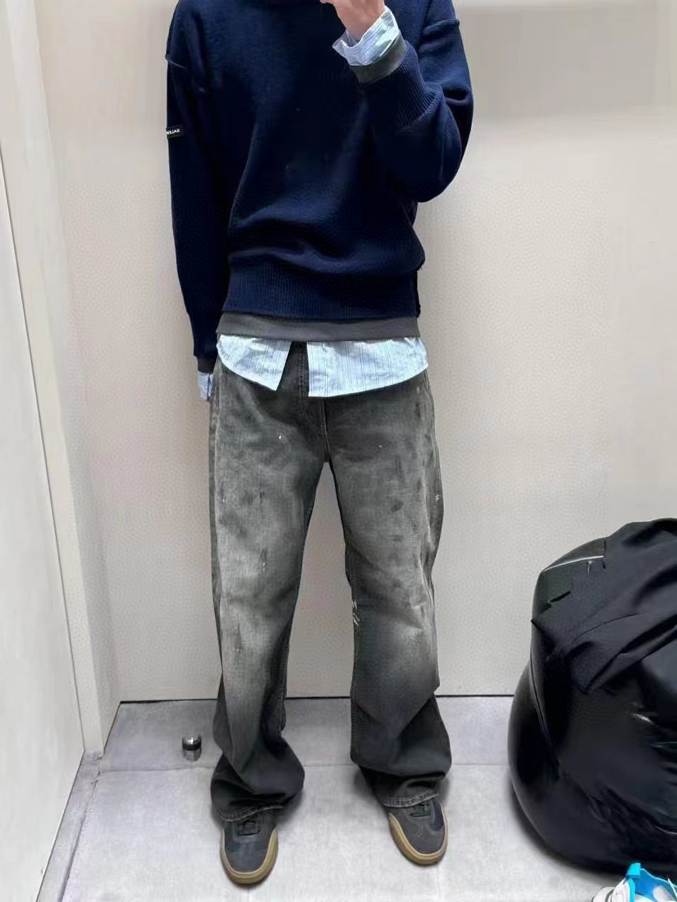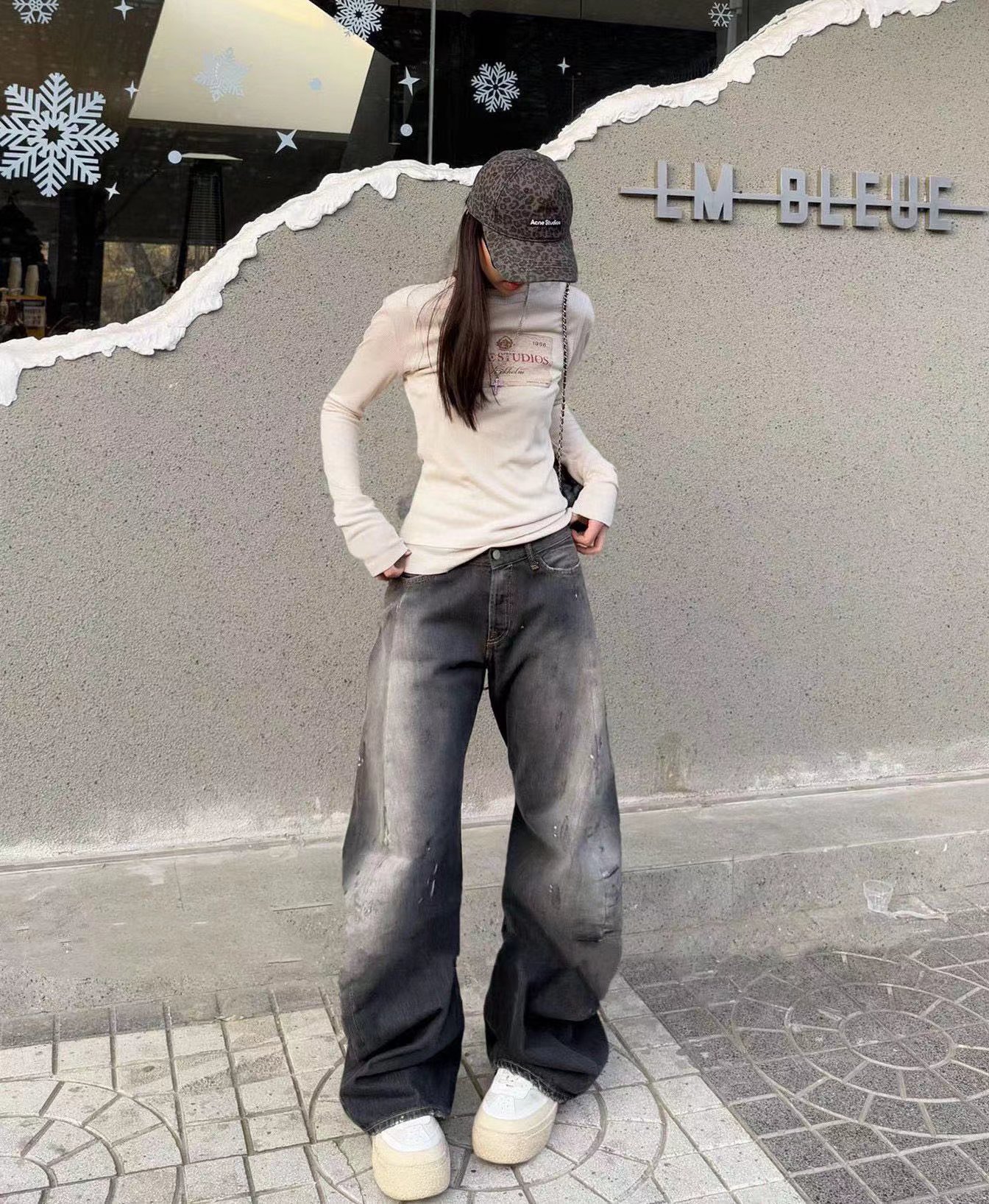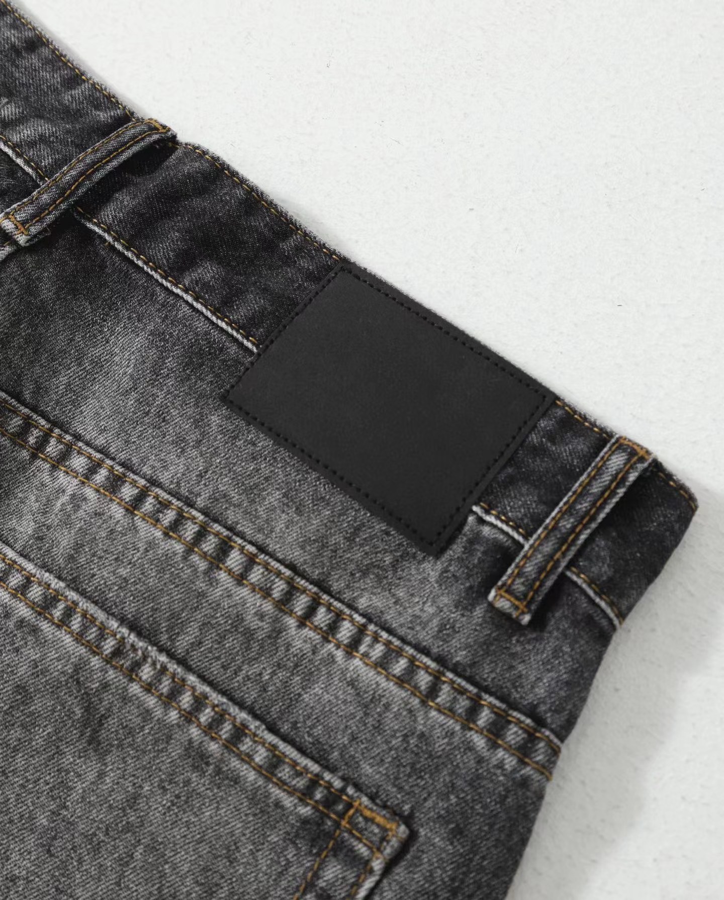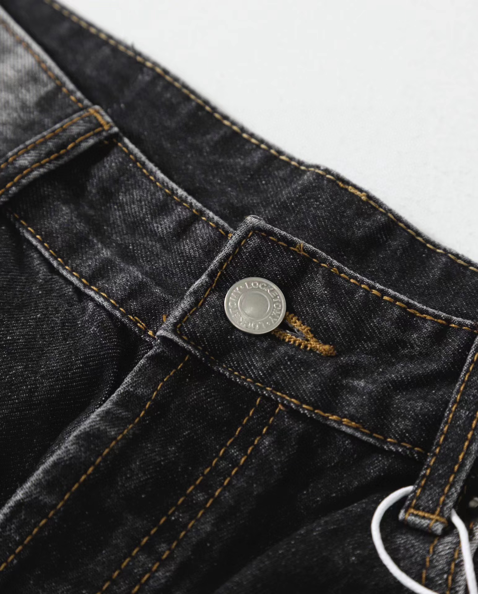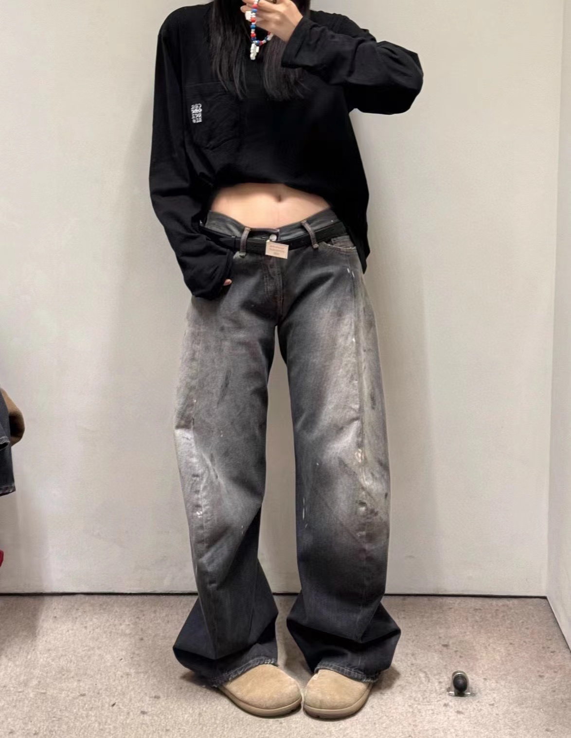 泼墨涂鸦复古水洗做旧微喇牛仔裤 男女同款,直筒立挺版型,成衣水洗做旧炒色喷马骝打造的渐变灰茶色,手工泼墨涂鸦,脚口做旧破坏,潮咖男女上身帅爆了!定织高支高密12.5盎司的竹节牛仔布,面料纹理自然,多次定位炒褪色,局部喷马骝,相对于其他颜色黑灰水洗更加质感浓郁,经过重重复杂工艺,整体质感并不硬厚,上身效果立体且亲肤。水洗后专业老师傅代工手绘,全部手工定位泼墨点缀,裤型包容度高,无论腿部粗细都能修饰,偏微喇版型,在臀围、腰围的细节裁剪上接近合身但又有轻微余量,上身立挺显瘦显腿长。