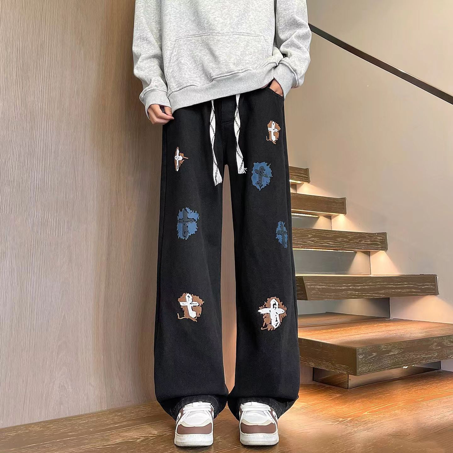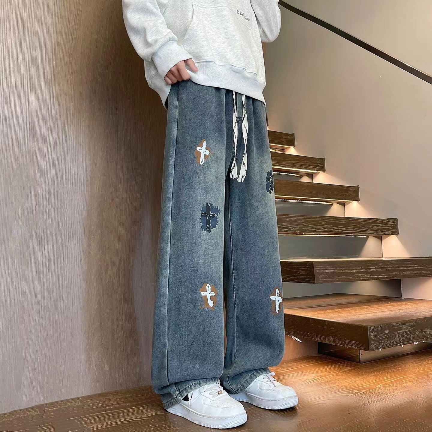 新款十字架直筒水洗牛仔裤宽松休闲长裤,闺蜜情侣出街bi备,优选破卡面料 ,3D立体版型适配任何身材!体验感出众 ,裤型版型宽松,水洗牛仔裤面料耐磨耐脏,立体裁剪,男生女生都可以穿,也可搭配情侣。