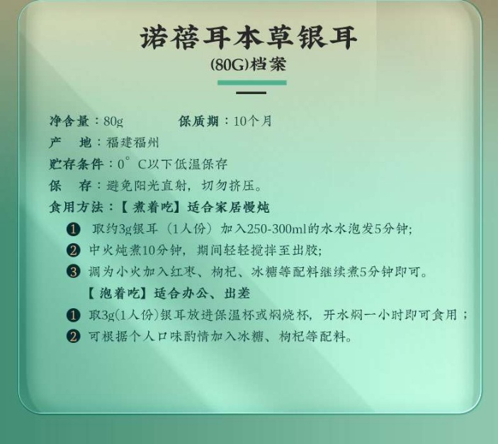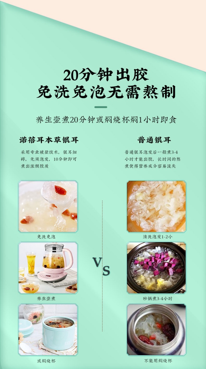 选用了淮山,莲子,土茯苓,枸杞等十几种草本植物培育而成,称为是银耳界的爱马仕,银耳界的白富美。