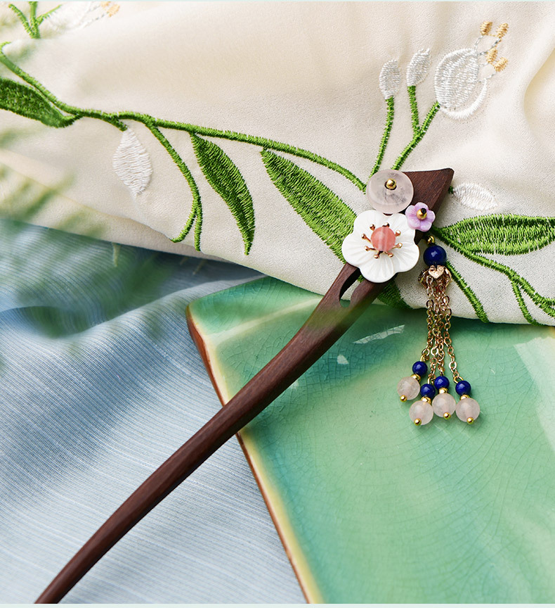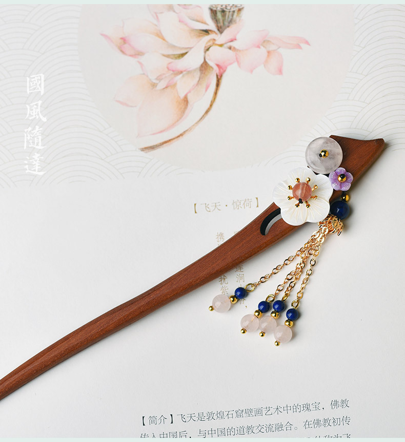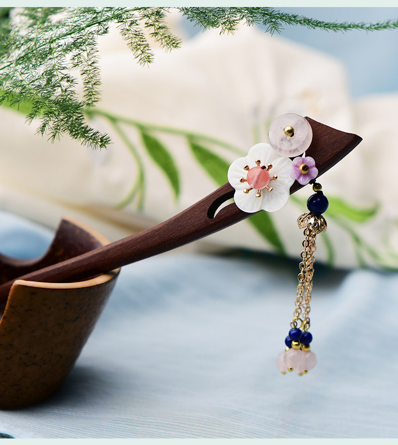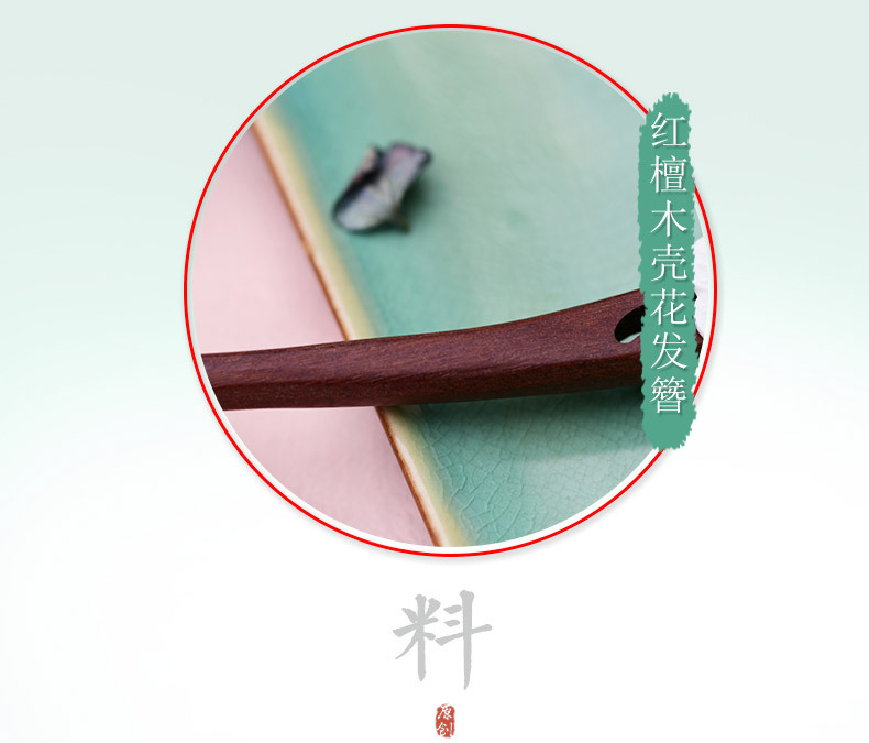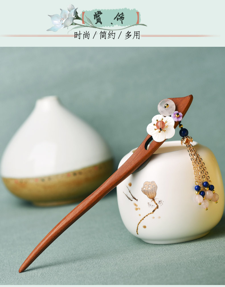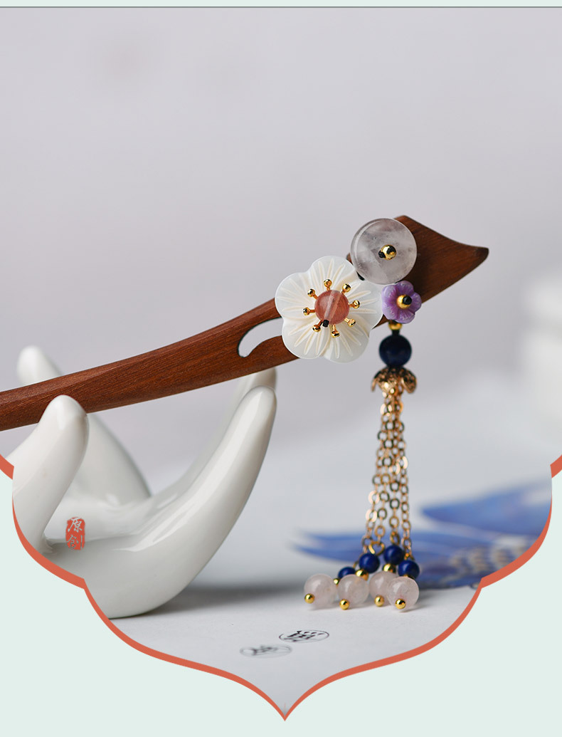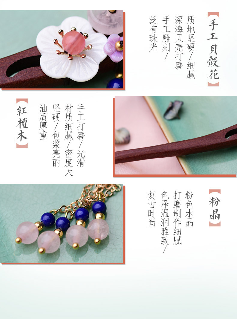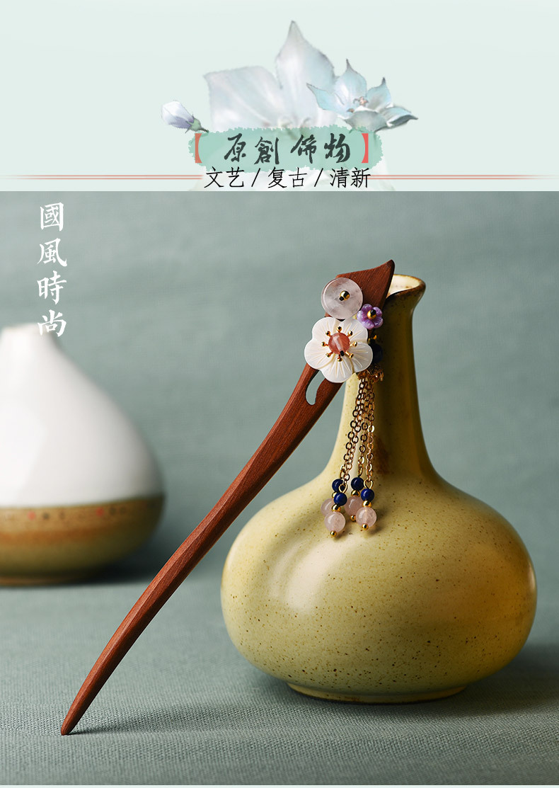 JGL-644257770355原创首饰民族风个性女款红檀木贝壳花粉晶气质发簪