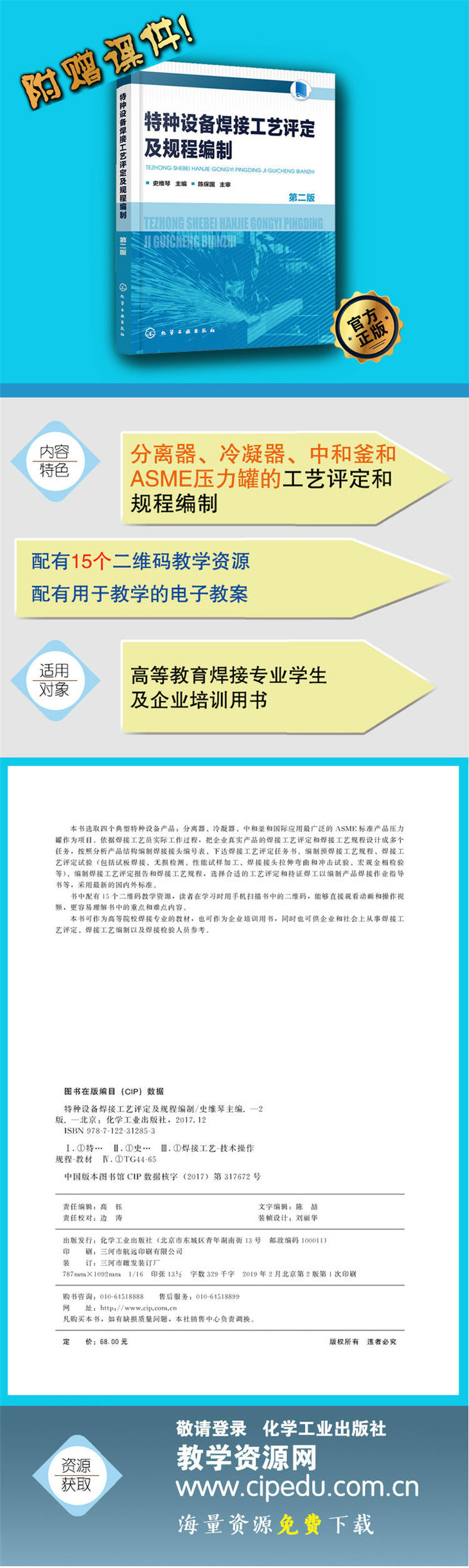 书中还配有15个二维码教学资源,读者在学习时用手机扫描书中的二维码,能够直接观看动画和操作视频,更容易理解书中的重点和难点内容。二维码教学资源分别是M1-1标准椭圆封头的制作(需拼焊)、M1-2筒体的制作(需拼接)、M1-3焊接工艺评定试板的准备、M1-4焊接工艺评定试板焊接、M1-5工艺评定试板射线检测、M1-6工艺评定试样的划线和切割、M1-7工艺评定试样的加工、M1-8工艺评定试样拉伸试验、M1-9工艺评定试样弯曲试验、M1-10工艺评定冲击试样缺口检查、M1-11工艺评定试样冲击试验、M2-1换热管与管板定位焊及胀接、M2-2换热管与管板焊接、M2-3换热管与管板接头渗透检则、M2-4换热管与管板接头金相检验和角厚度测定。