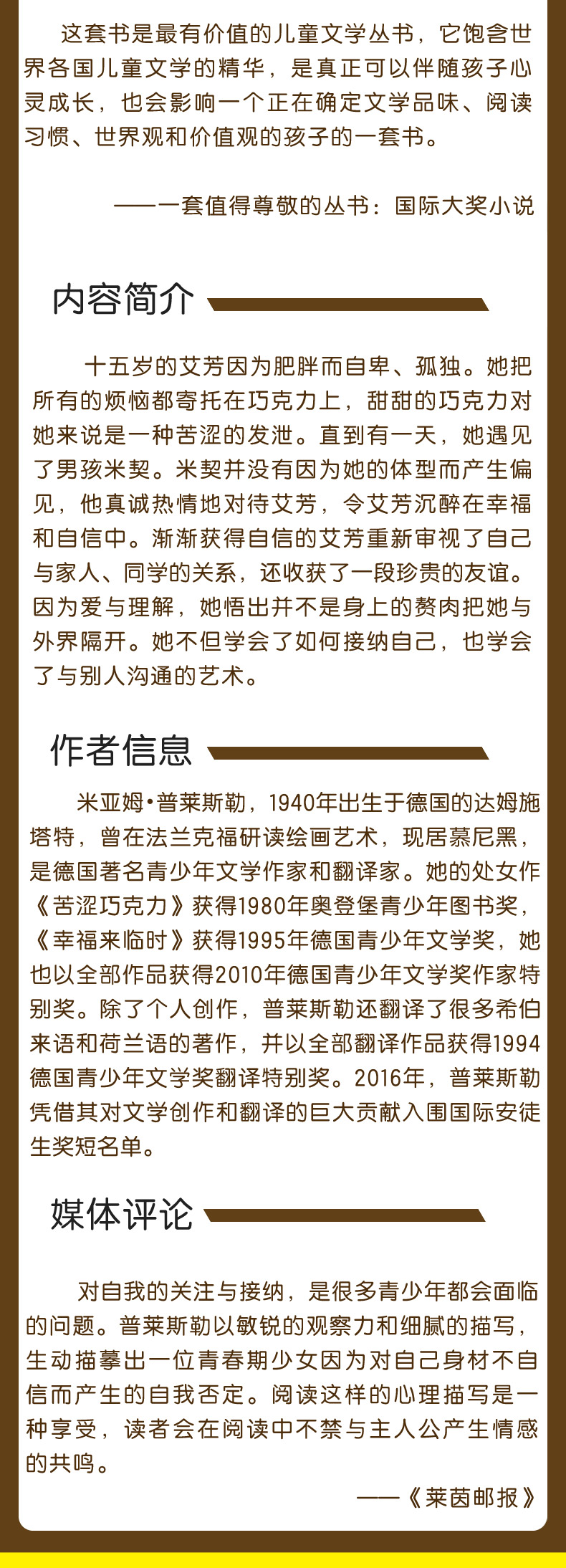 猿辅导专属:国际大奖小说·成长版--苦涩巧克力 国际安徒生奖提名奖,奥登堡青少年图书奖;在友谊与关爱中接纳自己,收获自信;一场与自我和解的成长旅程