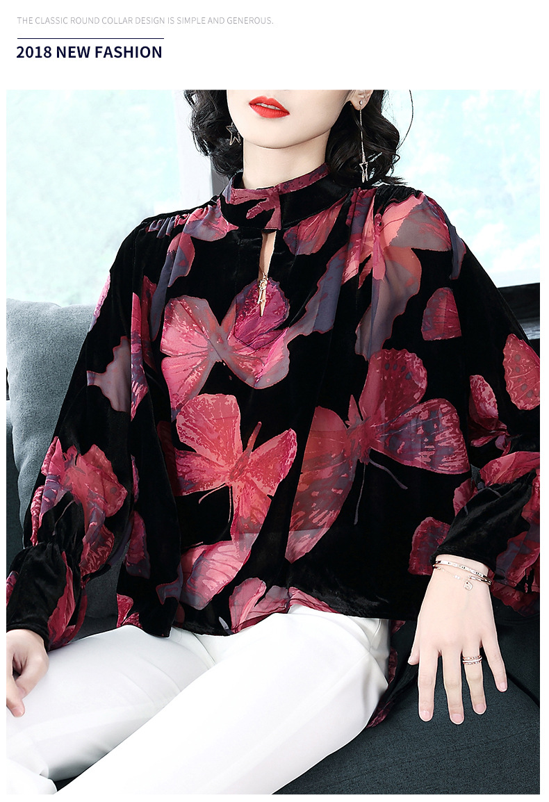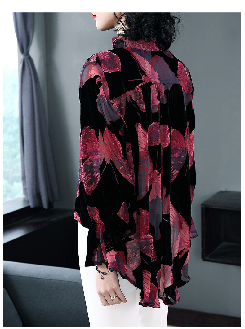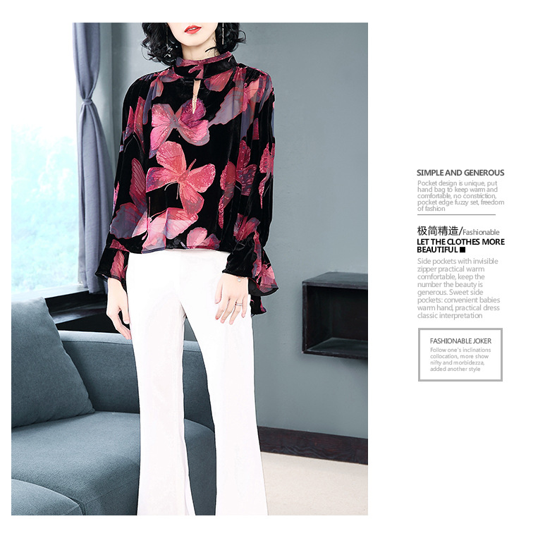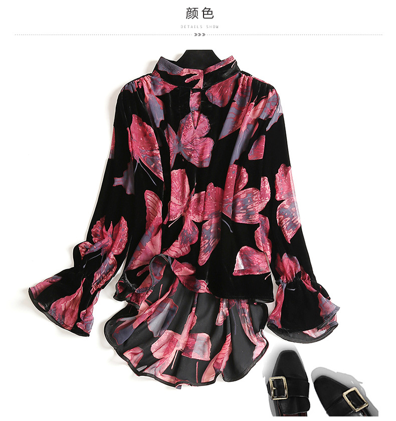 KE-3512春夏新款欧美立领喇叭袖印花植绒不规则衬衫