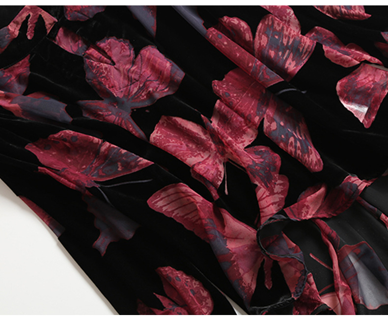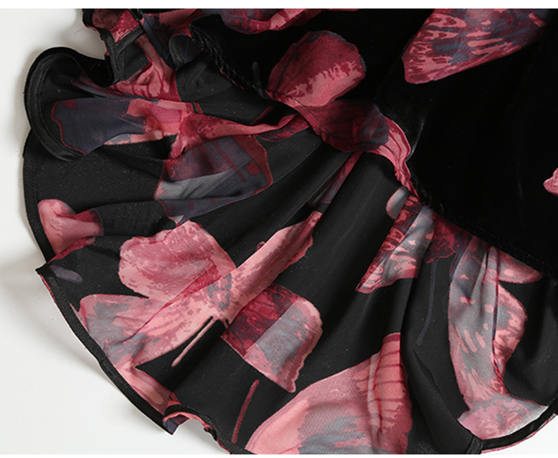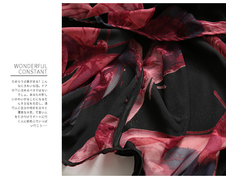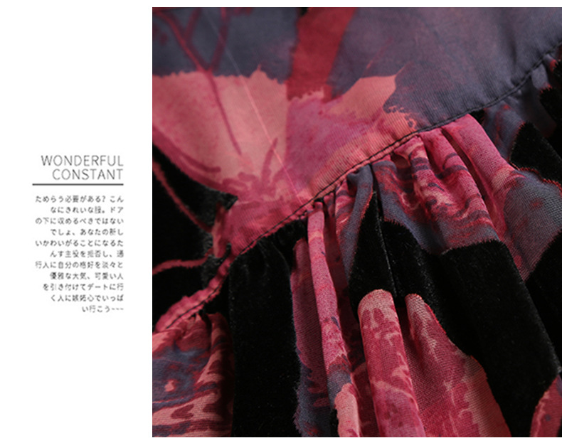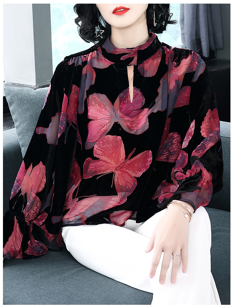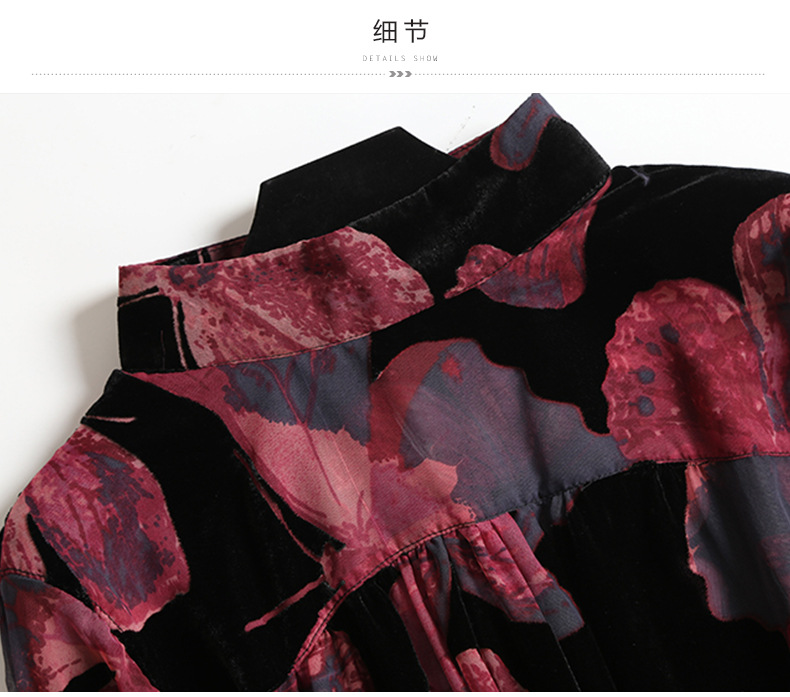 KE-3512春夏新款欧美立领喇叭袖印花植绒不规则衬衫