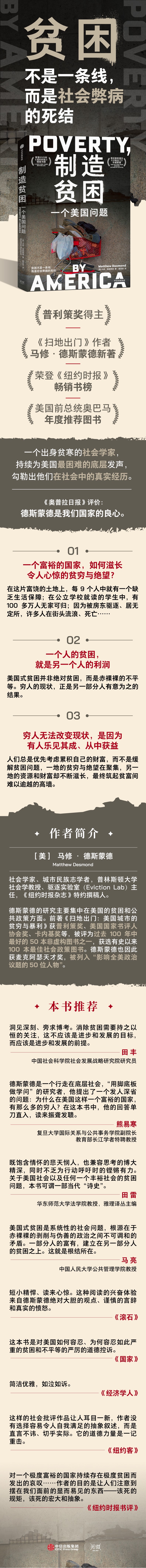 根据我自己多年的研究和报道,以及社会科学领域的其他研究,我在书里阐述了为什么美国存在这么严重的贫困问题,并提出了消除贫困的办法。当然,消除贫困需要新政策的出台,需要政治运动的重振;同时,还要求我们每个人以自己的方式成为 “贫困废除主义者”,不要把自己的美好生活建立在邻居的苦难之上,不再在无意间成为穷人的敌人。