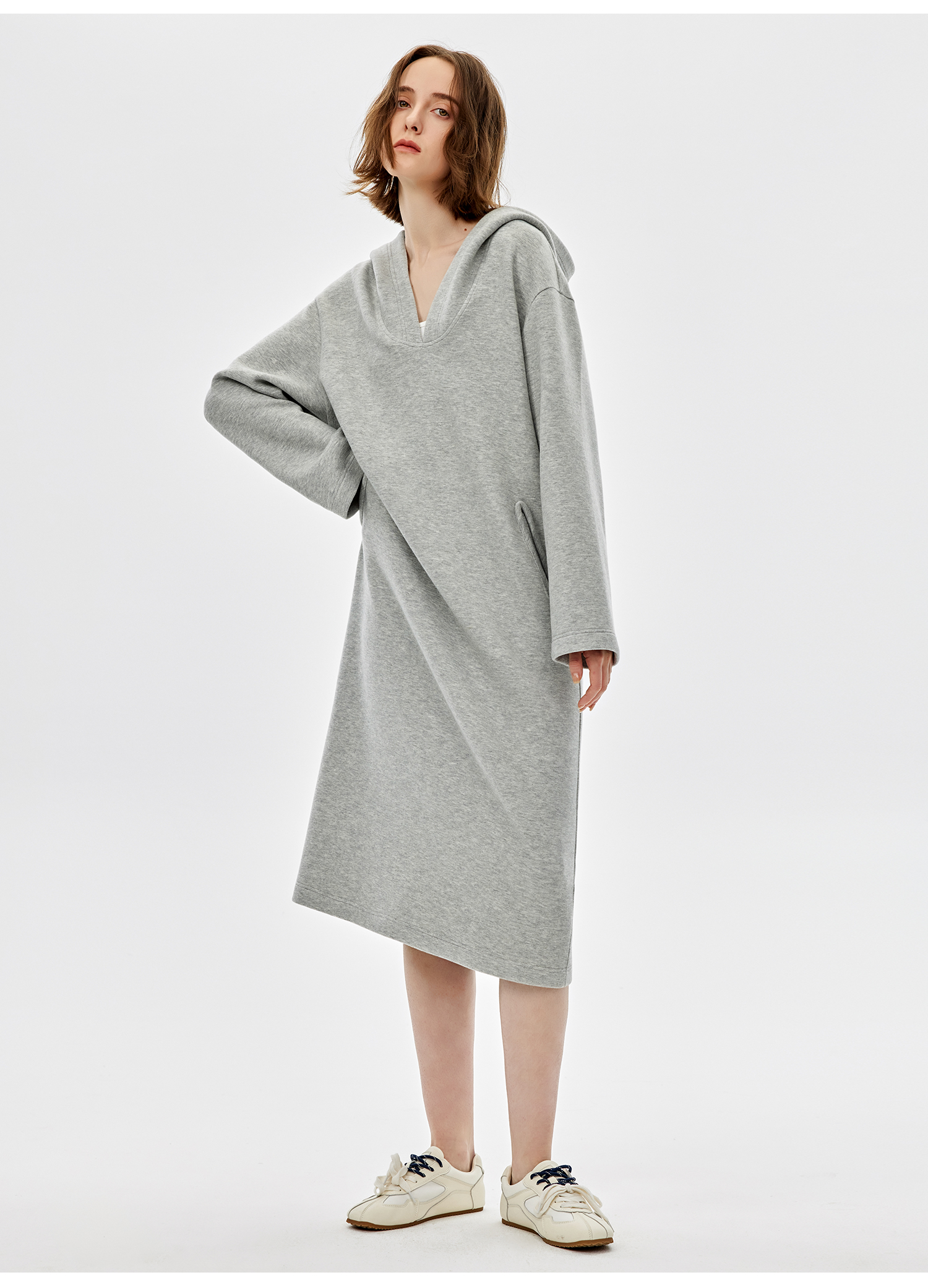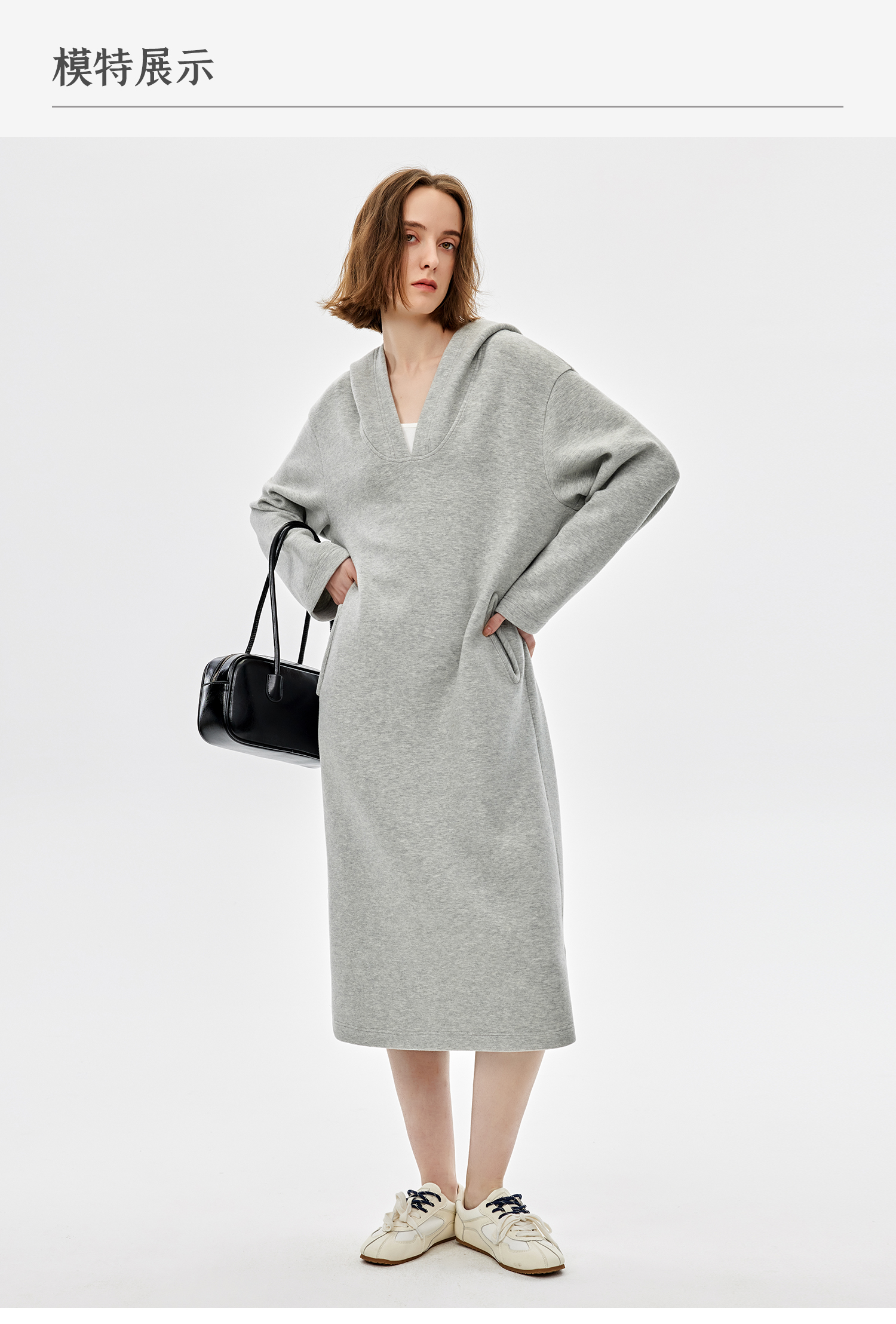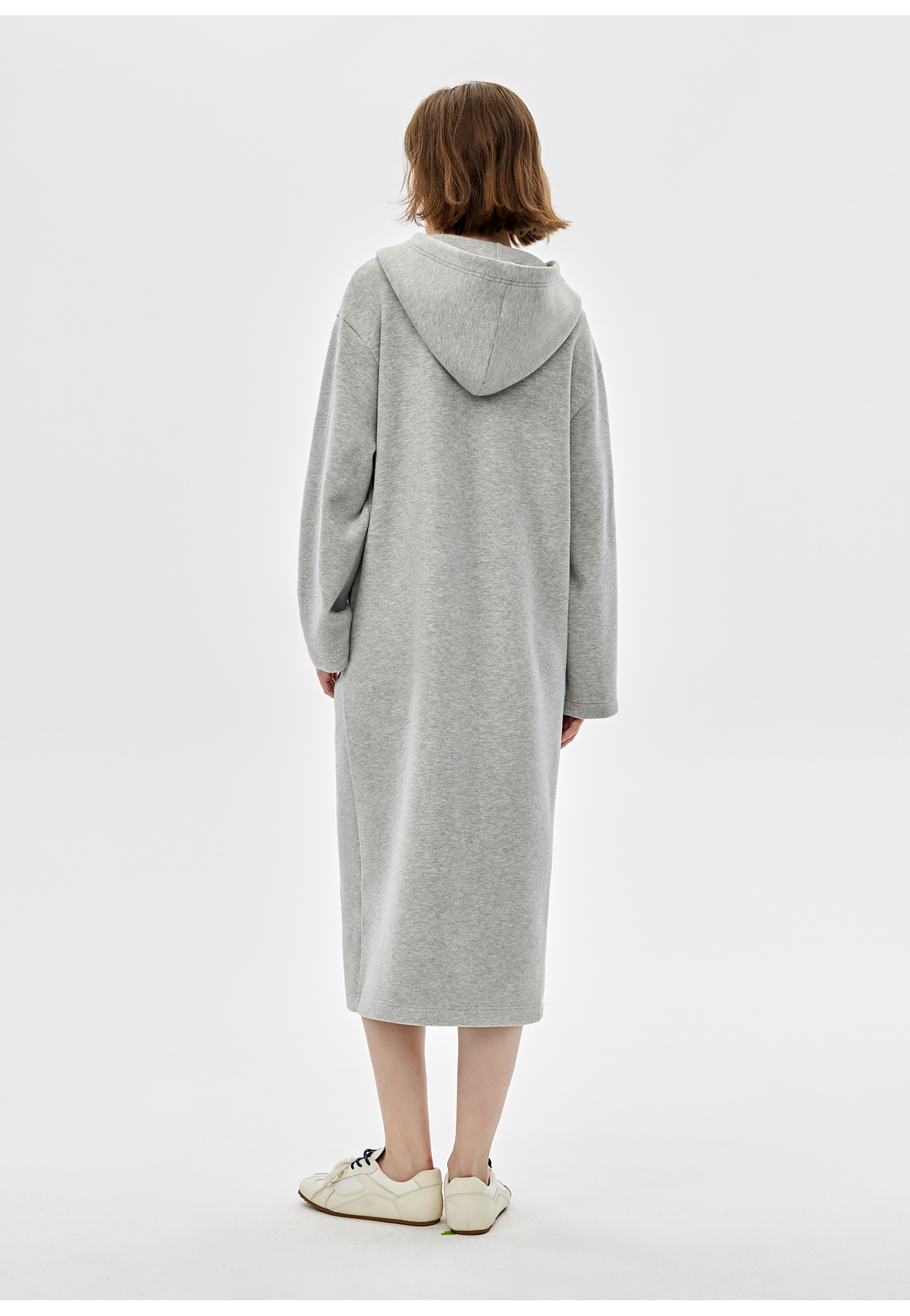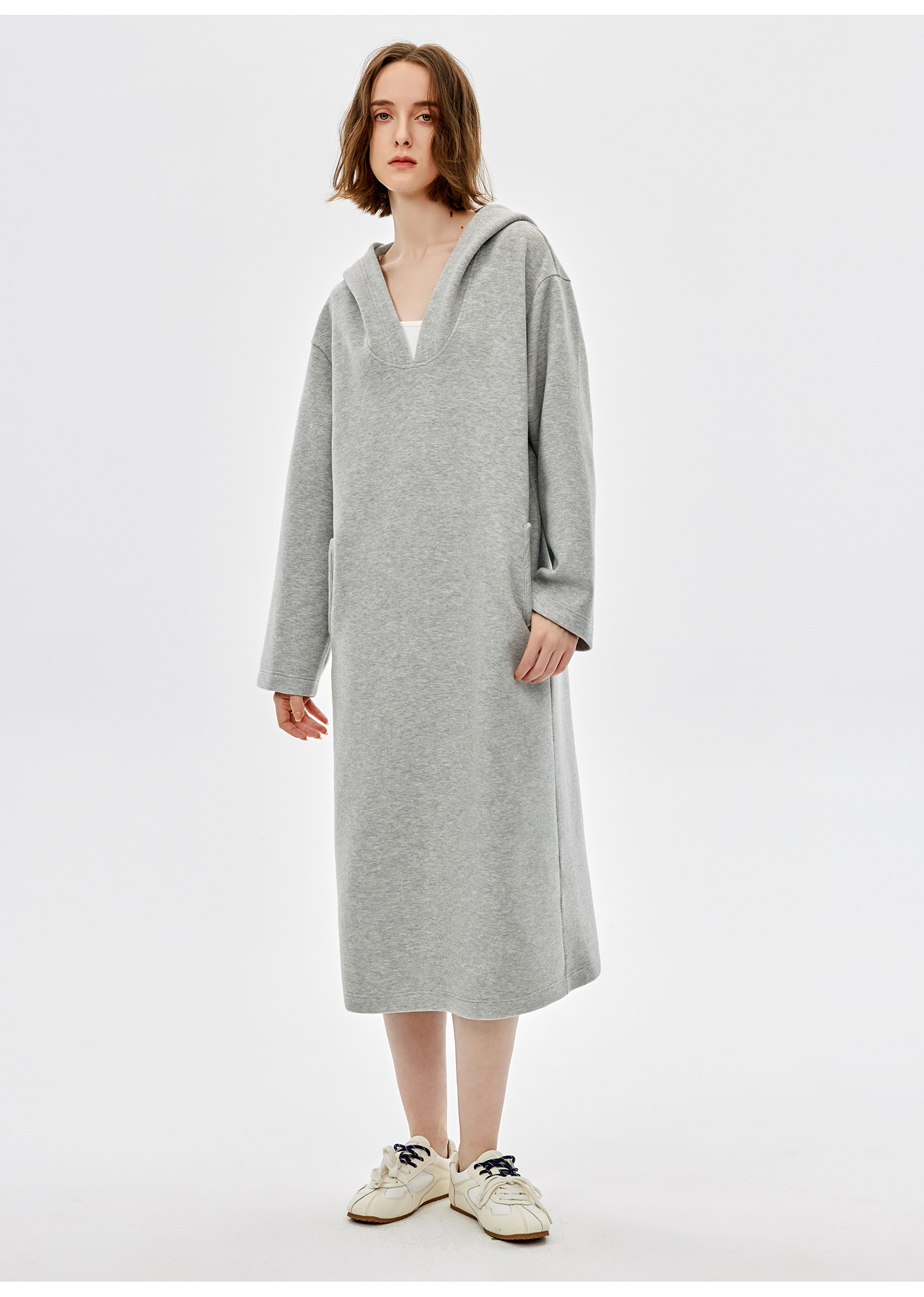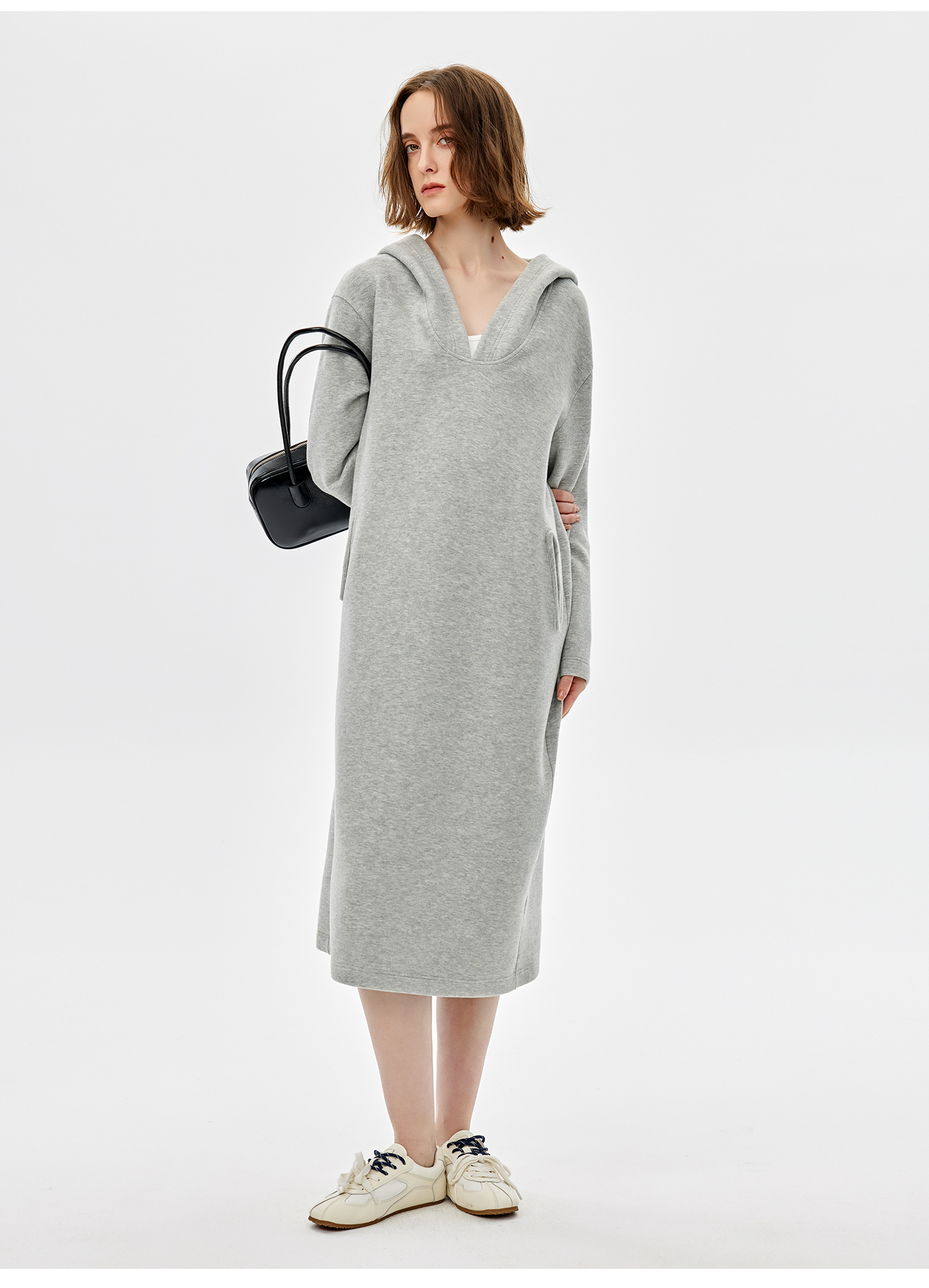 西嘉|绵羊毛精梳棉松弛感连帽V领连衣裙女2025春季新款直筒卫衣裙(LYQ2501025)