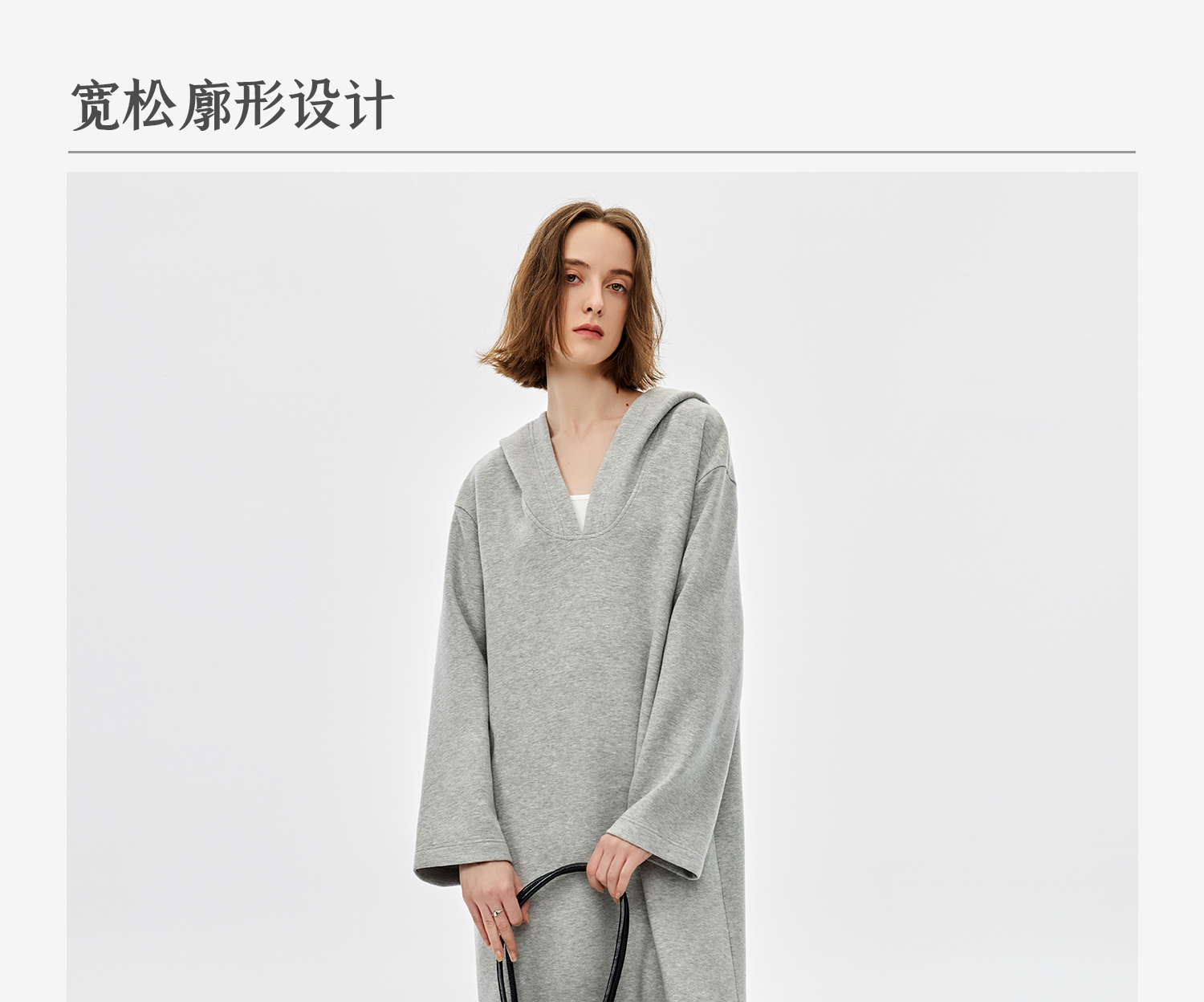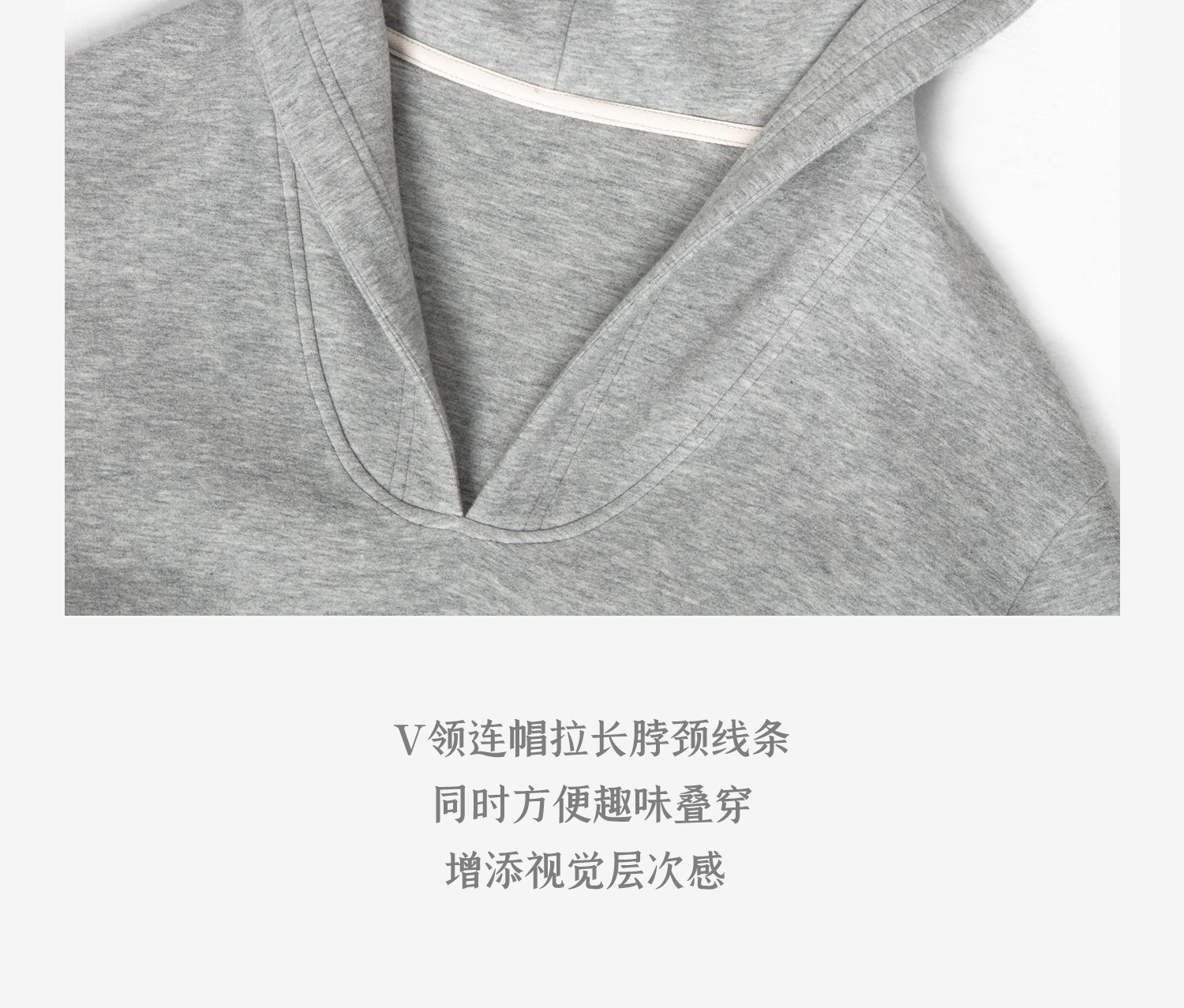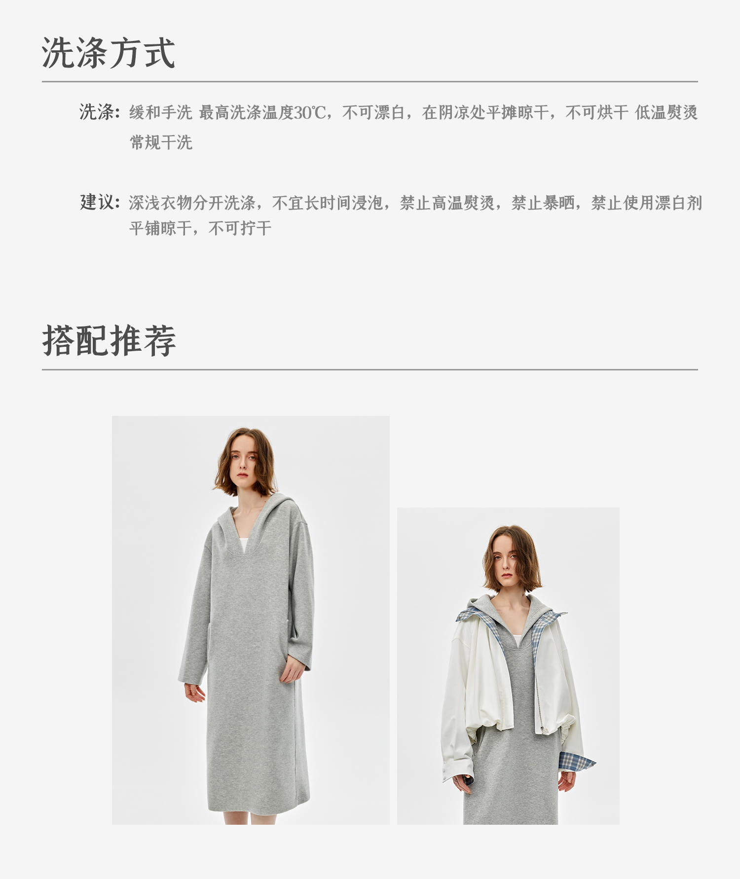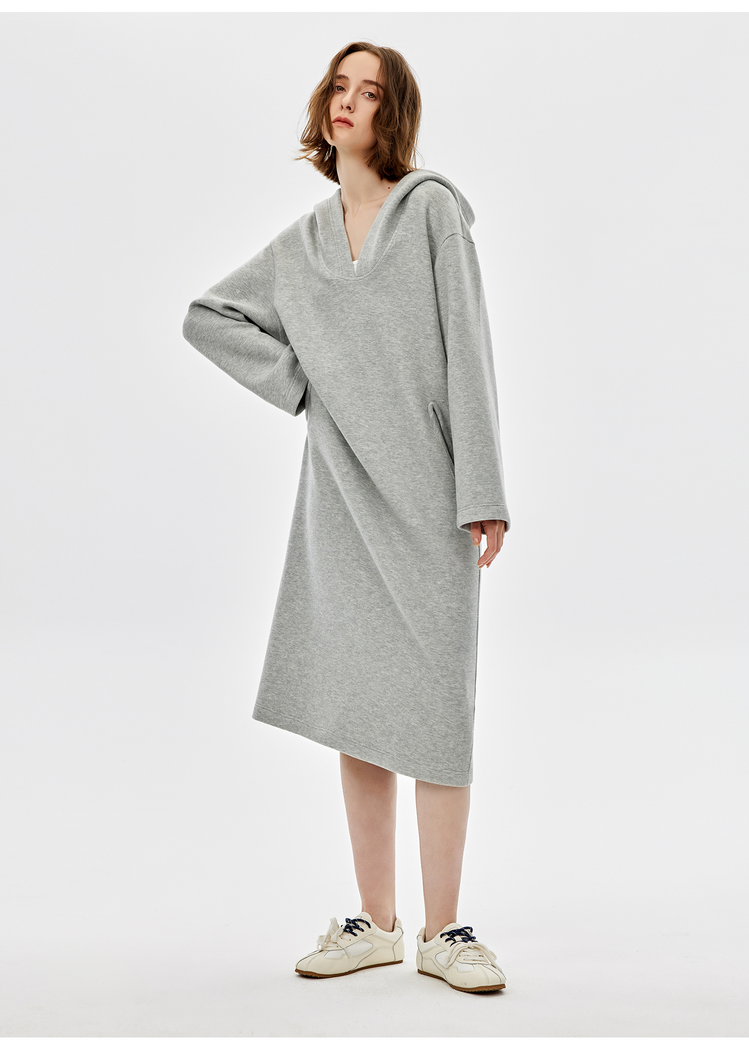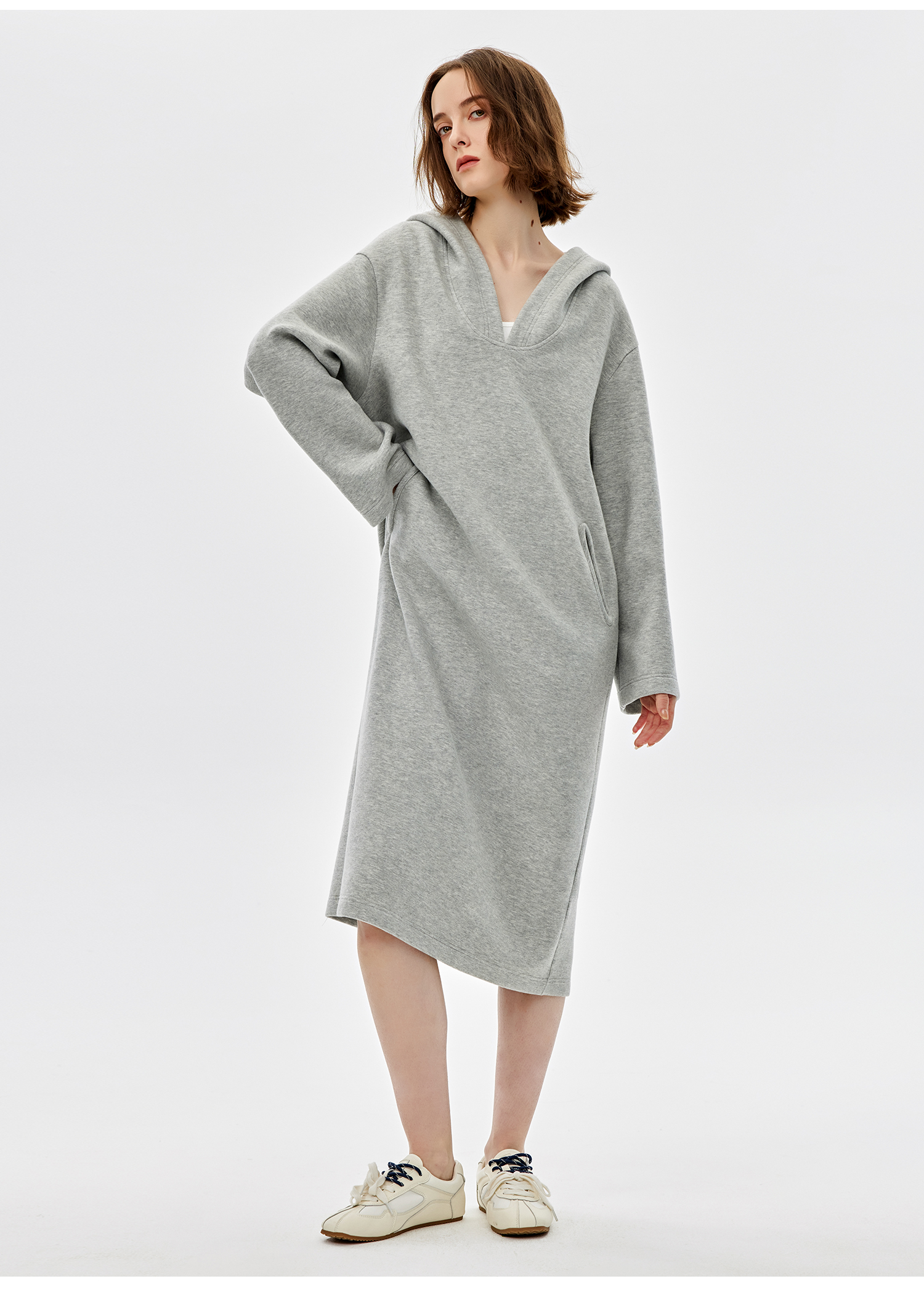 西嘉|绵羊毛精梳棉松弛感连帽V领连衣裙女2025春季新款直筒卫衣裙(LYQ2501025)