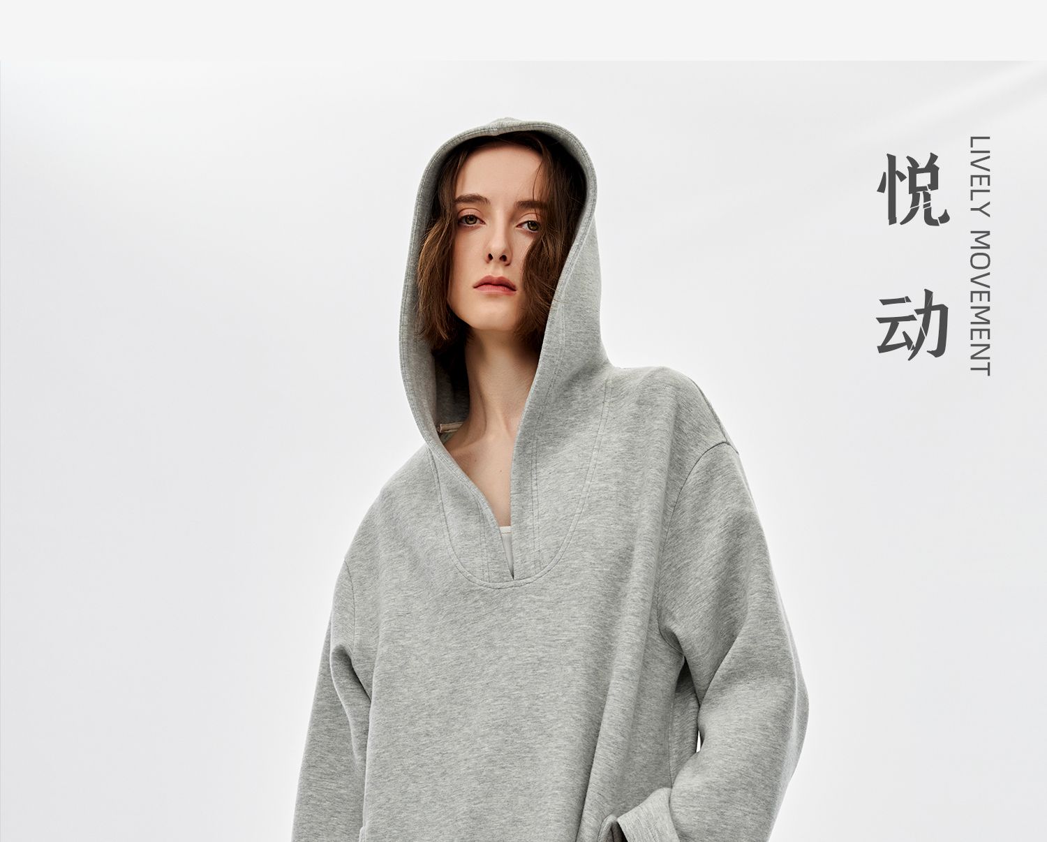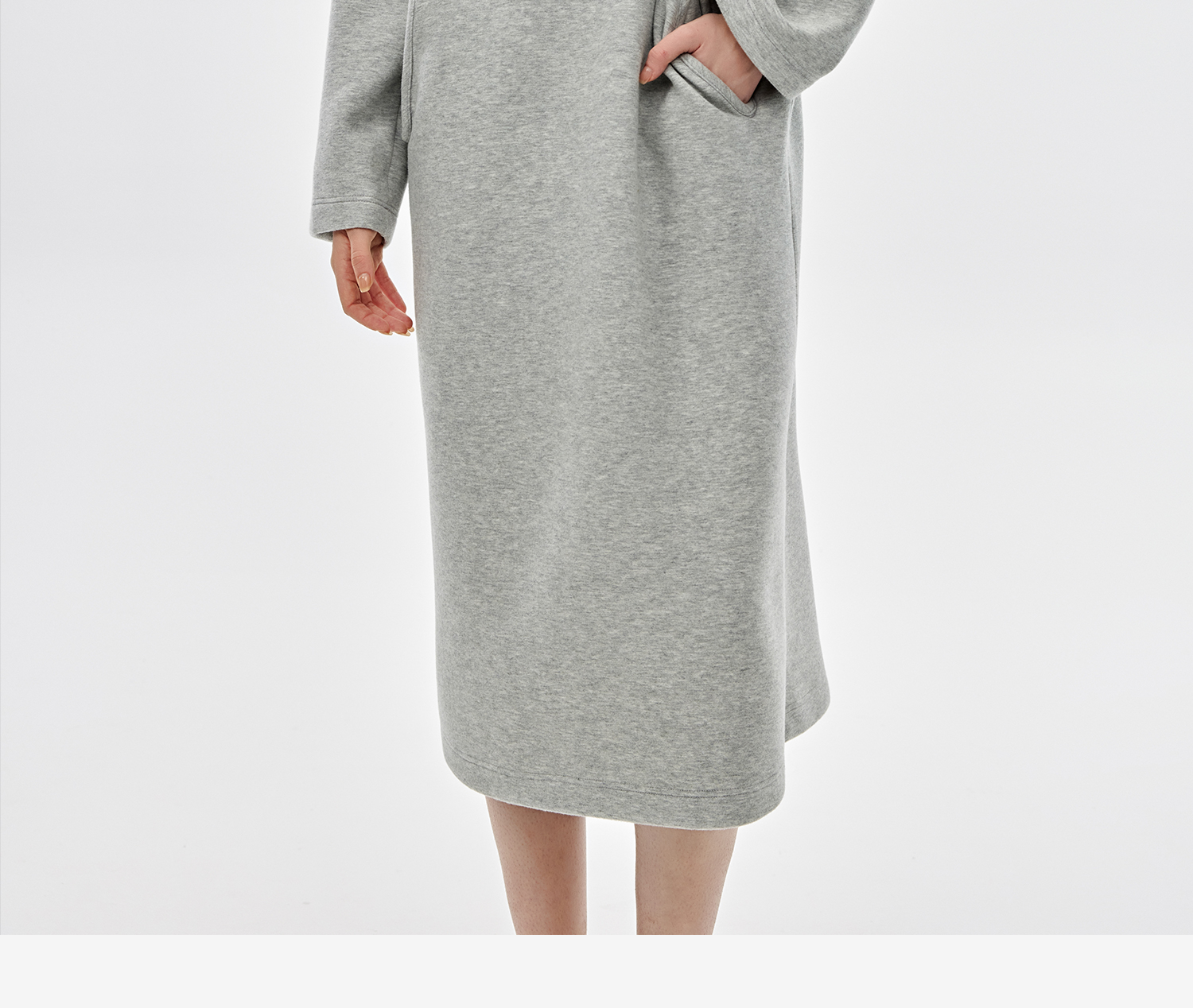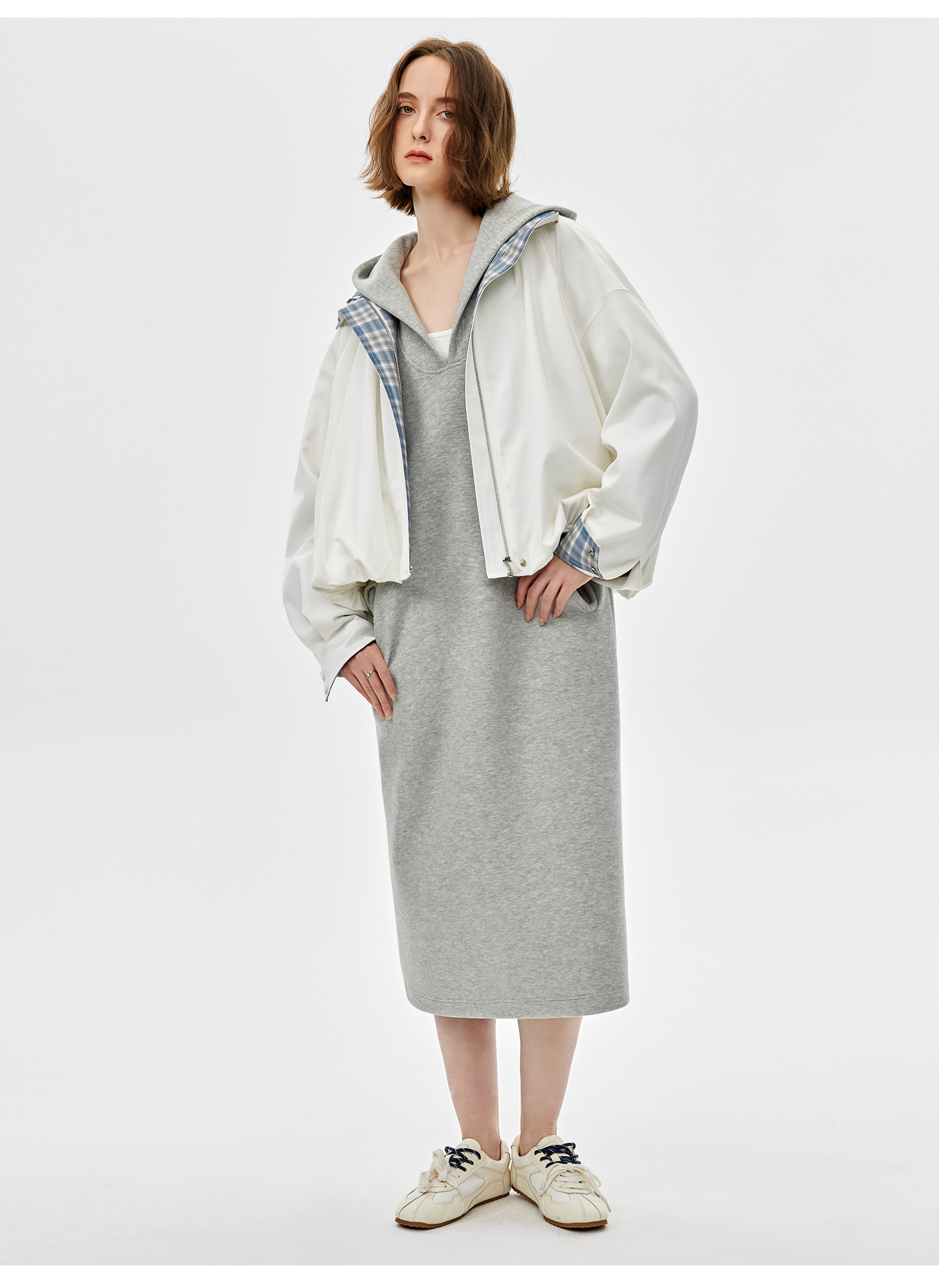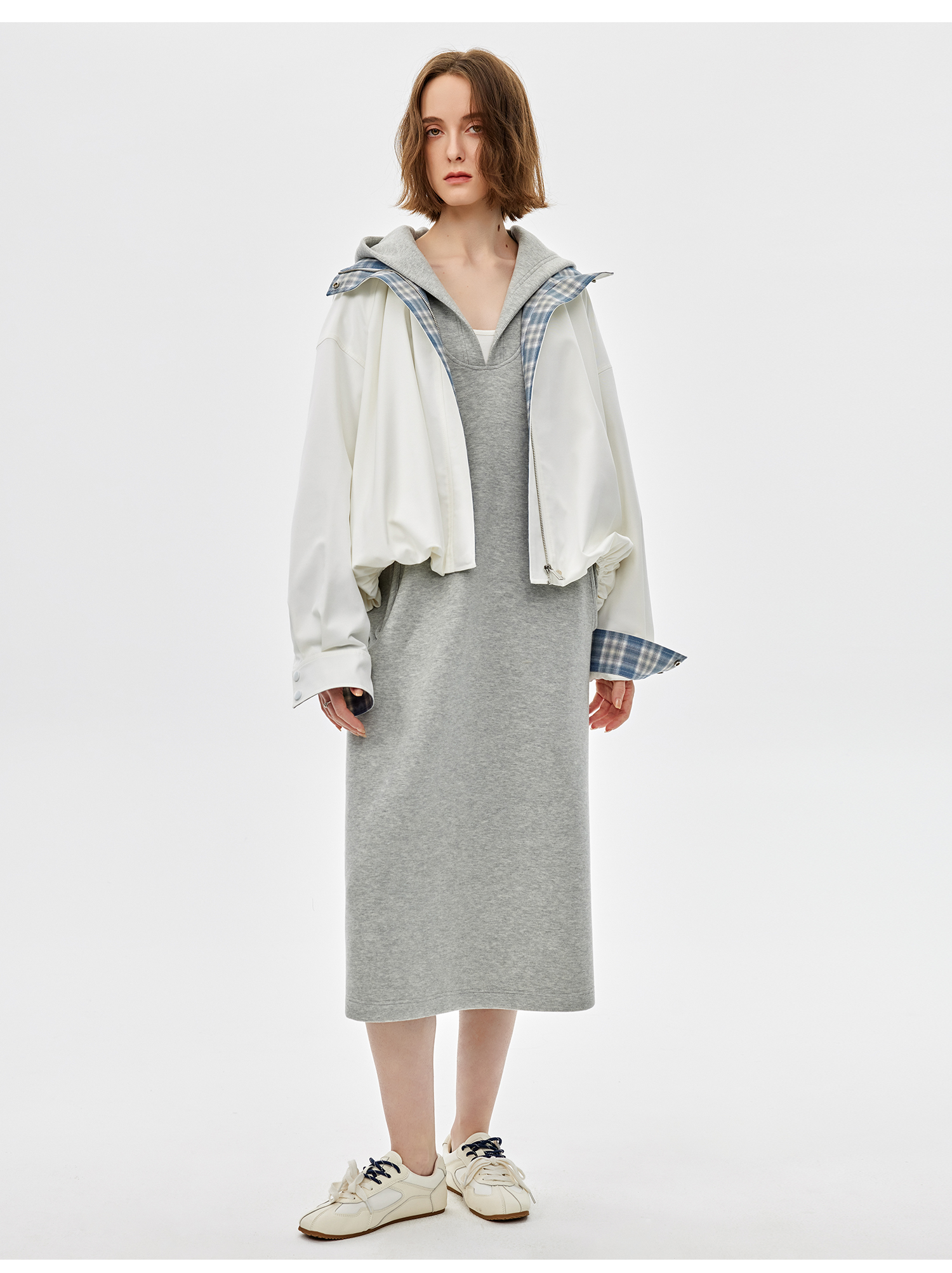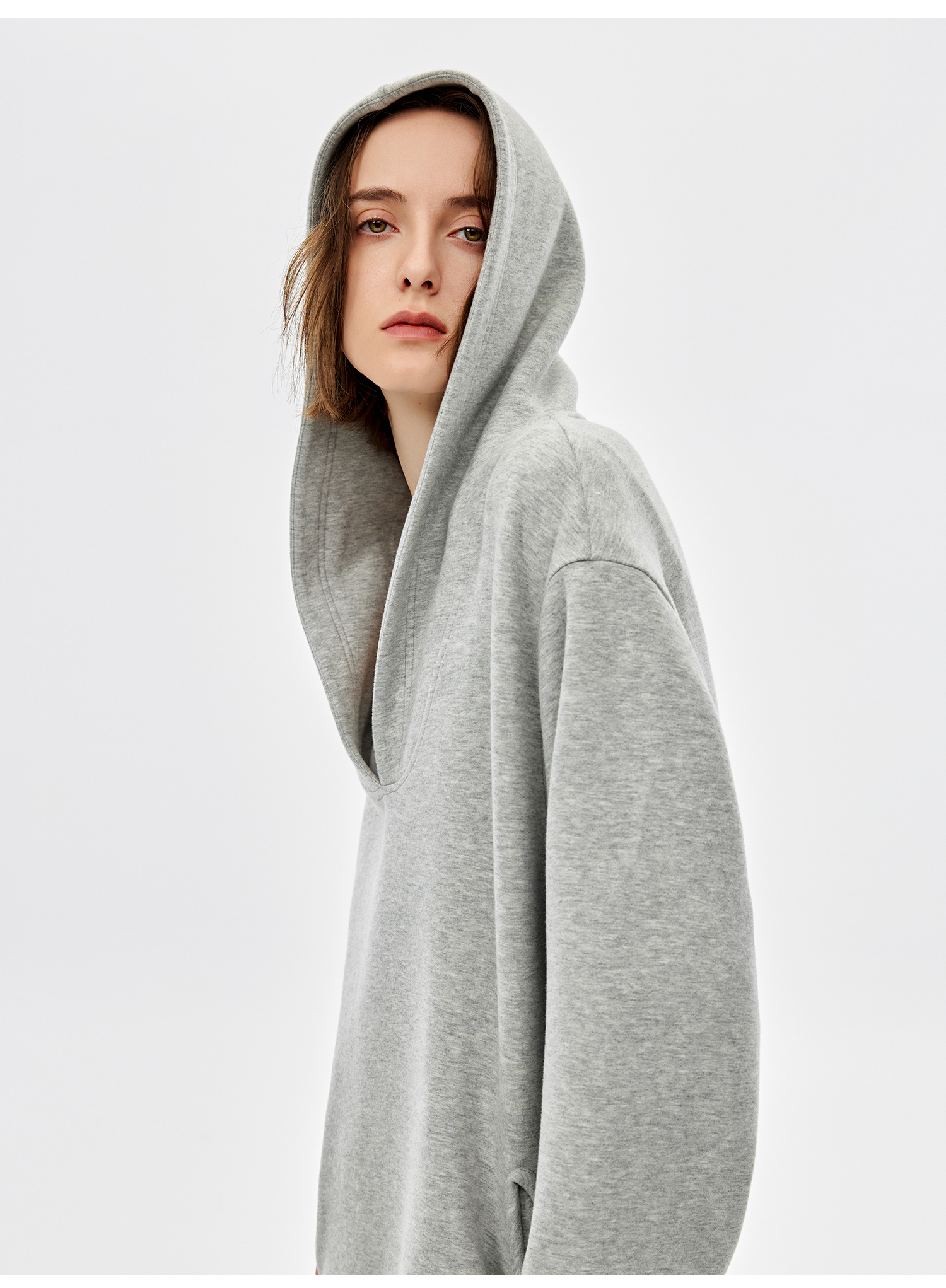西嘉|绵羊毛精梳棉松弛感连帽V领连衣裙女2025春季新款直筒卫衣裙(LYQ2501025)