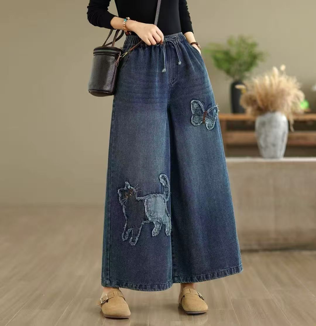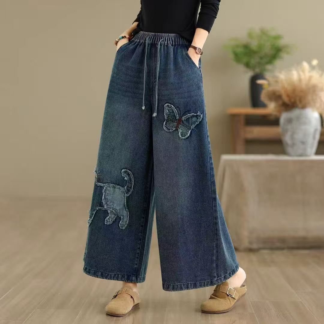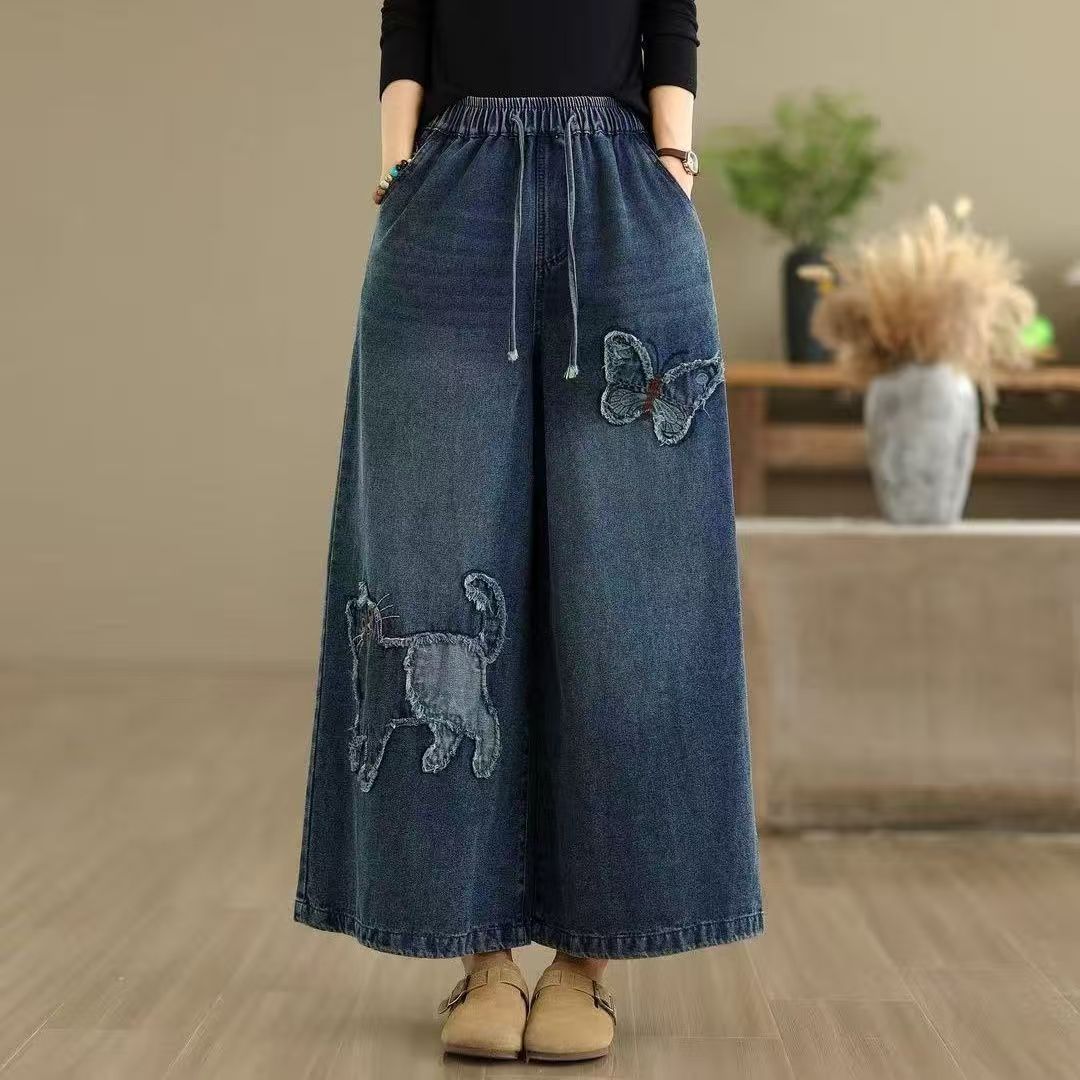 秋季新款刺绣牛仔阔腿裤女文艺民族风松紧腰休闲复古显瘦直筒长裤