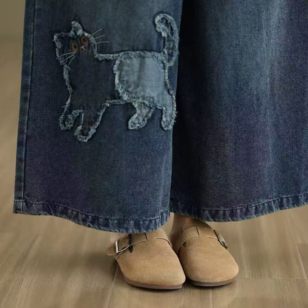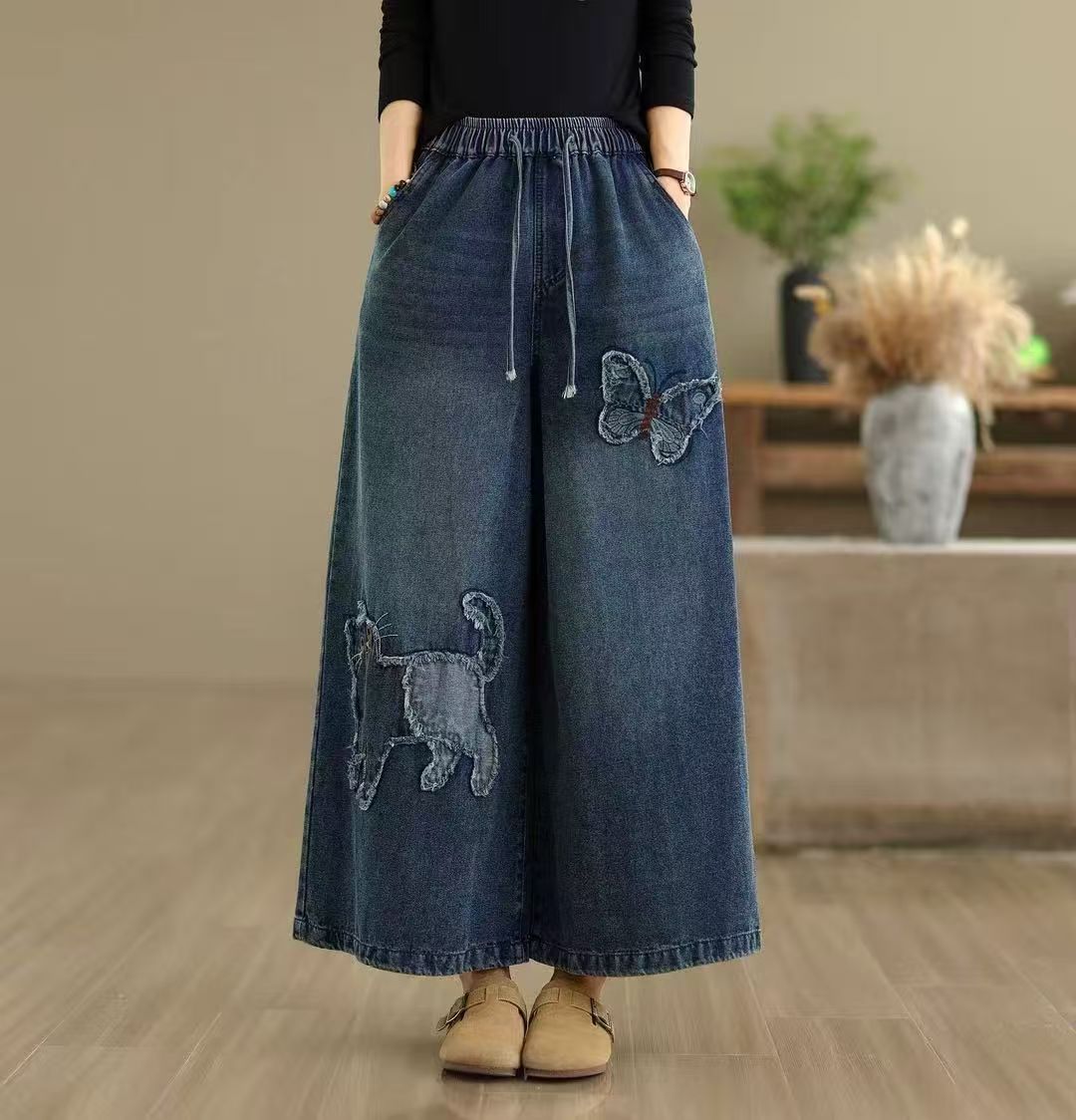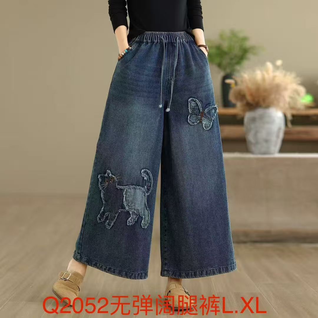秋季新款刺绣牛仔阔腿裤女文艺民族风松紧腰休闲复古显瘦直筒长裤