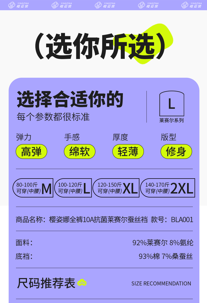 樱姿娜第三代铂金蚕丝裤BLA001 轻柔软糯加长桑蚕丝底裆 吸湿透气上身无痕无感高弹0束缚 6条礼盒装