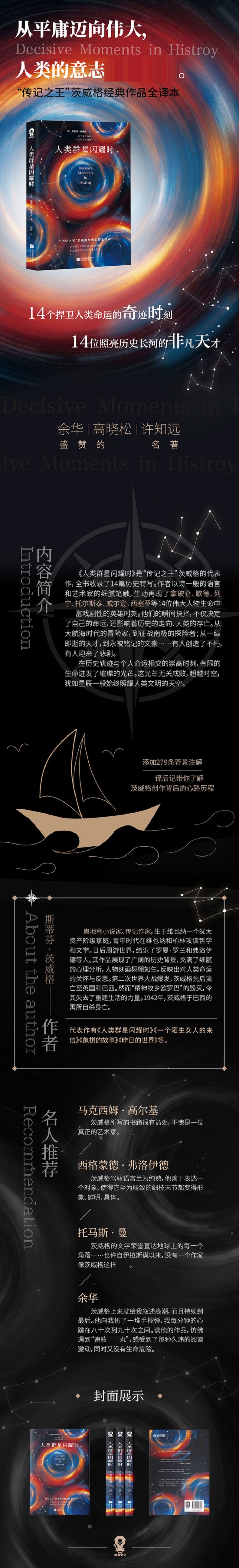 《人类群星闪耀时》是“传记之王”茨威格的代表作,全书收录了14篇历史特写。作者以诗一般的语言和艺术家的细腻笔触,生动再现了拿破仑、歌德、列宁、托尔斯泰、威尔逊、西塞罗等14位伟大人物生命中富戏剧性的英雄时刻。他们的瞬间抉择,不仅决定了自己的命运,还影响着历史的走向、人类的存亡。从大航海时代的冒险家,到征战南极的探险者;从一纵即逝的天才,到永被铭记的文豪……有人创造了不朽,有人迎来了悲剧。在历史轨迹与个人命运相交的崇高时刻,有限的生命迸发了璀璨的光芒。这光芒无关成败,超越时空,犹如星辰一般始终照耀人类文明的天空。