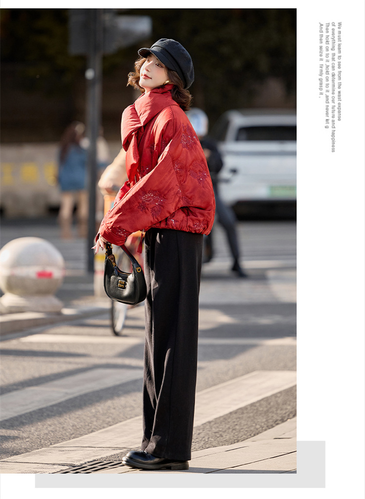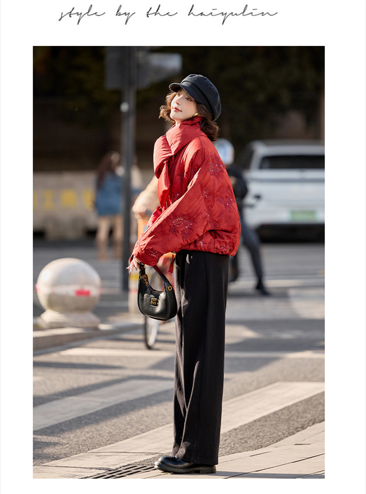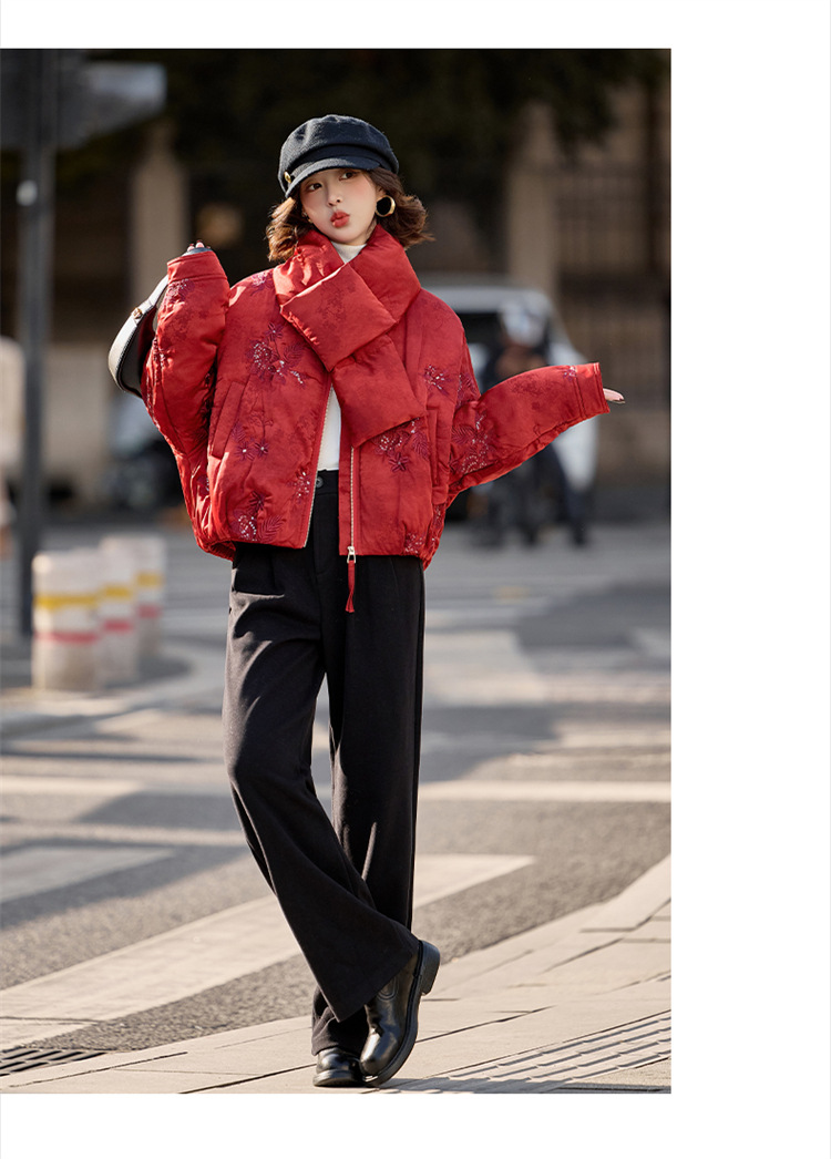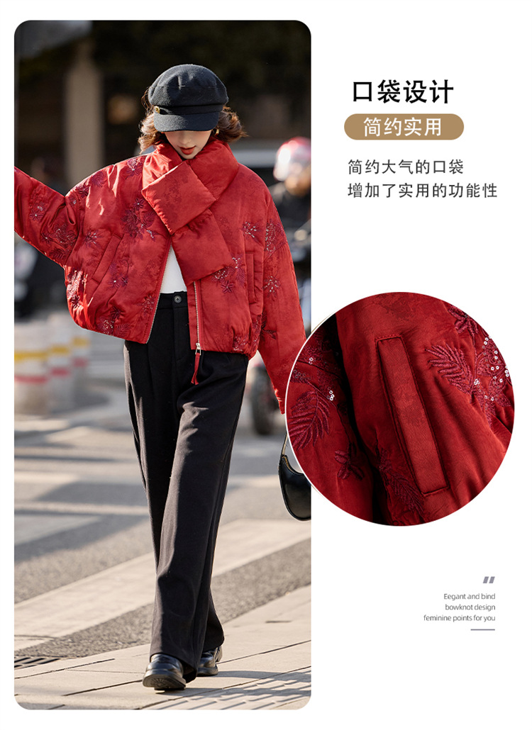 HR SYY889复古风棉衣外套时尚气质优雅刺绣短款棉服配围巾 商品图4