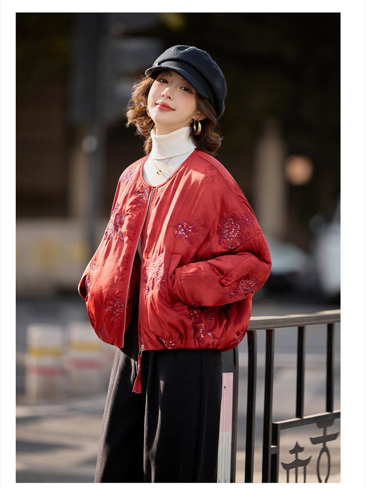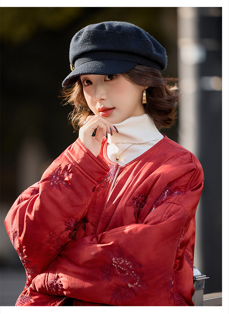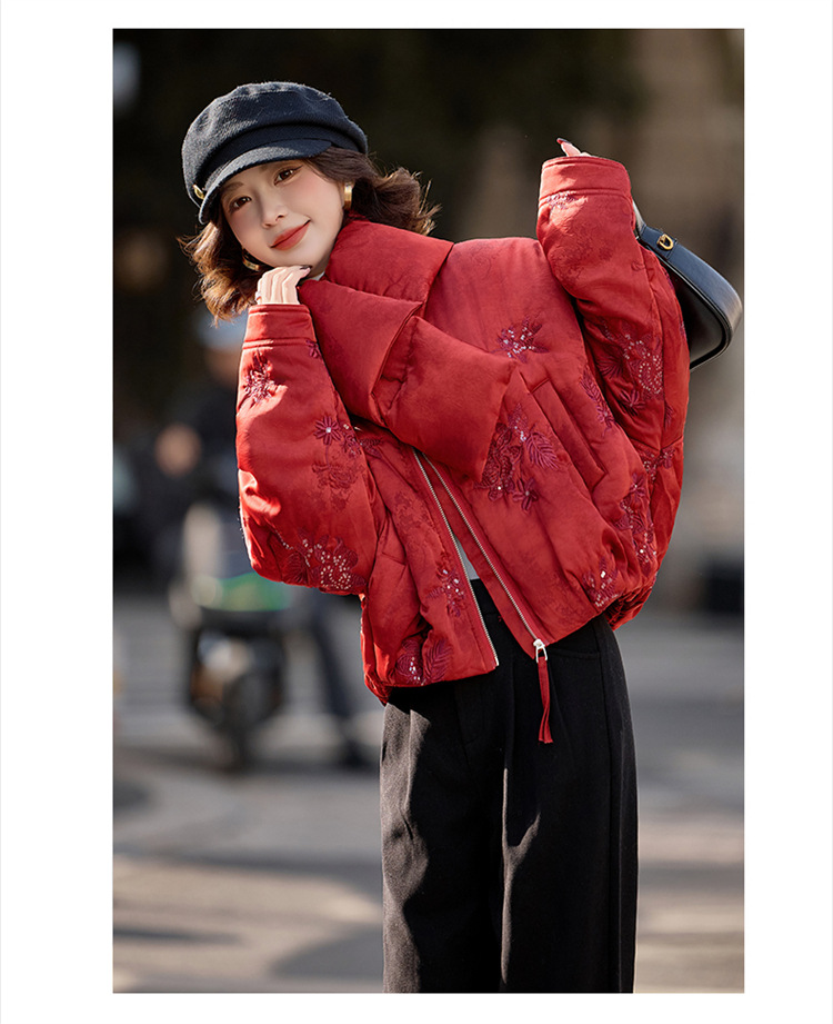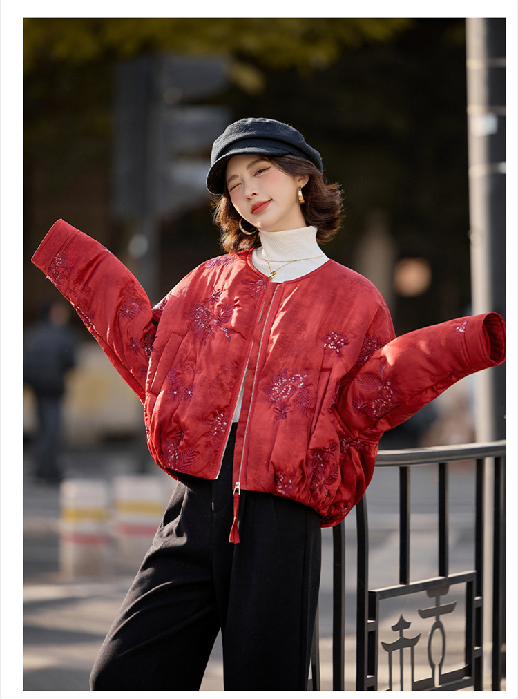 HR SYY889复古风棉衣外套时尚气质优雅刺绣短款棉服配围巾 商品图0
