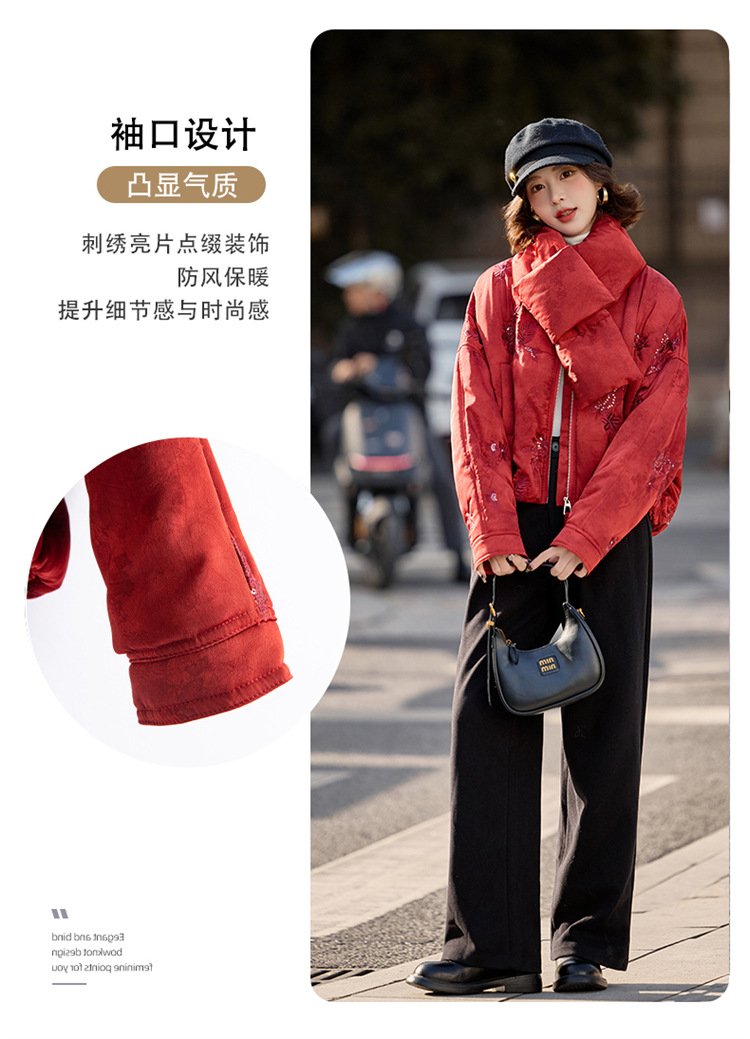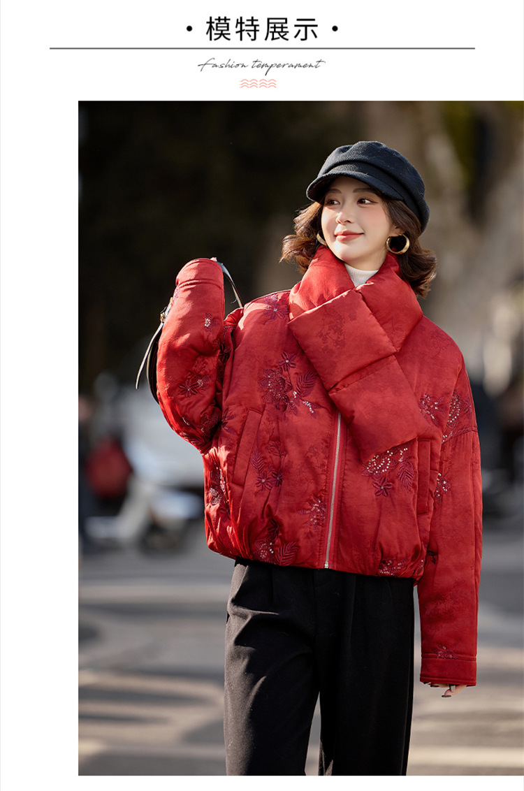 HR SYY889复古风棉衣外套时尚气质优雅刺绣短款棉服配围巾 商品图3
