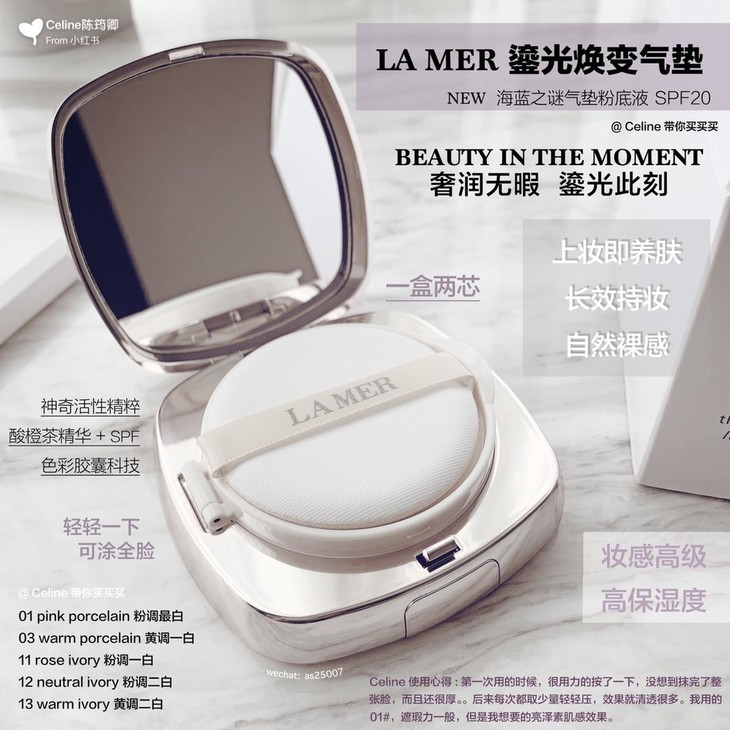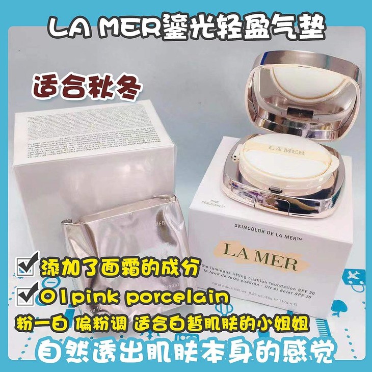 LA MER鎏光轻盈气垫#01👍鎏光气垫里添加了面霜的成分💆,具有遮瑕效果☁。粉扑采用柔滑圆角设计,轻盈透气的配方🌬。太适合秋冬啦🍁,刚上脸像是扫过蜜粉的妆面😇,偏哑光质地,显得特别高级🕶,如果色号合适,像是没有擦粉底,自然透出肌肤本身的感觉✨~01pink porcelain粉一白,偏粉调,适合白皙肌肤的小姐姐,有提亮改善气色的效果💓