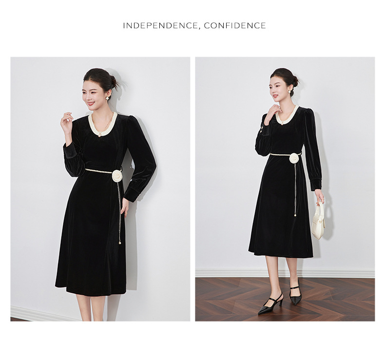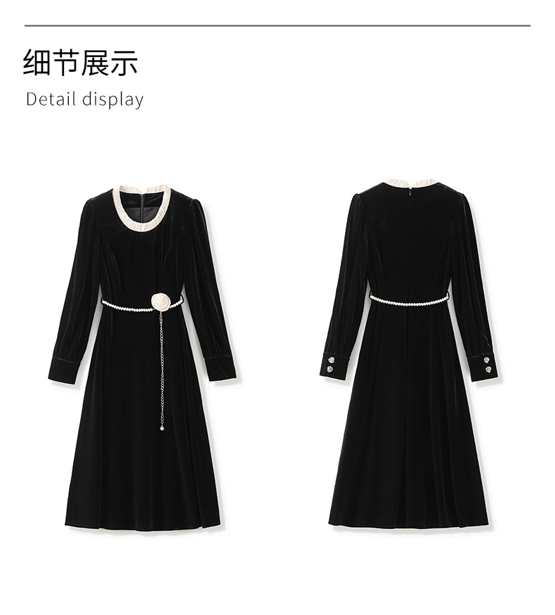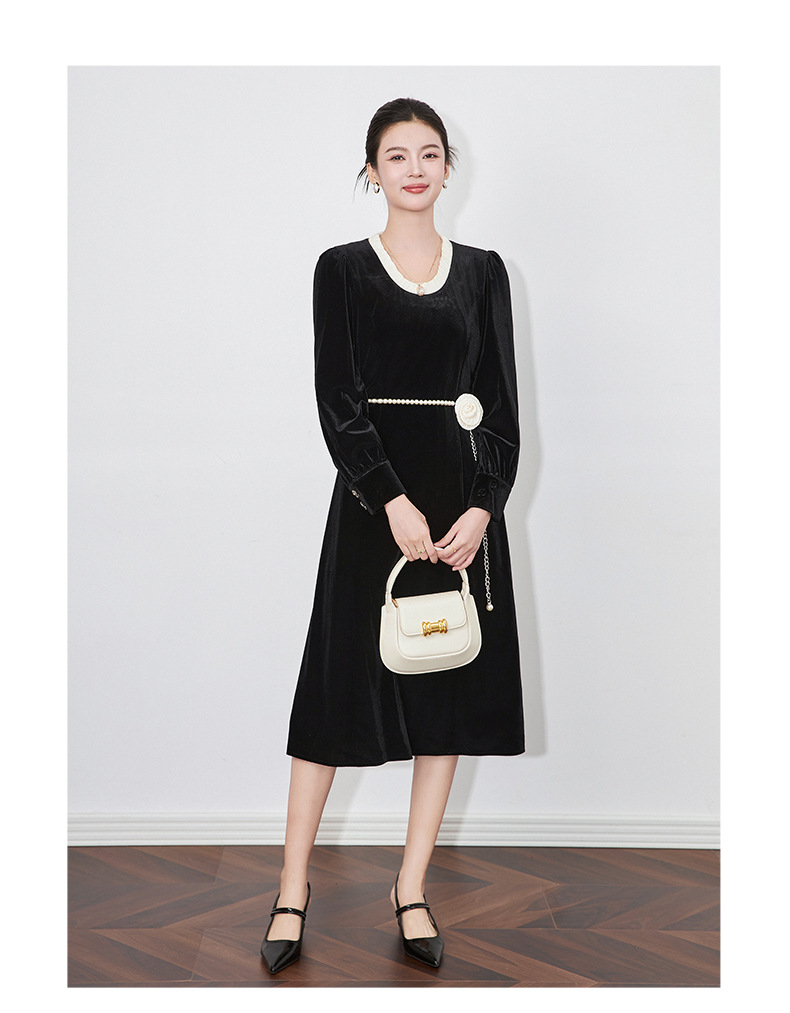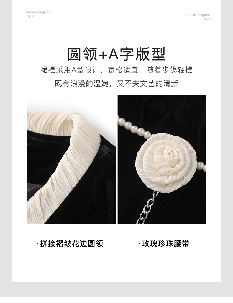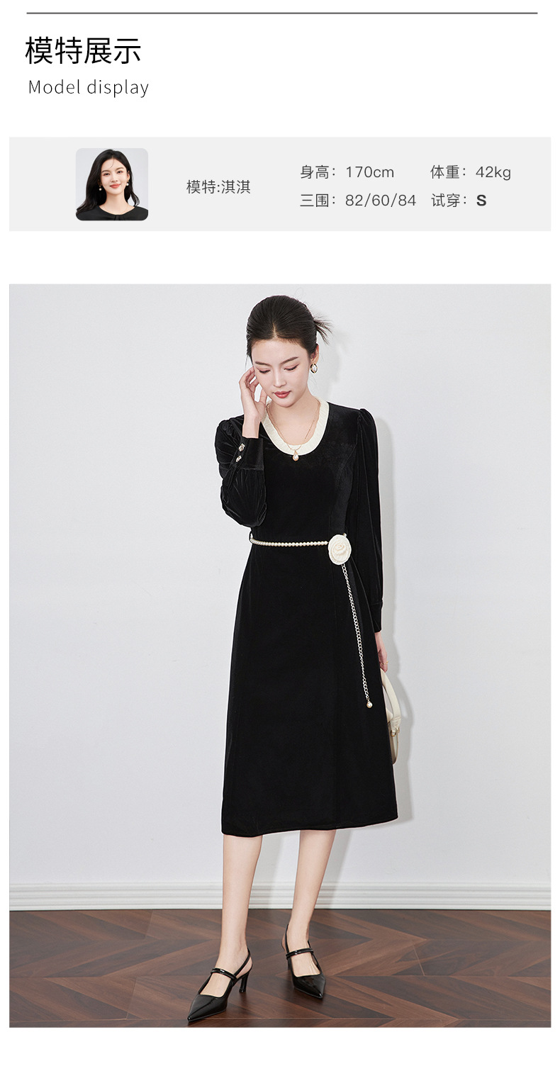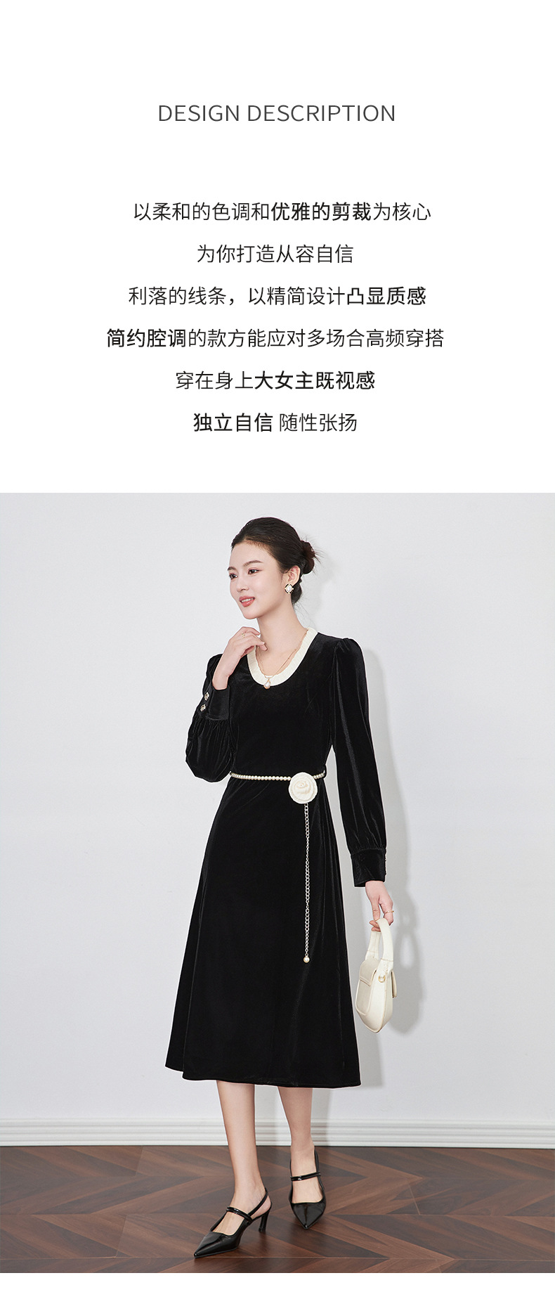 【高货wl】全新升级【铂金会员358/天猫479/差价121】(22055) 洛诗琳秋冬款法式优雅撞色褶皱珍珠腰带丝绒收腰连衣裙