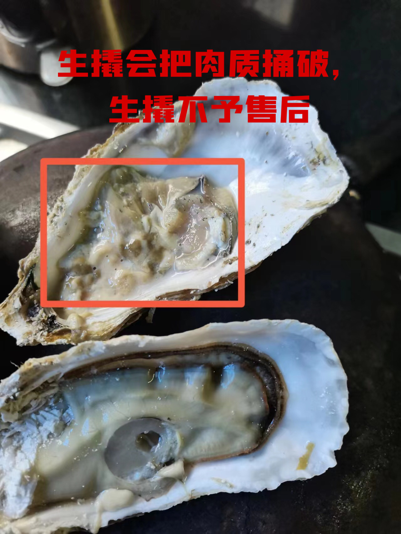 3、生蚝生撬需要专业人员才可熟练的撬开,非专业人员会把生蚝的肉捅破,生蚝撬开蒸水分流失大也影响口感,我们严谨生撬,生撬不予售后,一切以蒸熟为依据!