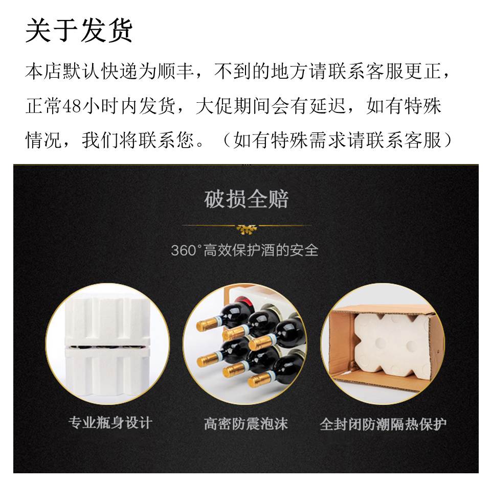 酒类为特殊商品,收到货物后,请务必当面拆开验货,我们有随货清单,请检查包装以及产品本身是否有破损,产品数量是否正确,确认无误后再签收。无质量问题不接受退换。