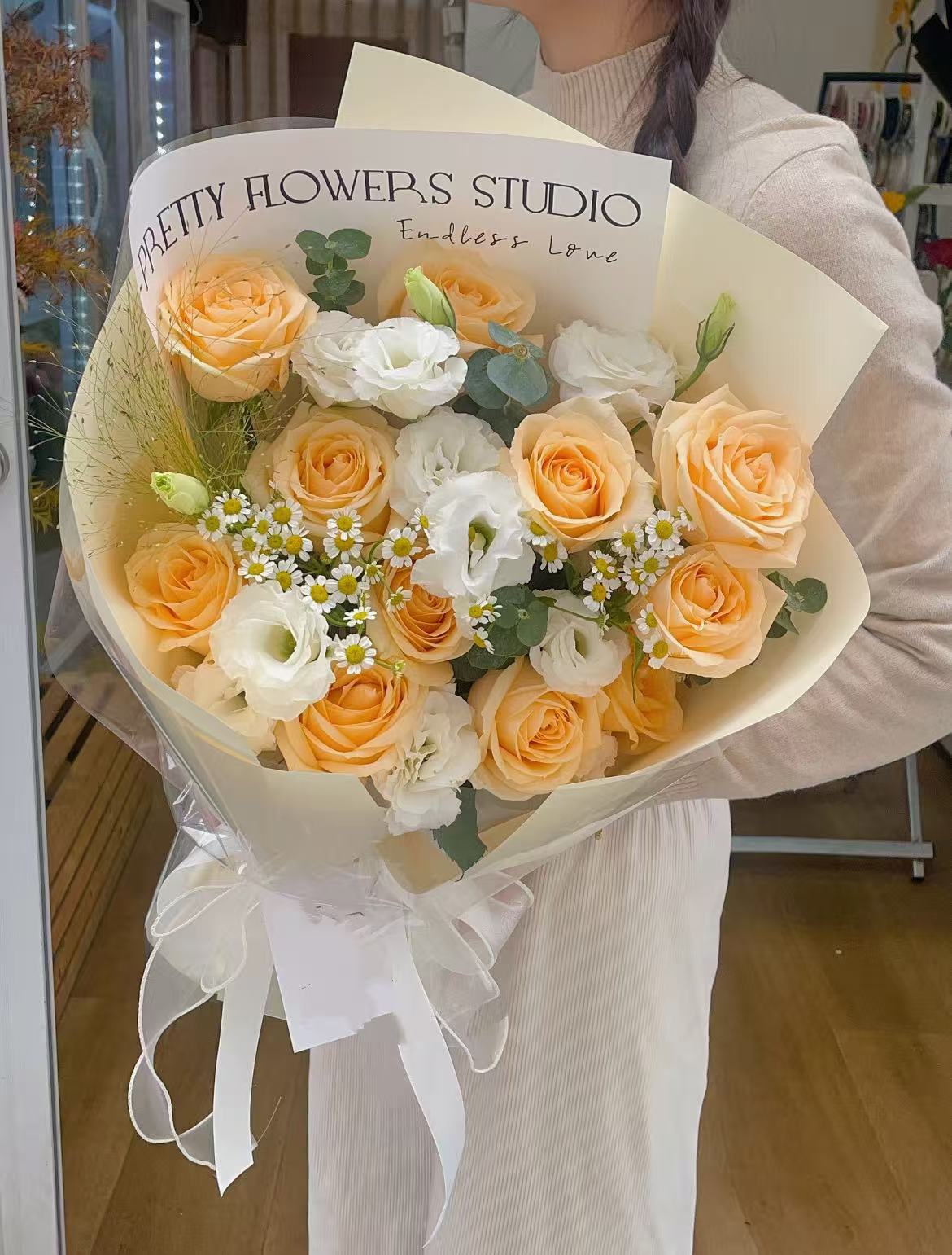【当日达】顺丰免邮◆香槟玫瑰 白桔梗 洋甘菊 喷泉草 尤加利叶 中型手捧花 真诚恬静