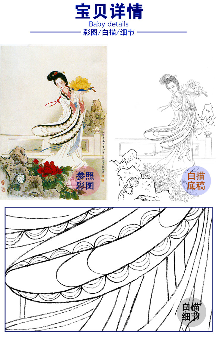 杨淑涛竖幅工笔传统仕女人物白描底稿《国色天香》-多种白描尺寸可选-B044