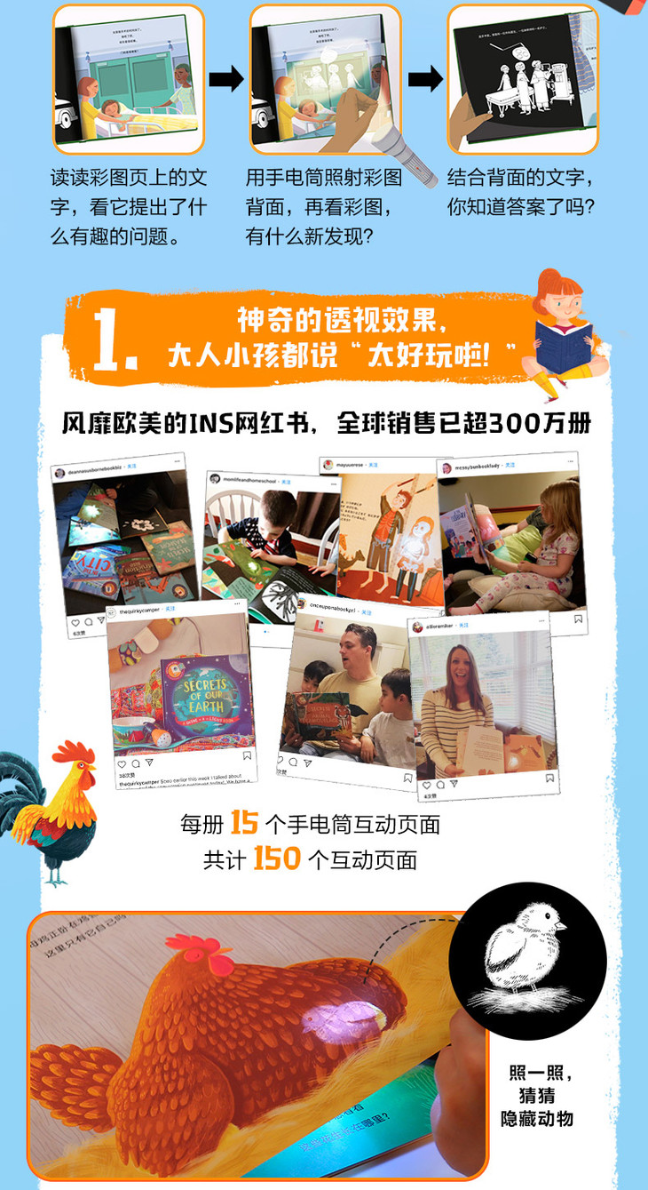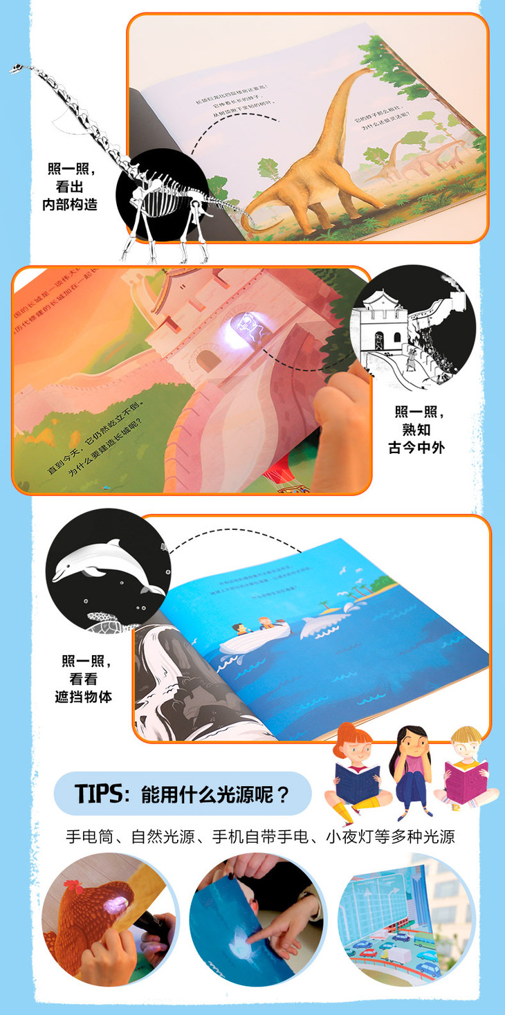 采用独特的光影透视效果,用手电筒(自然光源、手机自带手电或小夜灯等多种光源)从互动页的背面照一照;或者把书页掀开,将互动页的背面对着光,互动页的正面就会展现出的透视效果!内部构造、隐藏物品、遮挡场景、科学发现……隐藏画面一览无余!发现画面背后的隐藏知识,充分满足孩子好奇心。每册15个手电筒互动页,全系列10册共计150个!