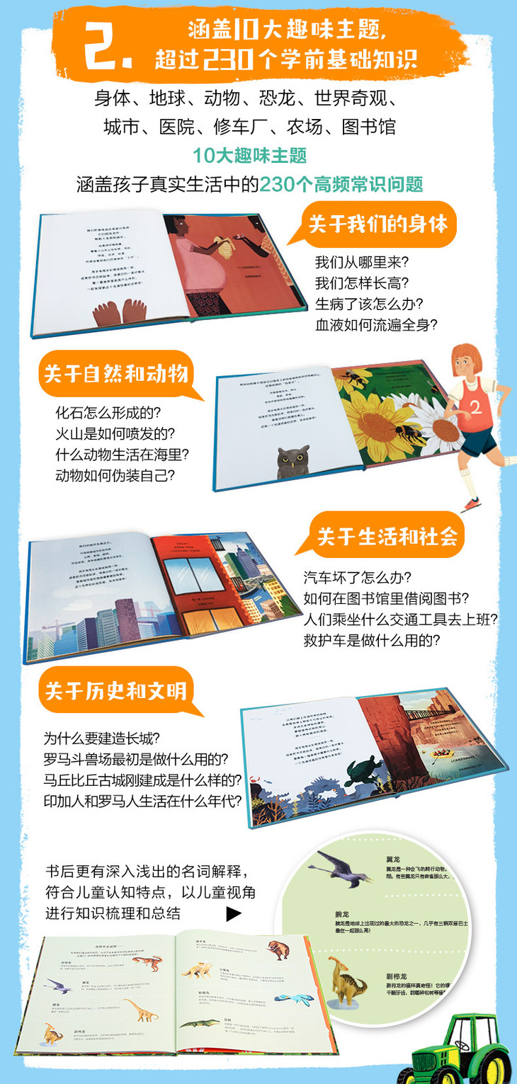 内容涵盖了自然认知及生活认知两大领域的知识,身体恐龙地球世界奇观动物伪装术;农场城市修车厂图书馆,书中讲述的科普知识轻松有趣,配合Q&A的提问方式,从而激发孩子的探索兴趣,在潜移默化中学得知识。