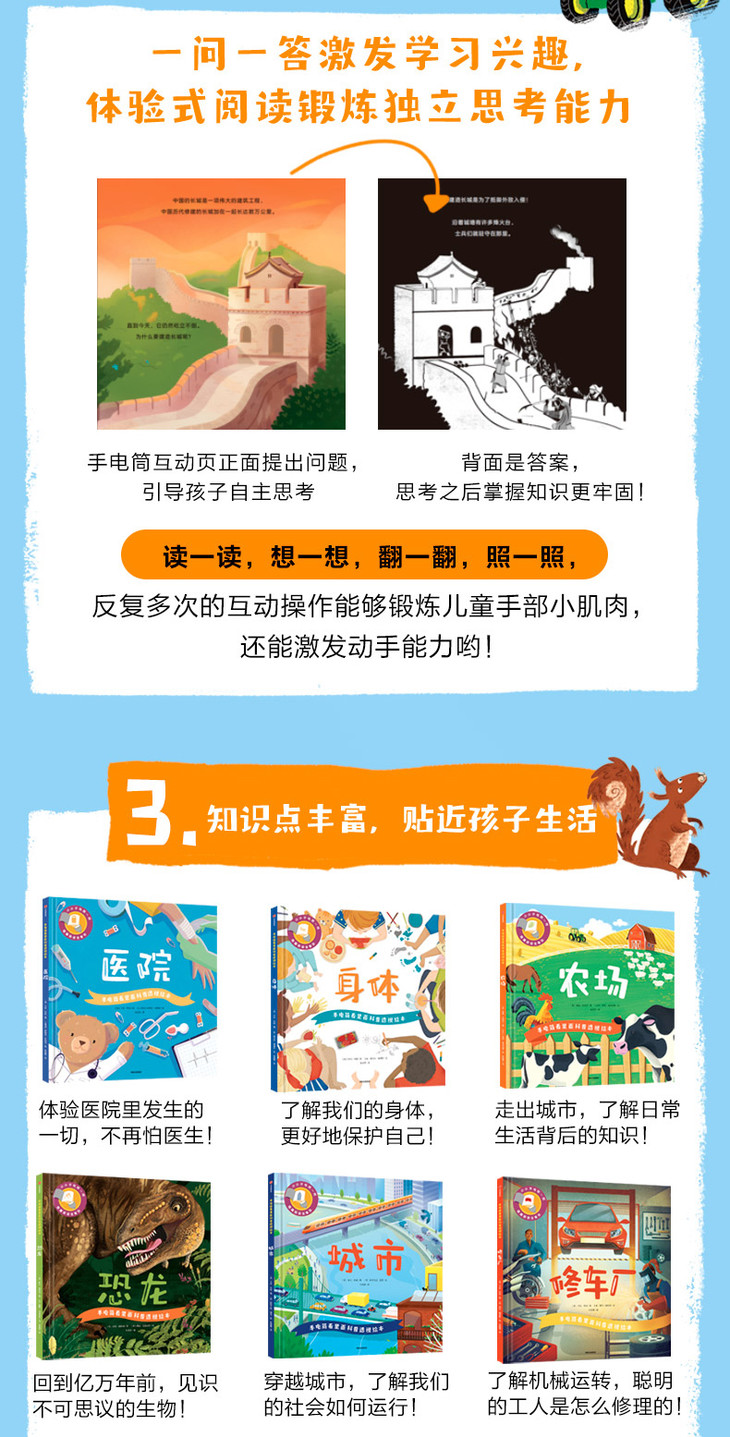 手电筒互动页正面问题、背面答案看到问题想一想,思考之后看答案。“Q&A一问一答”的情景探索式阅读不仅能够在游戏中学得知识;还能够轻松唤起孩子的阅读兴趣,培养独立思考的习惯和能力,激发主动探索的学习精神,挖掘发散性思维,带给家长和孩子新鲜的亲子阅读互动体验。