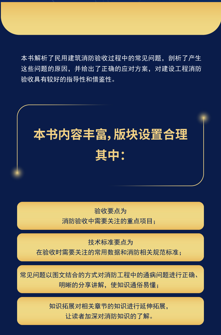 本书解析了民用建筑消防验收过程中的常见问题,剖析了产生这些问题的原因,并给出了正确的应对方案,对建设工程消防验收具有较好的指导性和借鉴性。本书内容丰富,版块设置合理,其中:验收要点为消防验收中需要关注的重点项目;技术标准要点为在验收时需要关注的常用数据和消防相关规范标准;常见问题以图文结合的方式对消防工程中的通病问题进行正确、明晰的分享讲解,使知识通俗易懂;知识拓展对相关章节的知识进行延伸拓展,让读者加深对消防知识的了解。全书文字精简通俗,具有hen强的可读性;同时又附有100多张图片,具有hen强的直观性。全规范+全图解,能够帮助读者在深入了解规范标准的同时,轻松掌握建设工程消防验收的技术要点。