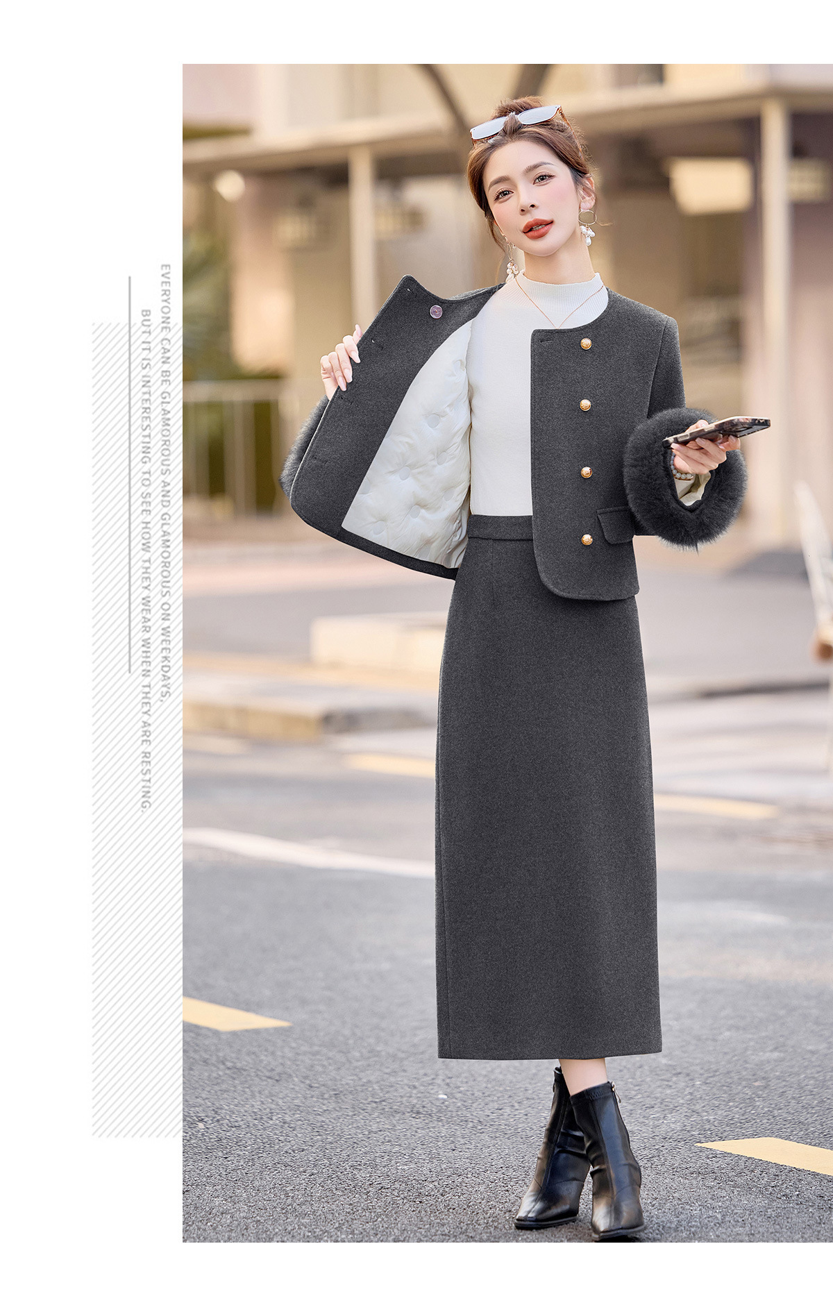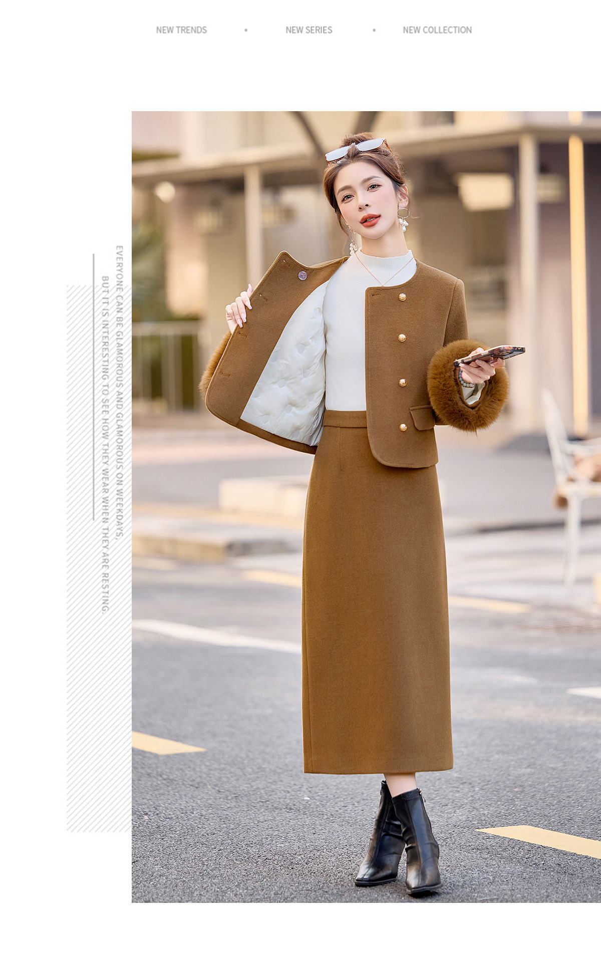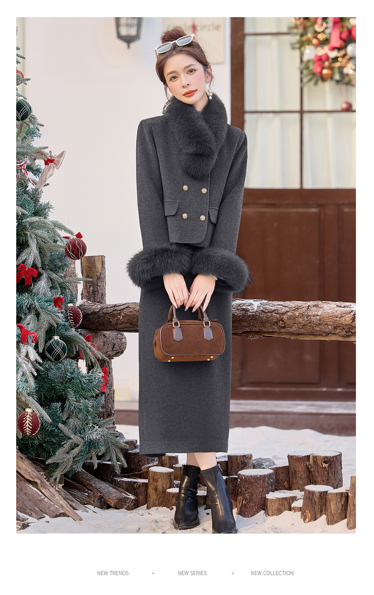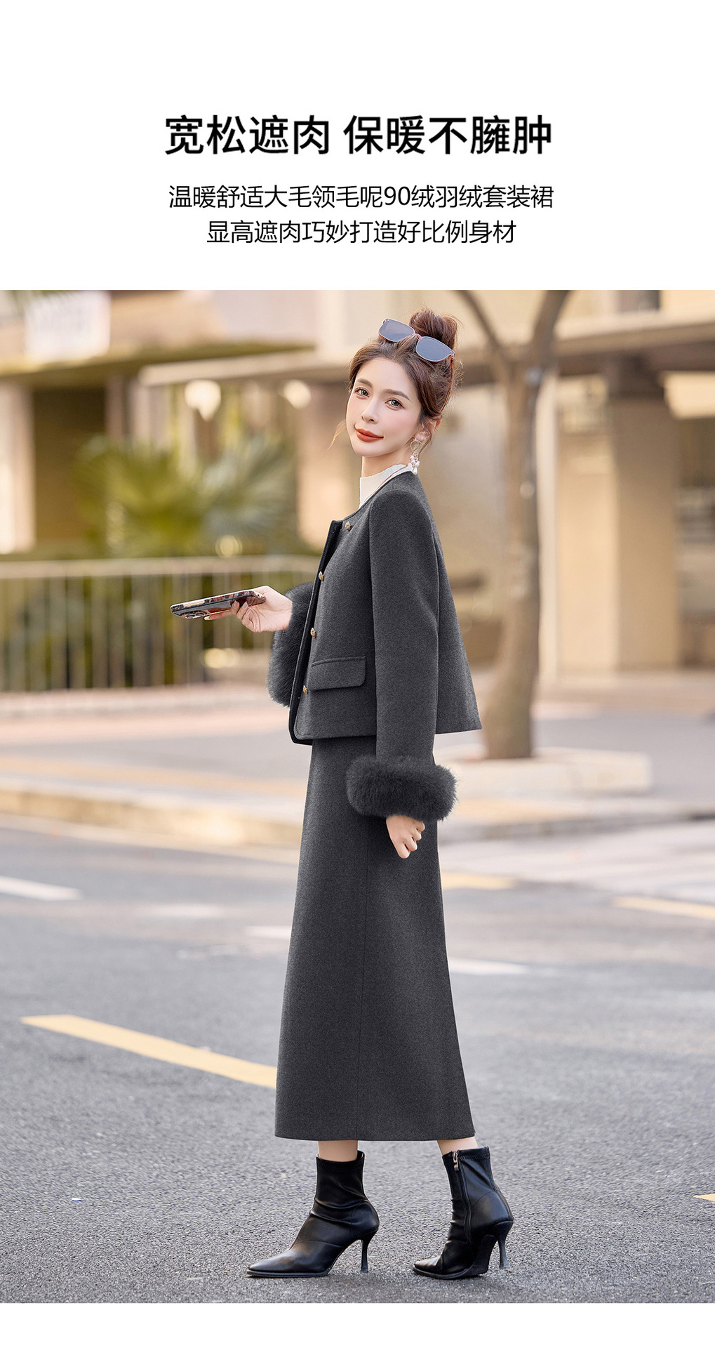 HR ZYQF31小香风套装羽绒服外套配半身裙两件套配真狐狸毛