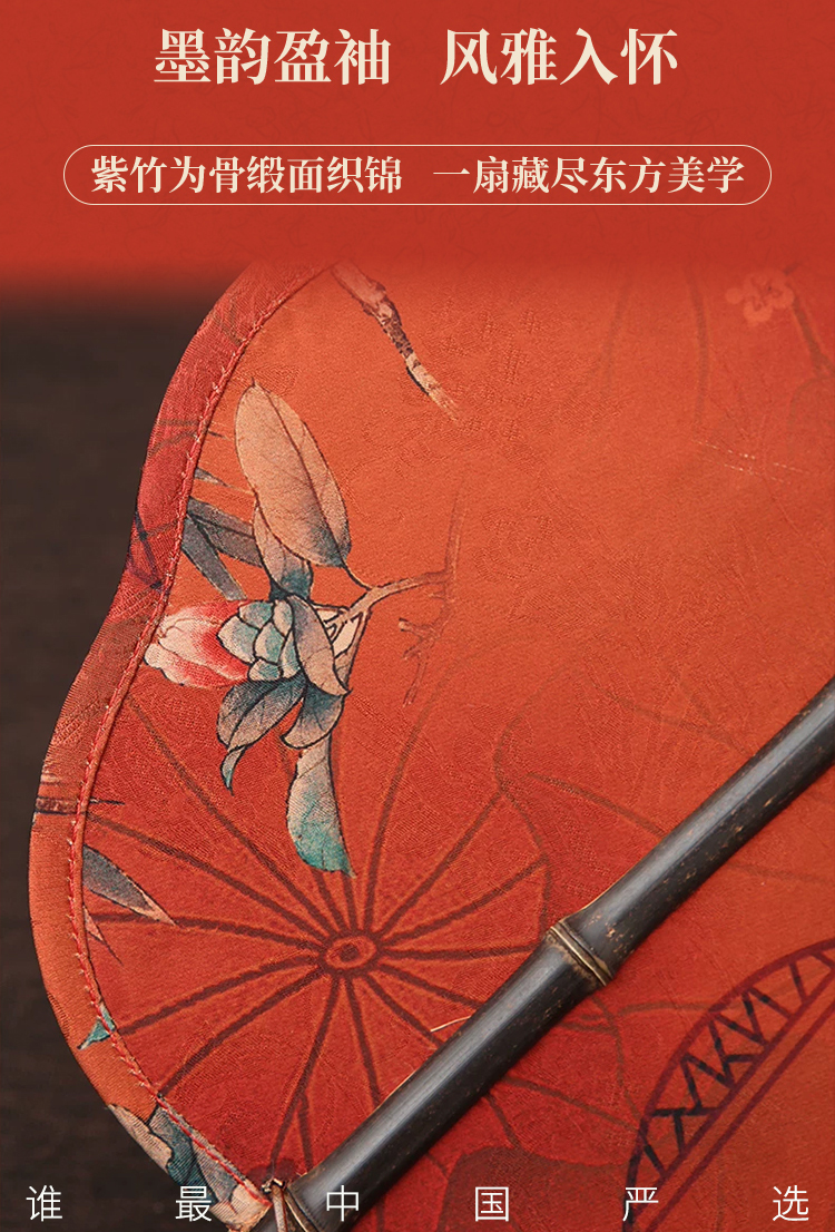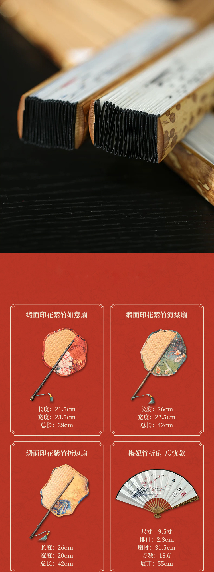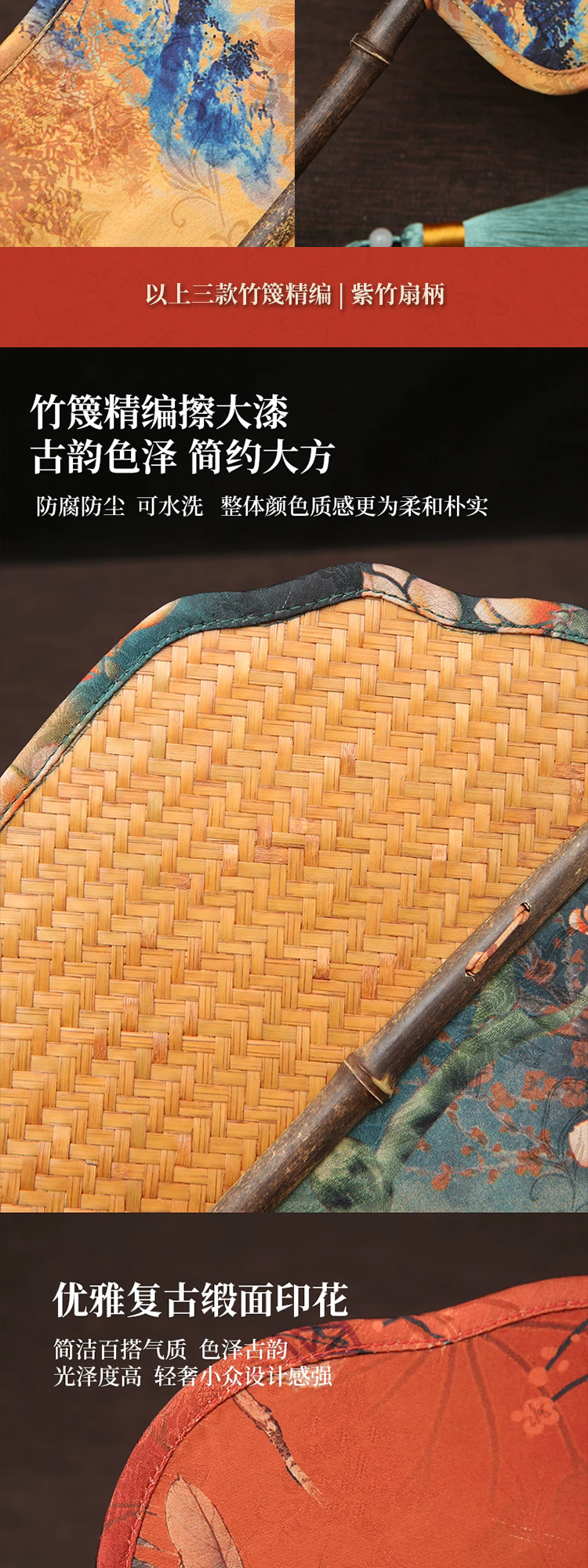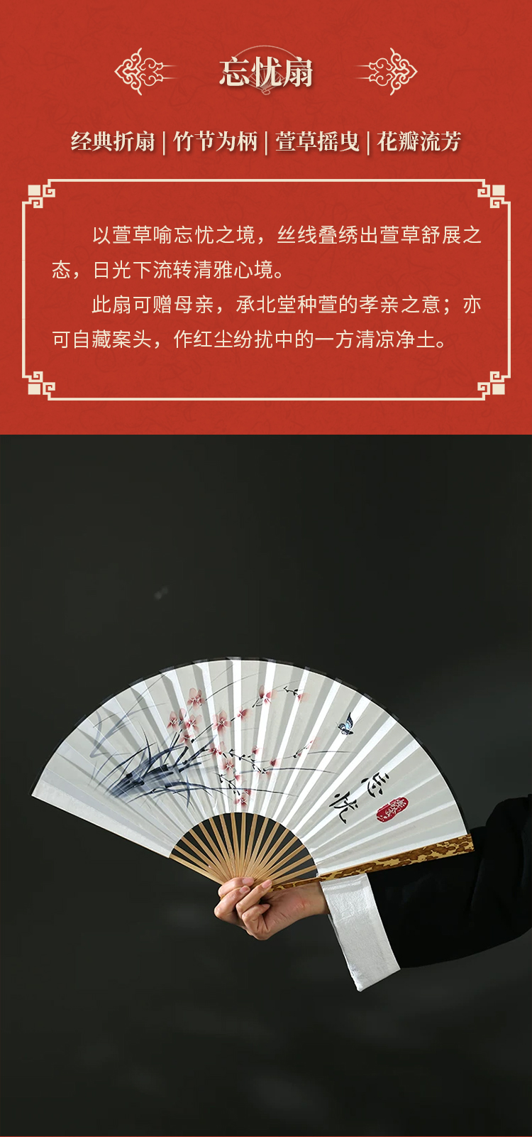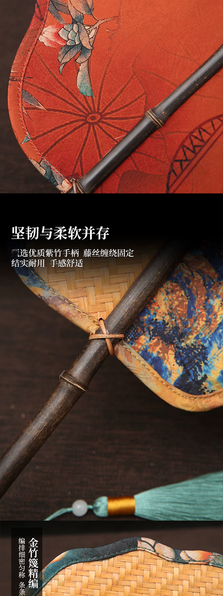 扇子 紫竹为骨缎面织锦 一扇藏尽东方美学 经典折扇 竹节为柄 萱草摇曳 花瓣流芳