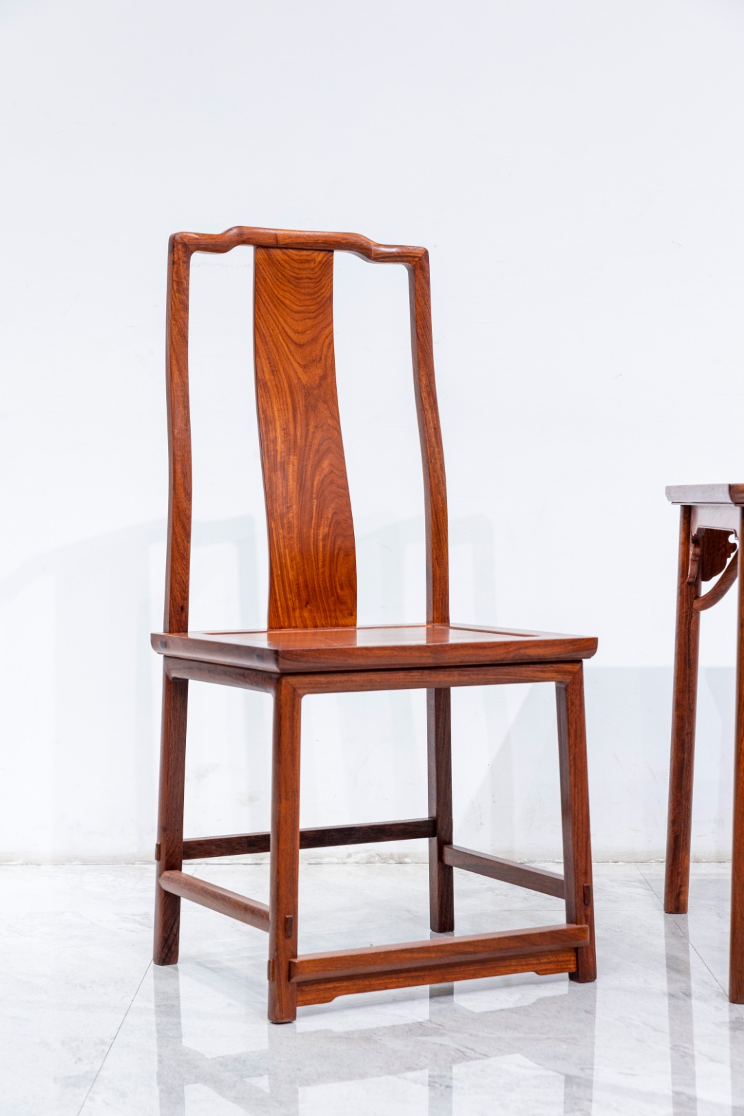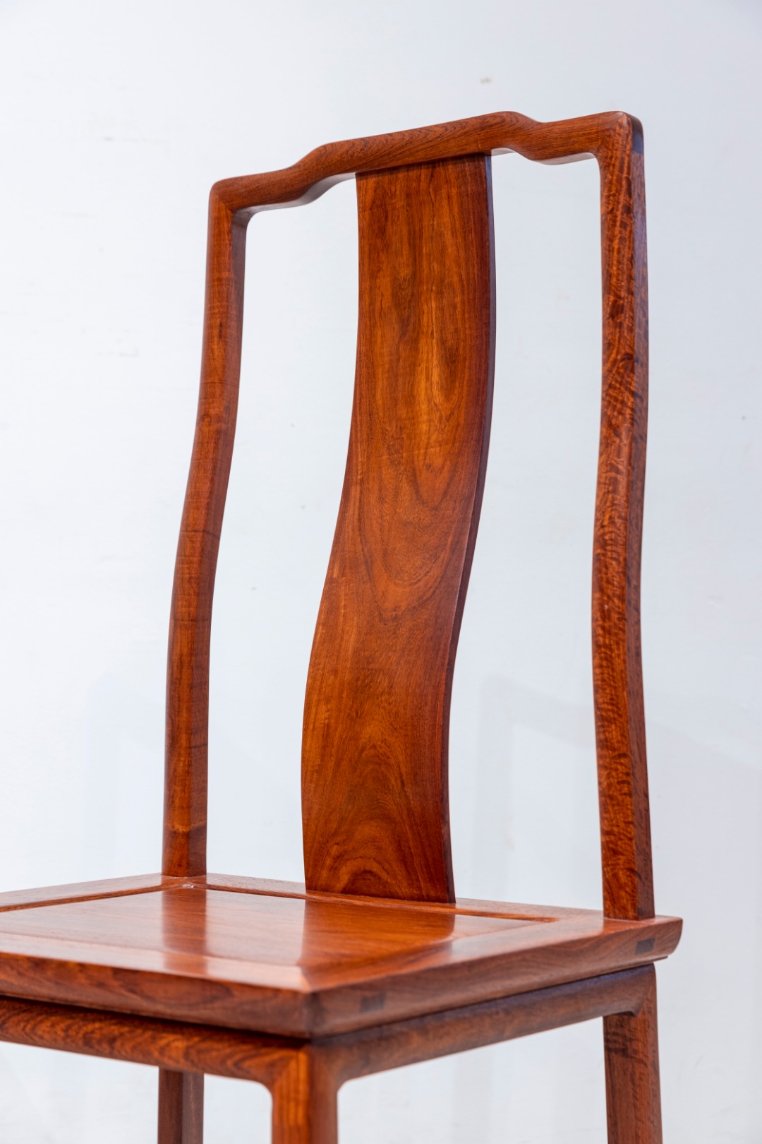 素面 S背 不出头 餐椅:有靠背无扶手即统称为靠背椅,此靠背椅不出头灯挂椅器型,方材倒棱,由上至下,搭脑中弯,削出内凹枕靠,兜转自然,形态如牛头式,两端下沉,与一木连做的后腿联结,后腿上截三弯明显,靠背板也呈S形,上窄下宽,是传统造法。