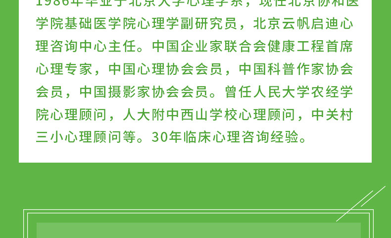 1986年毕业于北京大学心理学系,现任北京协和医学院基础医学院心理学副研究员,北京云帆启迪心理咨询中心主任。中国企业家联合会健康工程首席心理专家,中国心理协会会员,中国科普作家协会会员,中国摄影家协会会员。曾任人民大学农经学院心理顾问,人大附中西山学校心理顾问,中关村三小心理顾问等。30年临床心理咨询经验。"