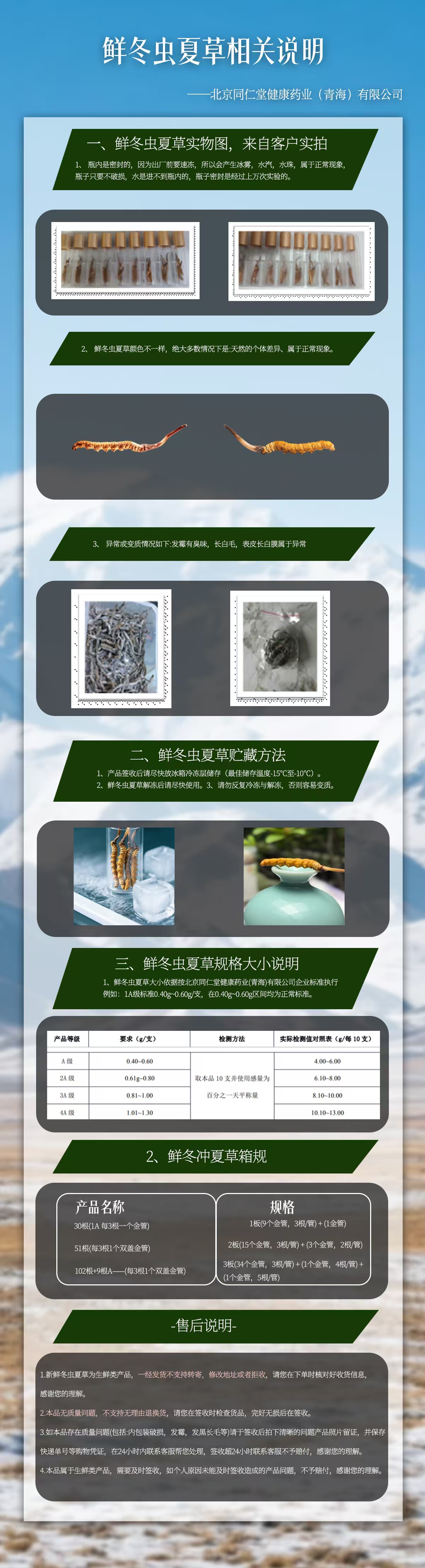 1.新鲜冬虫夏草为生鲜类产品,一经发货不支持转寄,修改地址或者拒收,请您在下单时核对好收货信息,感谢您的理解。