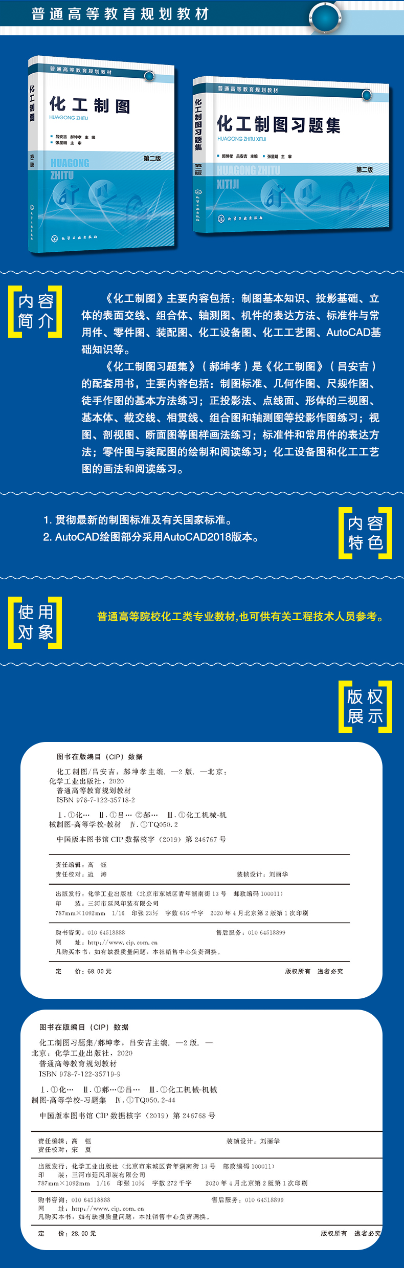 ,结构体系与配套教材《化工制图》第二版保持一致。 本习题集可作为普通高等院校、高职高专化工类专业教材,也可供相关工程技术人员参考。