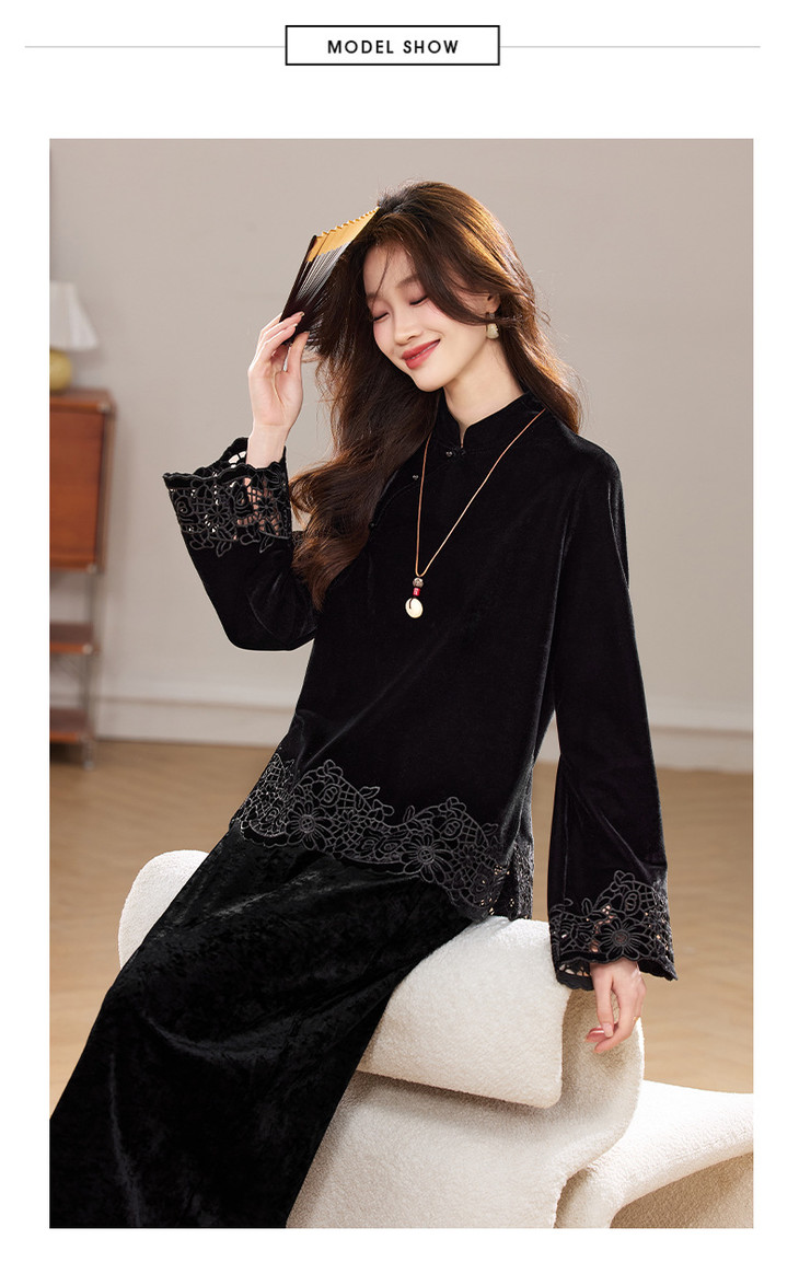 新款加厚丝绒小立领新中式镂空花真毛洋气显瘦气质两件套裙YBER630 商品图3