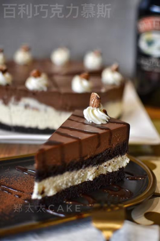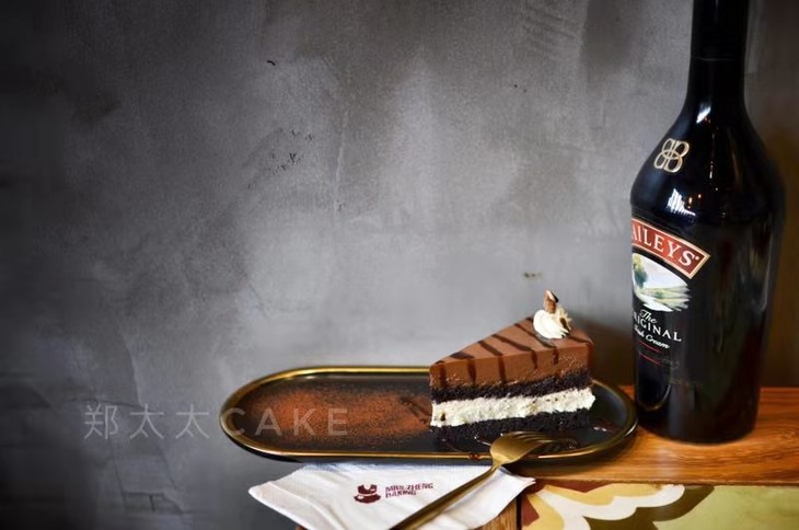 一层巧克力戚风一层添加了百利甜酒的奶酪慕斯,最上面的巧克力慕斯层选用了甜度微苦的65%可可含量黑巧克力与动物奶油结合制作的,中间也添加了少许朗姆酒增添风味,整体口感绵密醇香。