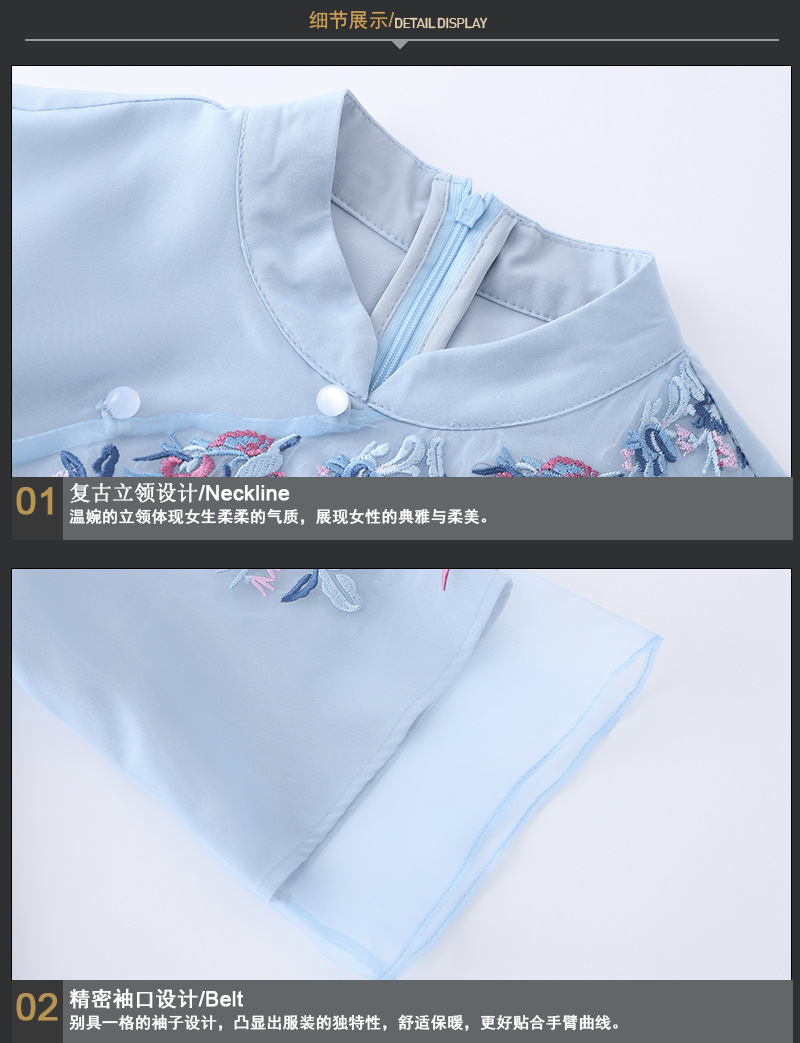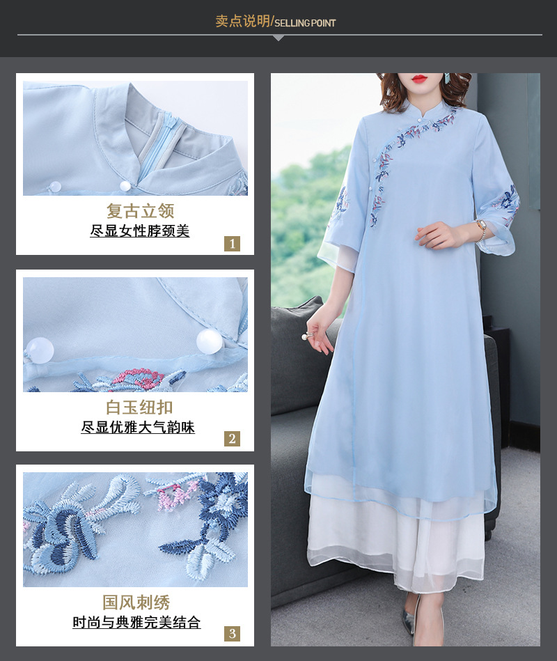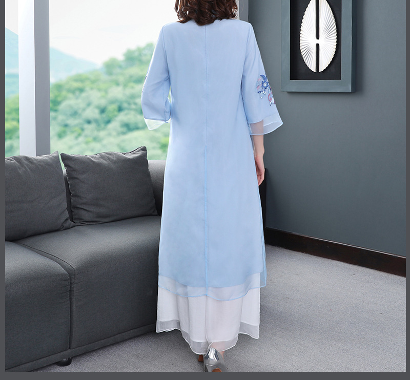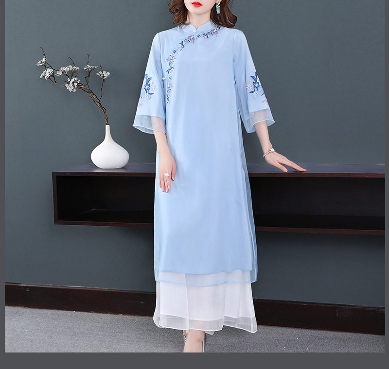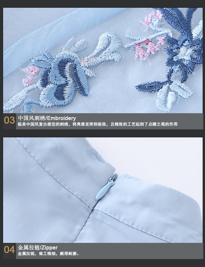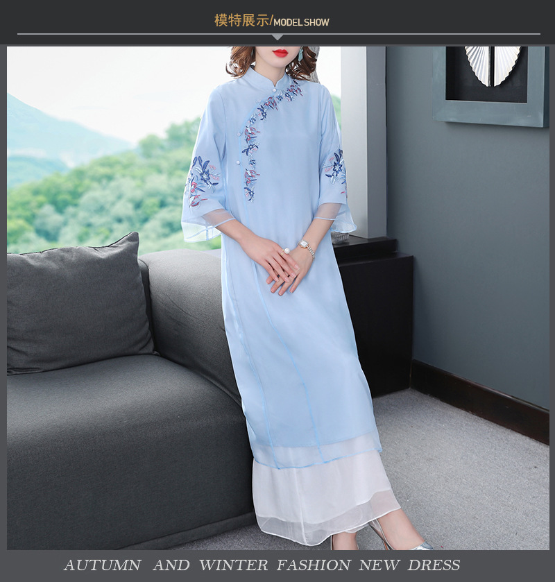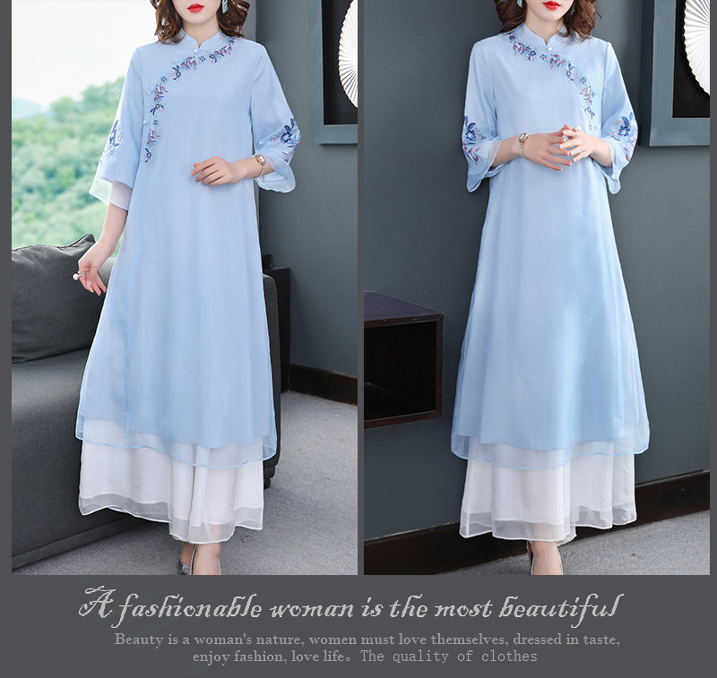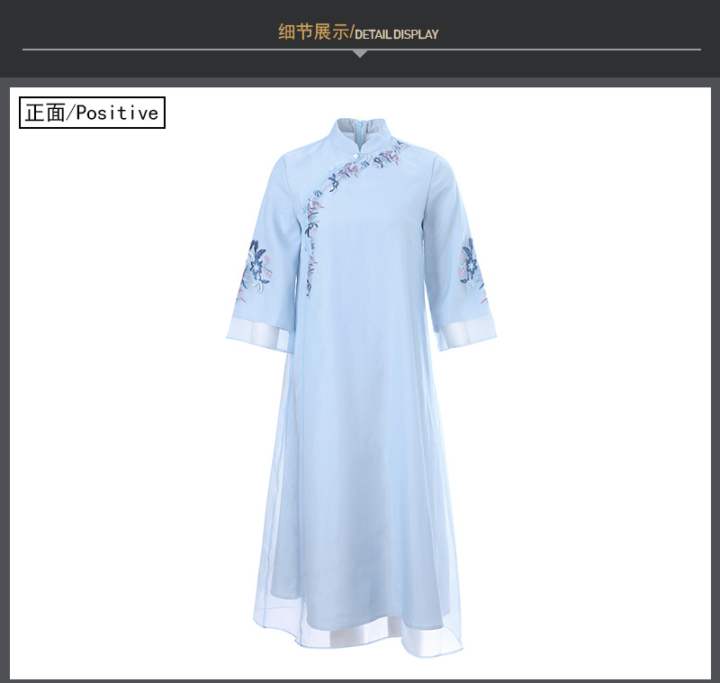 THX-020104017新款女神范高腰宽松复古中国风七分袖立领刺绣连衣裙
