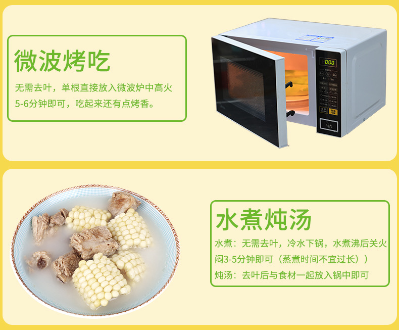 1、 生食 最能感受香甜多汁口感更佳 2、沙拉 生收玉米搭生菜水果皆可轻食族更爱3、 熟食 软嫩香甜,妈妈宝宝副食品更佳选择。4、微波 无须去叶功率700W的微波5分钟即可。5、水煮 玉米入水煮滚关火闷3分钟即可。6、焖蒸 含叶电锅蒸煮5分钟锁住甜份,风味奇佳。