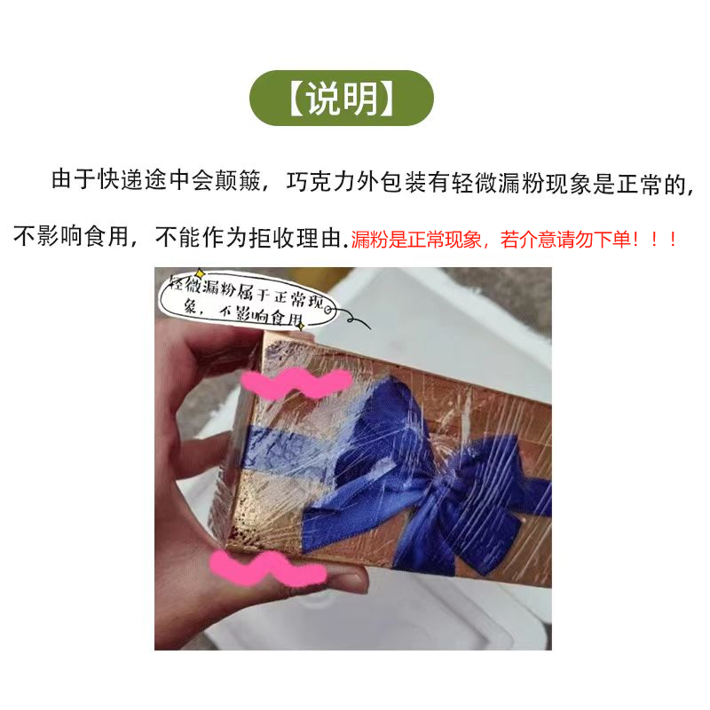 5、由于快递途中会颠簸,巧克力外包装有轻微漏粉现象是正常的不影响食用,不能作为拒收理由,介意慎拍!!!
