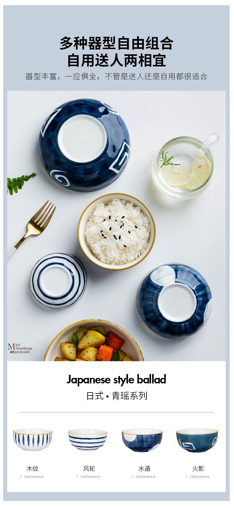 摩登主妇青瑶日式釉下彩饭碗沙拉碗陶瓷套装家用单个味碟汤碗面碗