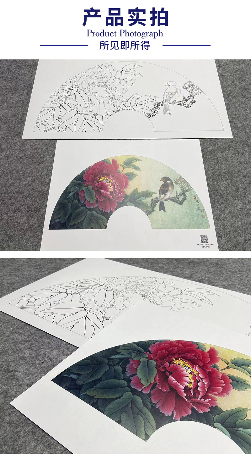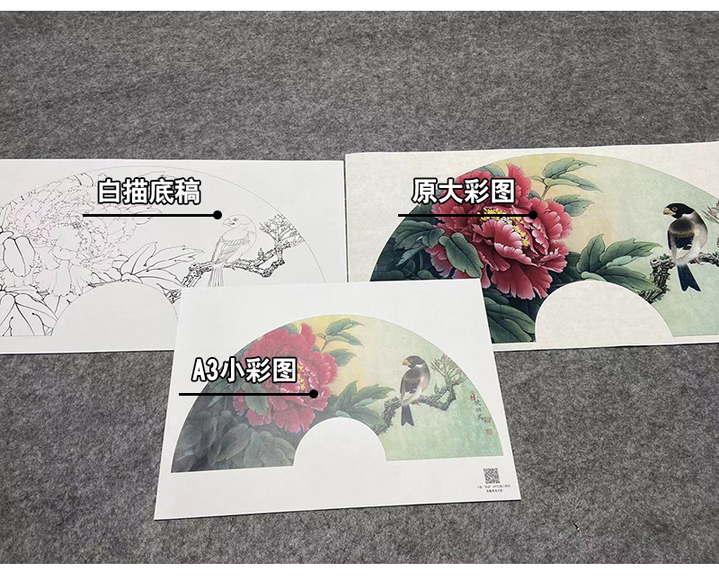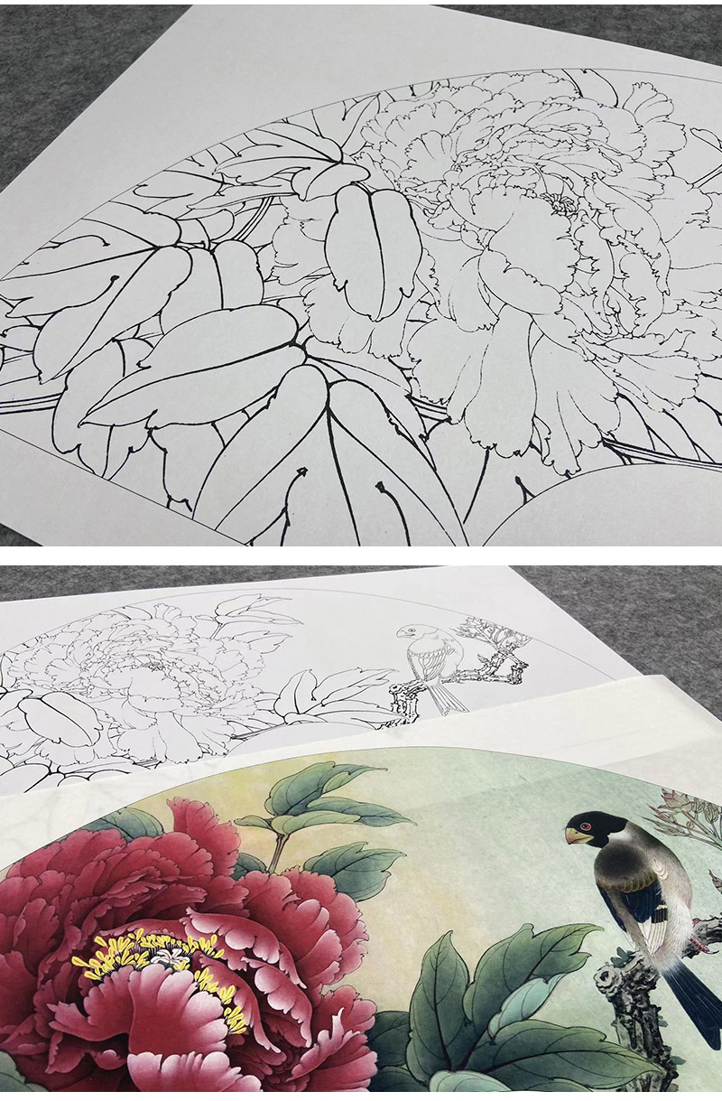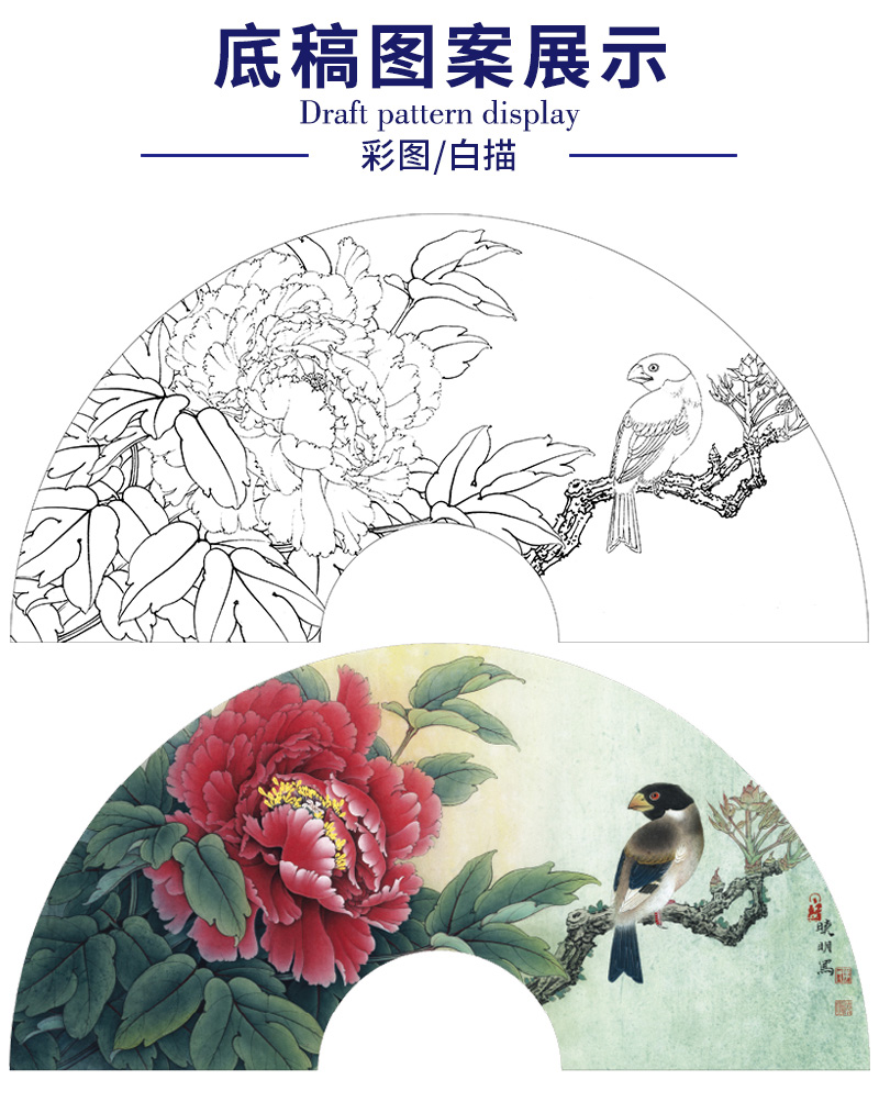 【大彩图】李晓明工笔画白描底稿扇面小品《蜡嘴小胡红》牡丹临摹勾线花鸟线稿K005